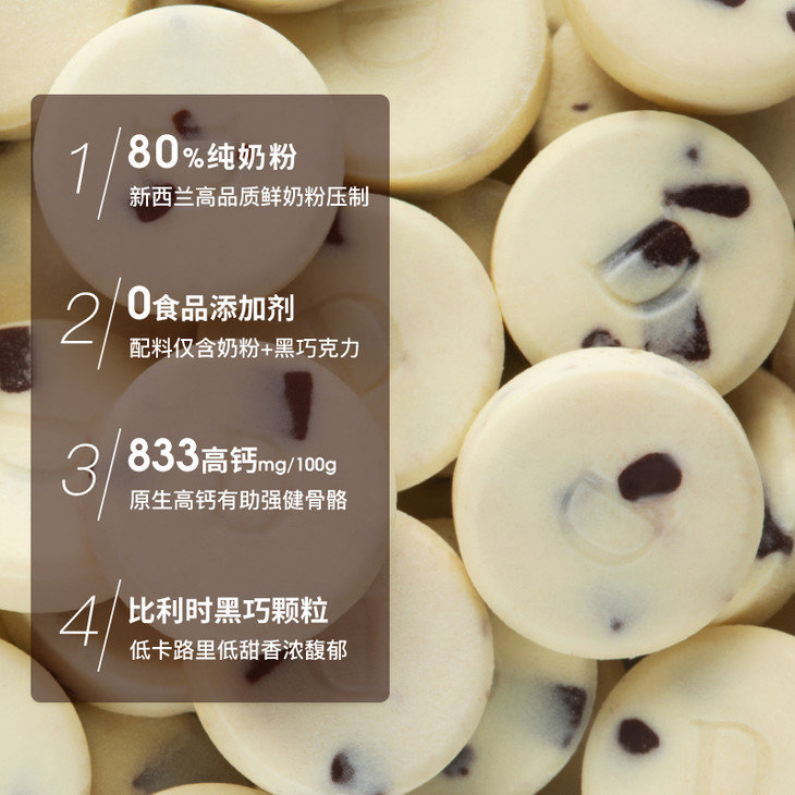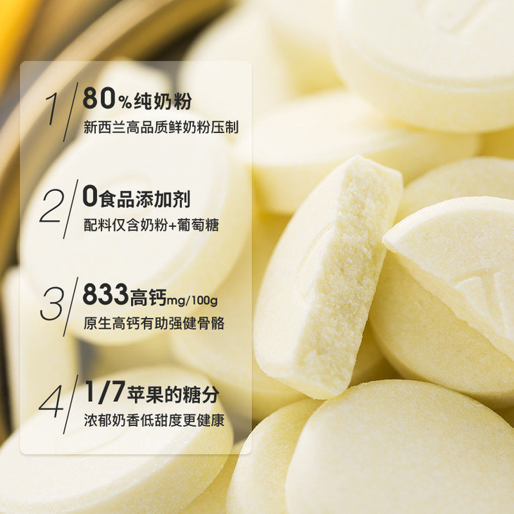 因为奶片里含有80%的高钙奶粉,每100g奶片含有833mg天然乳钙,还有优质的蛋白质和营养元素,同时易于吸收,一袋就能满足一天所需的钙量,我也正是吃激素药还需要补钙的阶段,真是刚刚好!