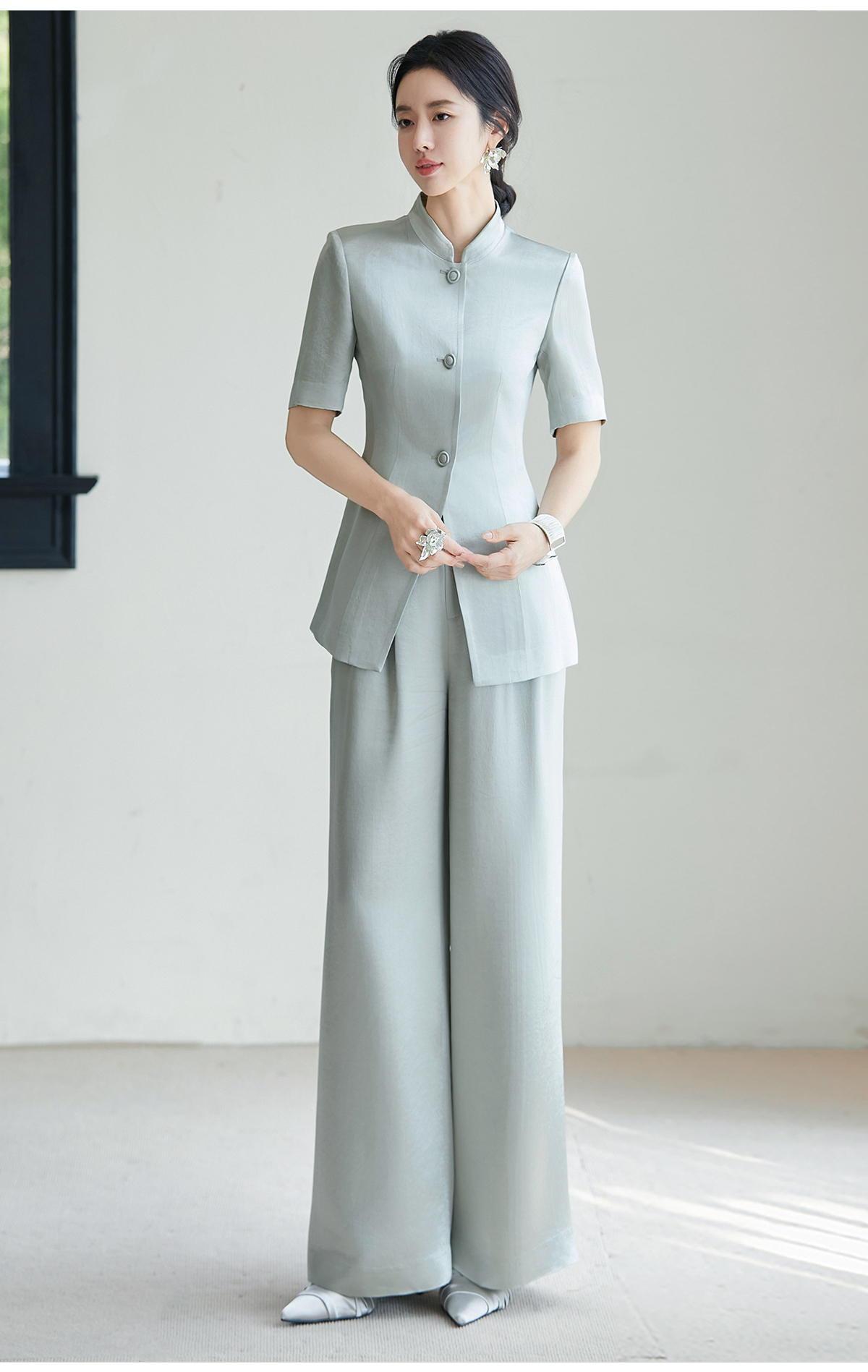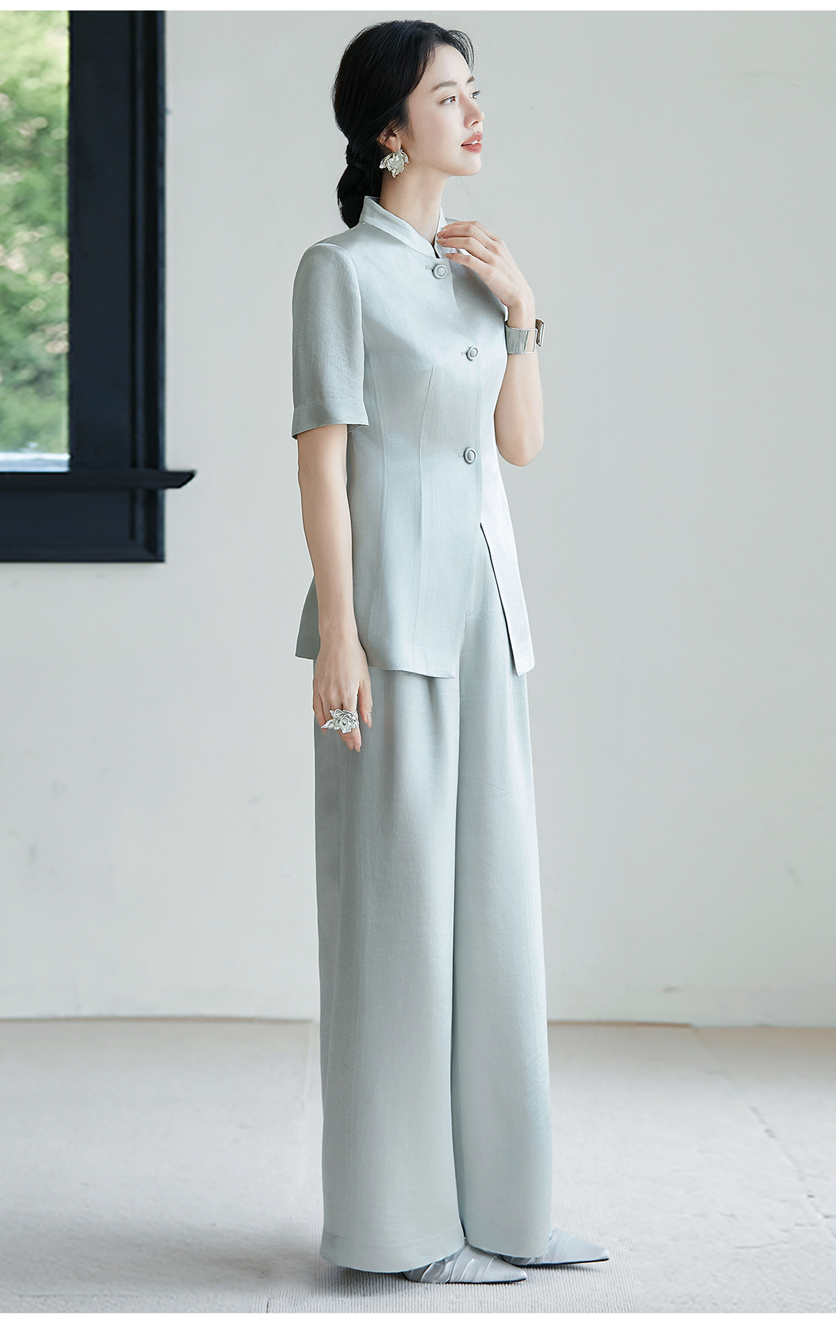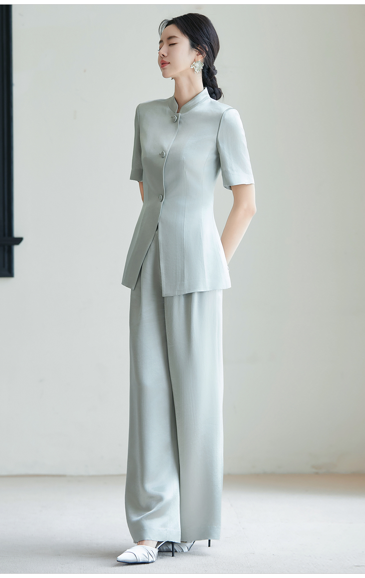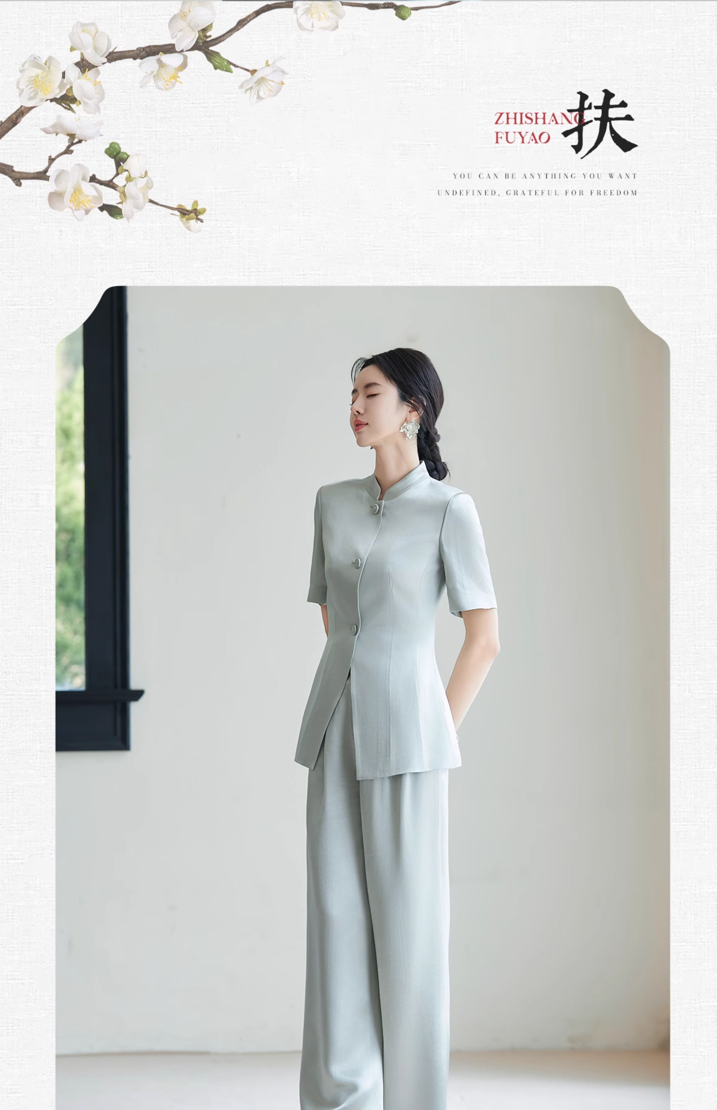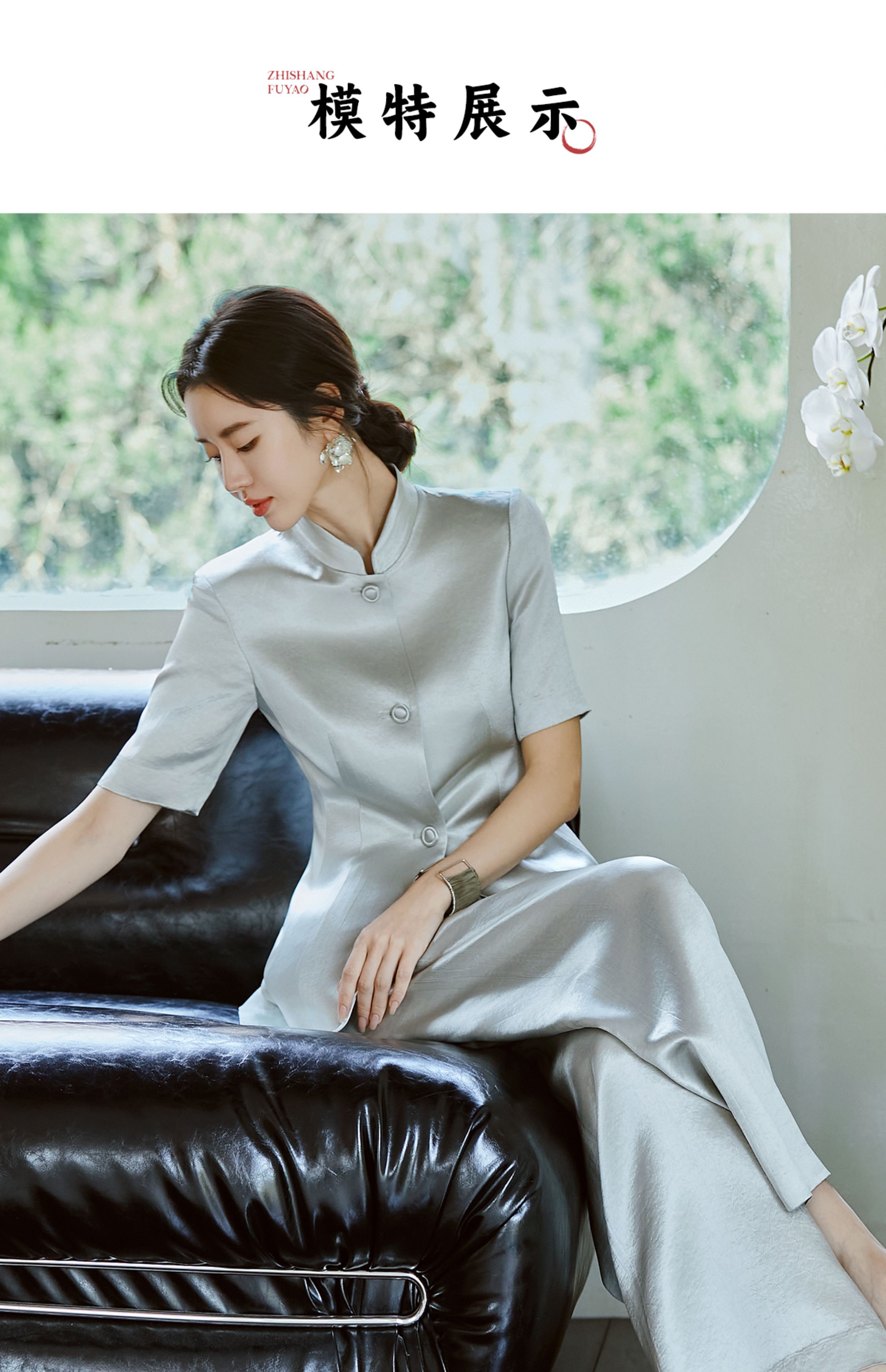 FUYAO扶摇 新中式国风套装女夏新款重磅醋酸立领西装直筒裤两件套