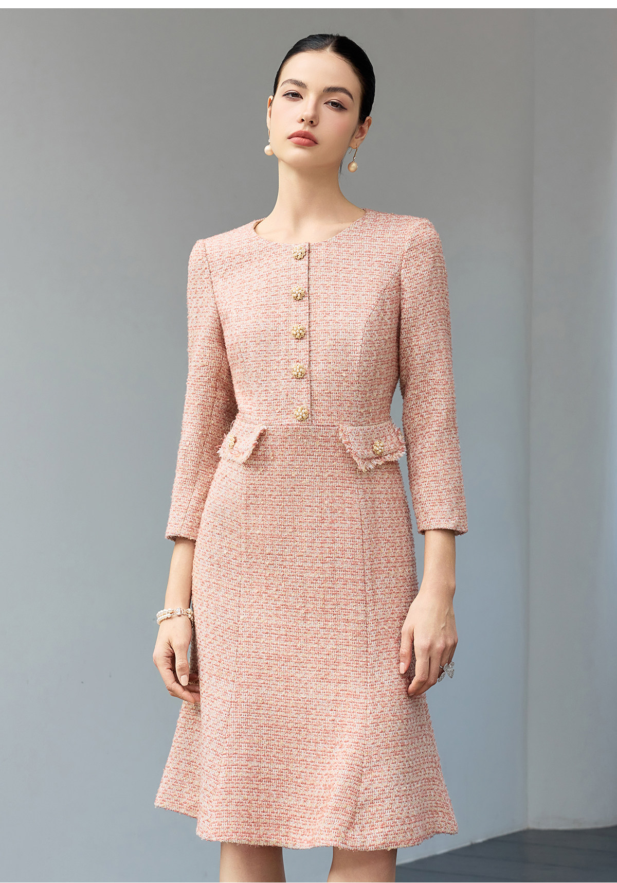 艾尚臣柔焦滤镜小香风粗花呢连衣裙女收腰鱼尾裙摆中长裙气质裙 商品图0