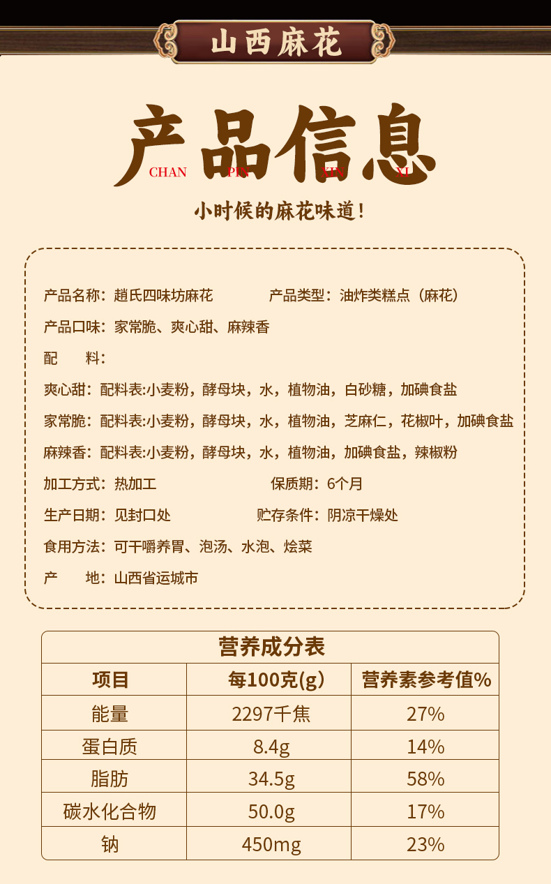 【品名】赵氏四味坊麻花 手工制作 酥脆醇香 色泽金黄 营养丰富 3种口味 【规格】 原味110g*3袋 甜味120g*3袋 麻辣味120g*3袋 原味110g*1袋+甜味120g*1袋+麻辣味120g*1袋 【产地】国内 【保质期】6个月 【发货包装】独立包装 【发货地】山东 【发货快递】圆通 【不发货区域】新疆、西藏、青海、海南、港澳台 【发货时效】48-72小时,周末节假日顺延 |