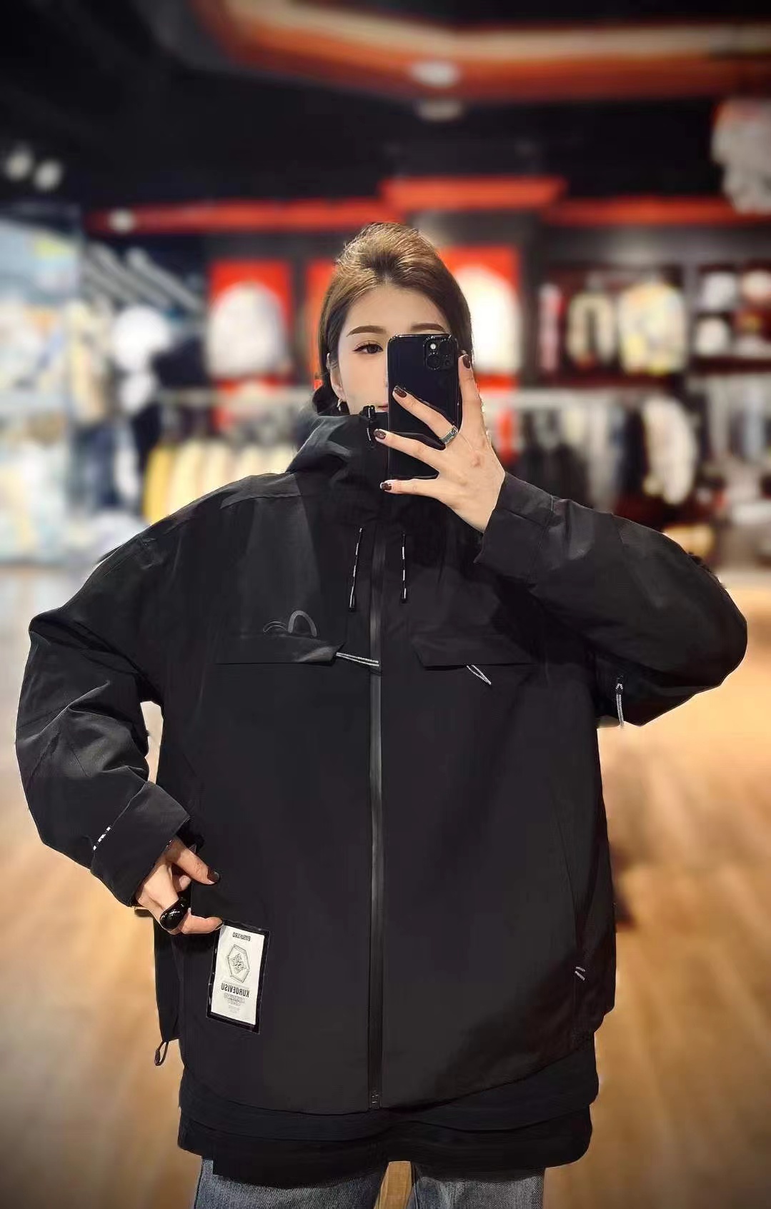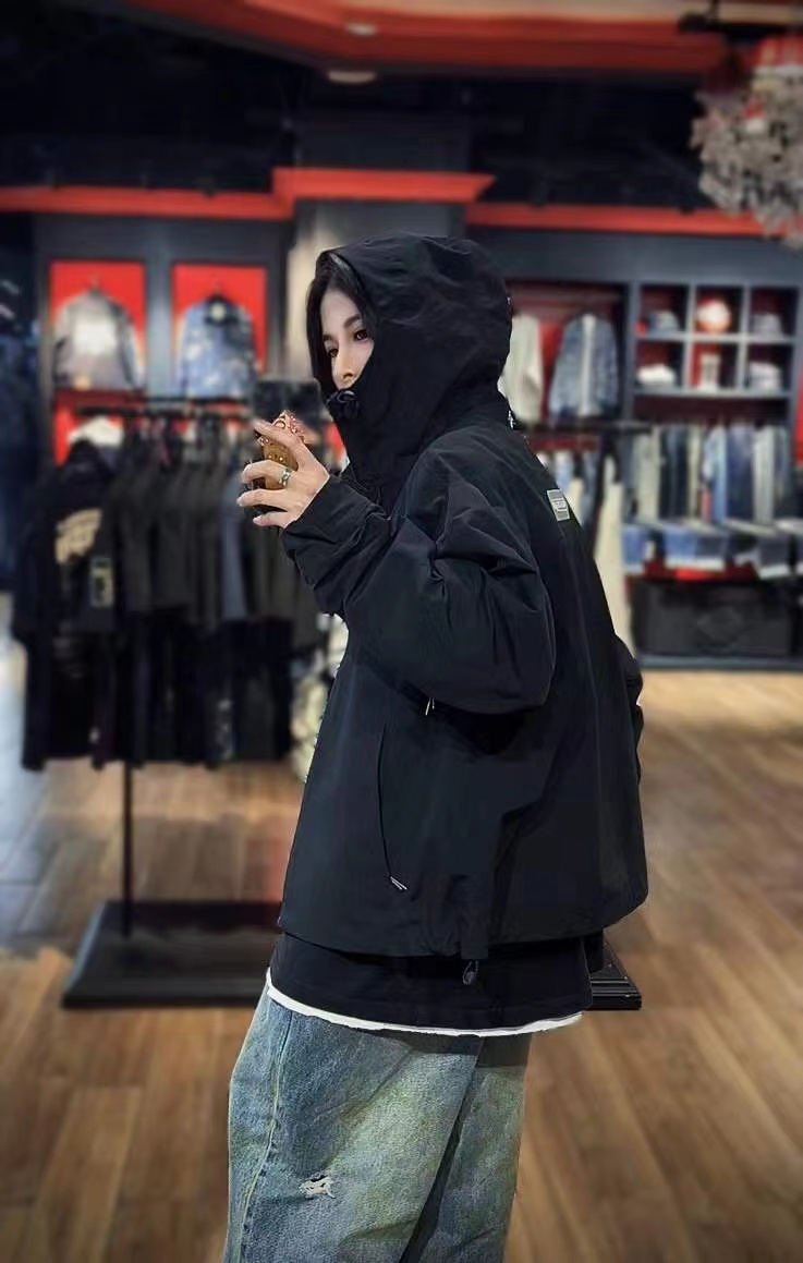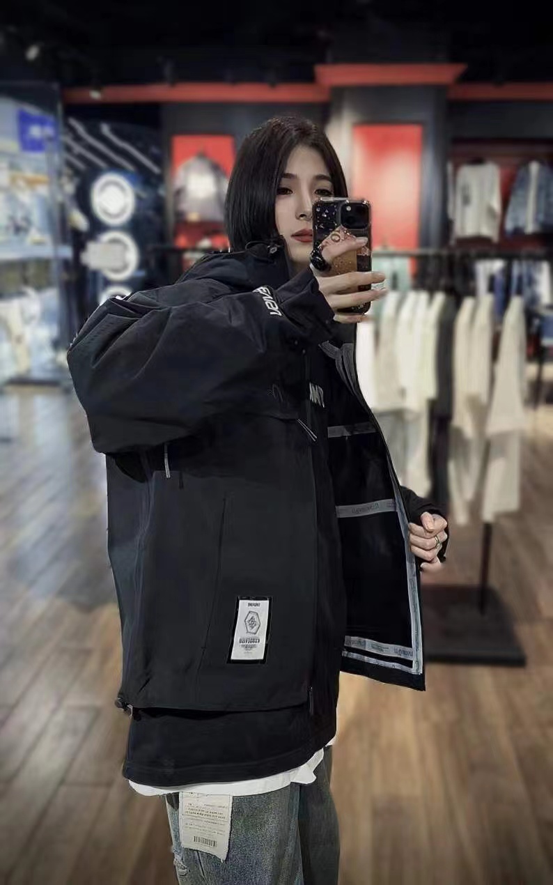 这款冲锋衣酷感升级,冲锋衣与街头工装风相结合,前胸与后背装饰标更凸显品牌风格(醉大穿230斤)