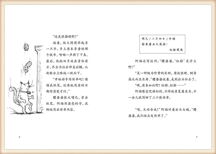阿福深深地叹了口气:“没错,我想樱婆婆既小气,又不擅长和人交际……但即使是妖怪,只要乖乖付钱,樱婆婆应该也不会感到害怕,而是愿意把东西卖给他们才对。我很早以前就特别希望有间妖怪药局。真的很对不起,青鬼出现的时候,一定吓到您了。不过,现在真的有很多妖怪非常需要樱婆婆您……”