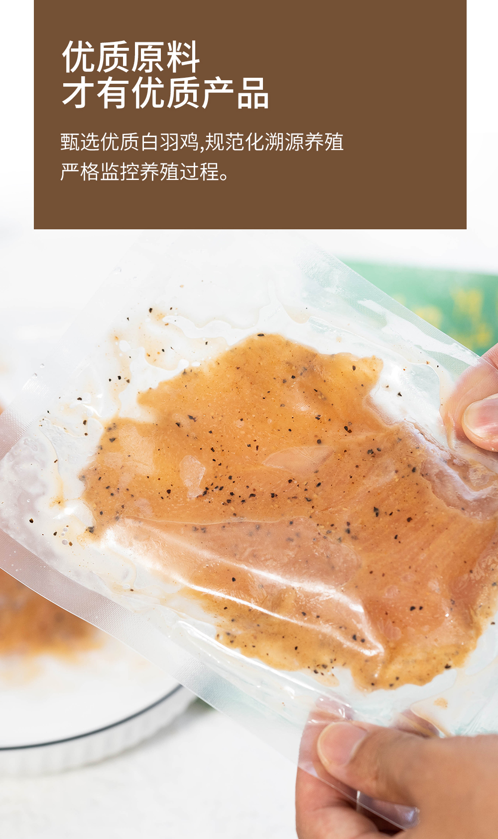 【配料表】鸡胸肉、饮用水、白砂糖、淀粉、食用盐、大豆分离蛋白、黑胡椒碎、胡椒粉、味精、食品添加剂(木瓜蛋白酶)