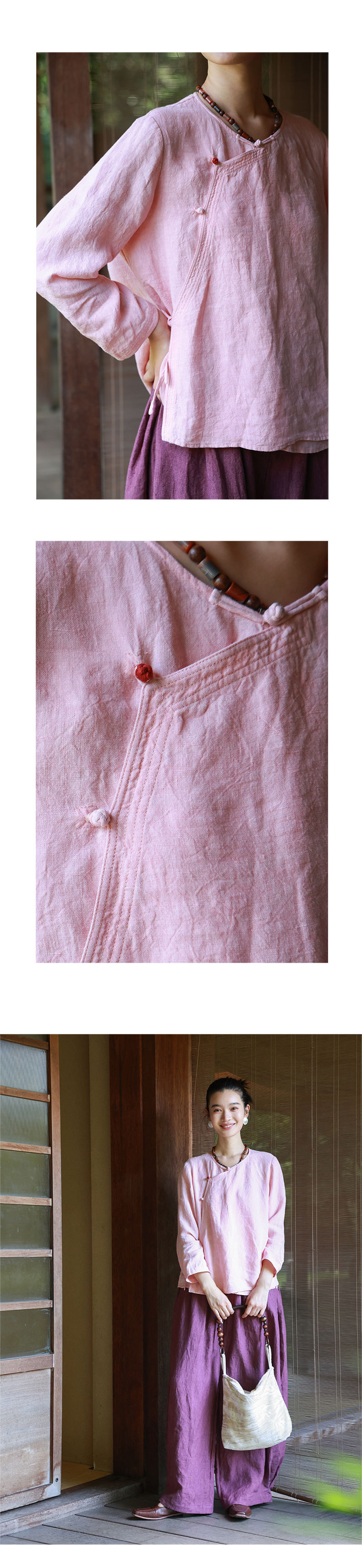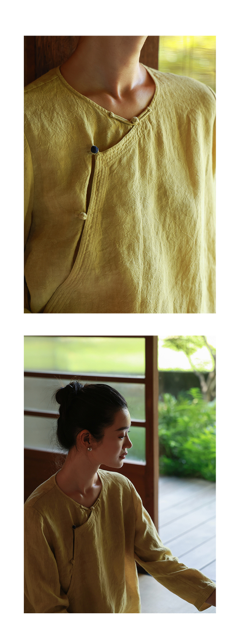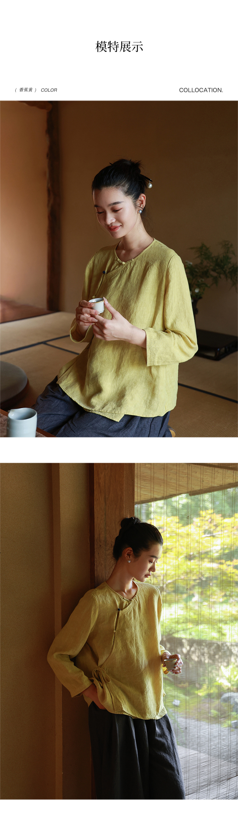 绽放女装514朵/墨染工艺亚麻新中式斜襟正常肩简约长袖衬衫女秋季