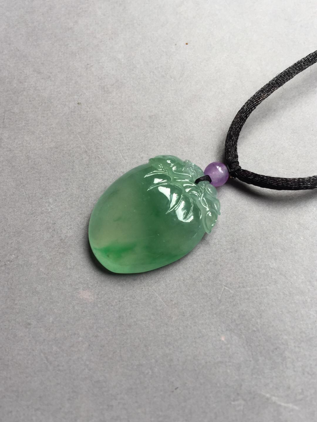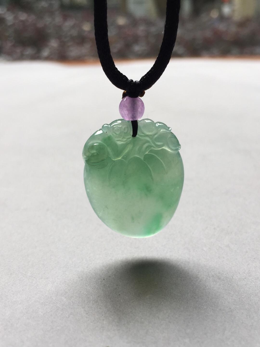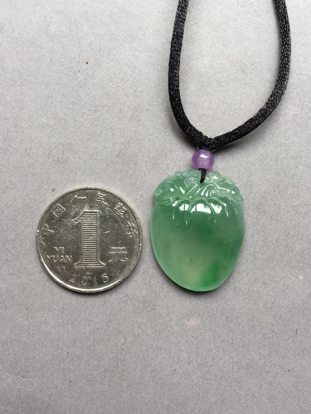 收藏级别翡翠,现在市面上很难见到规格这么好的阳绿大桃子,高冰种晴水飘阳绿仙桃,28.6*21.9*7.6mm。满足你对精品宝贝的各种要求,圆润,厚实,种水好,起荧光,飘阳绿,手工精雕。为什么玩翡翠的高手都喜欢收桃子。因为桃子造型可爱,饱满富贵,大片的光面无雕能突出翡翠独特的种水魅力。雕刻小猴还有灵猴献寿的美好寓意,精品推荐