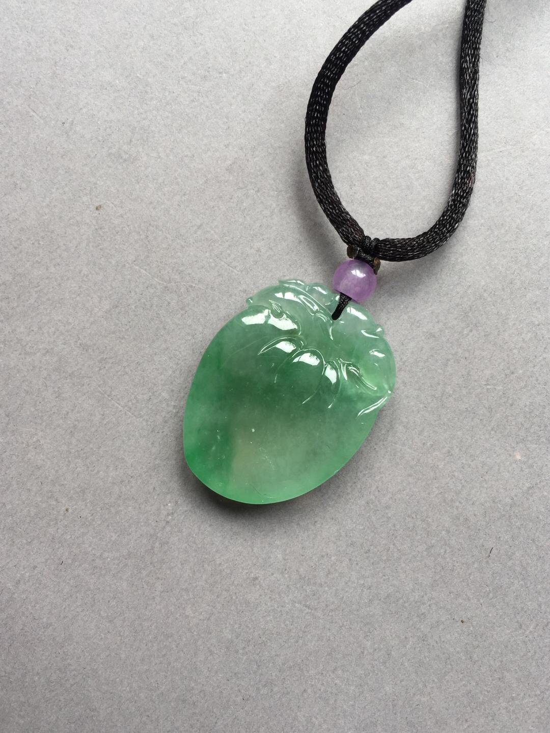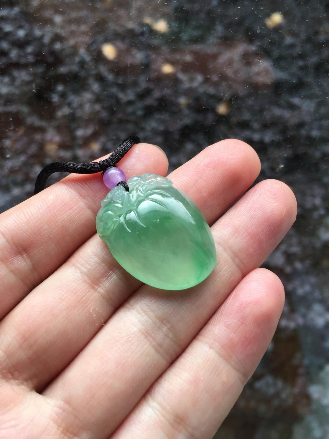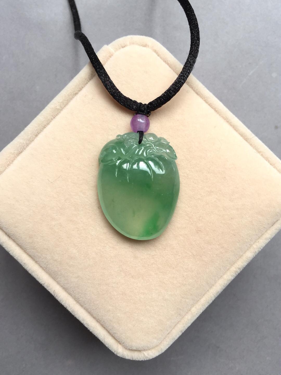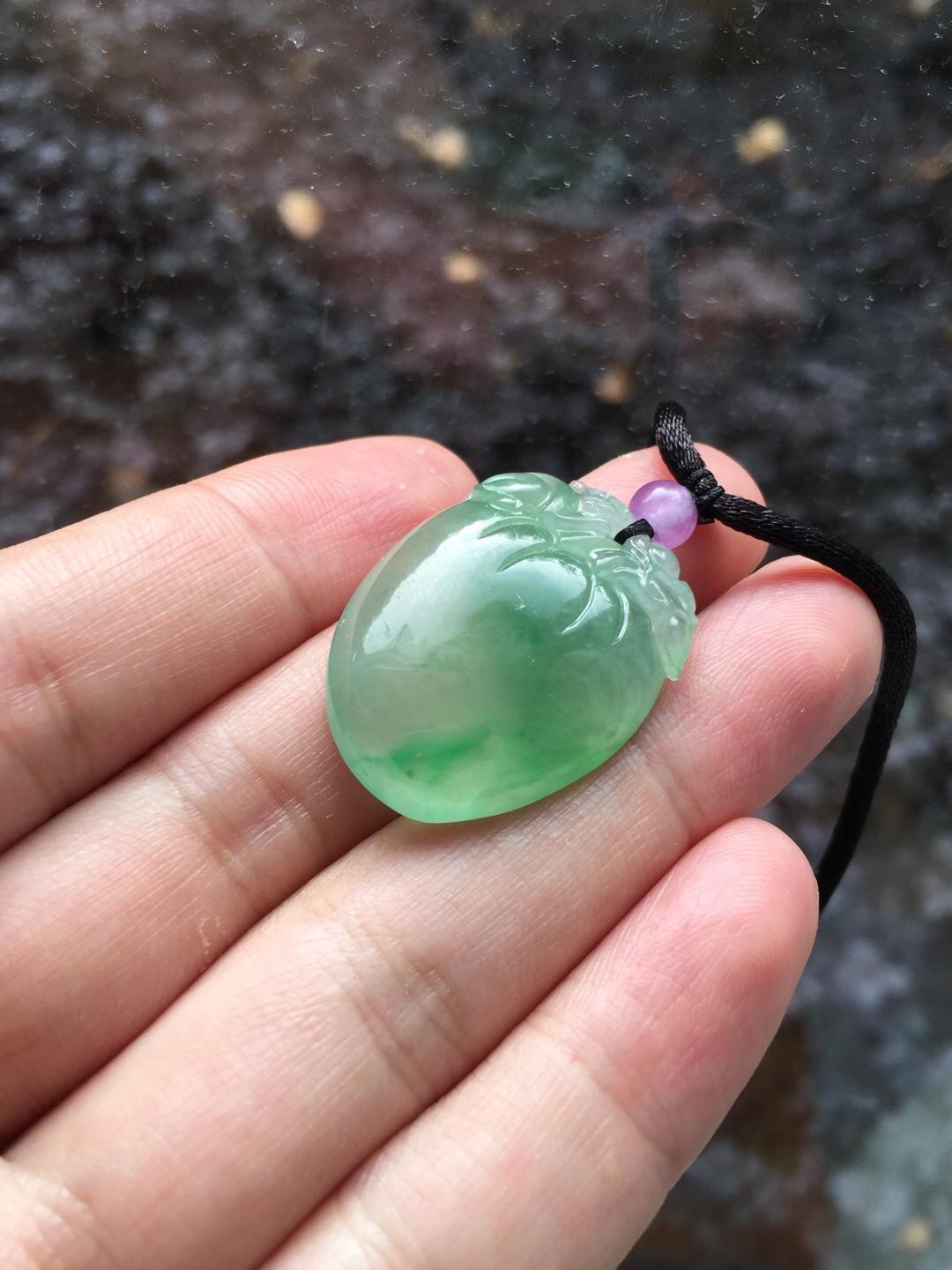 收藏级别翡翠,现在市面上很难见到规格这么好的阳绿大桃子,高冰种晴水飘阳绿仙桃,28.6*21.9*7.6mm。满足你对精品宝贝的各种要求,圆润,厚实,种水好,起荧光,飘阳绿,手工精雕。为什么玩翡翠的高手都喜欢收桃子。因为桃子造型可爱,饱满富贵,大片的光面无雕能突出翡翠独特的种水魅力。雕刻小猴还有灵猴献寿的美好寓意,精品推荐