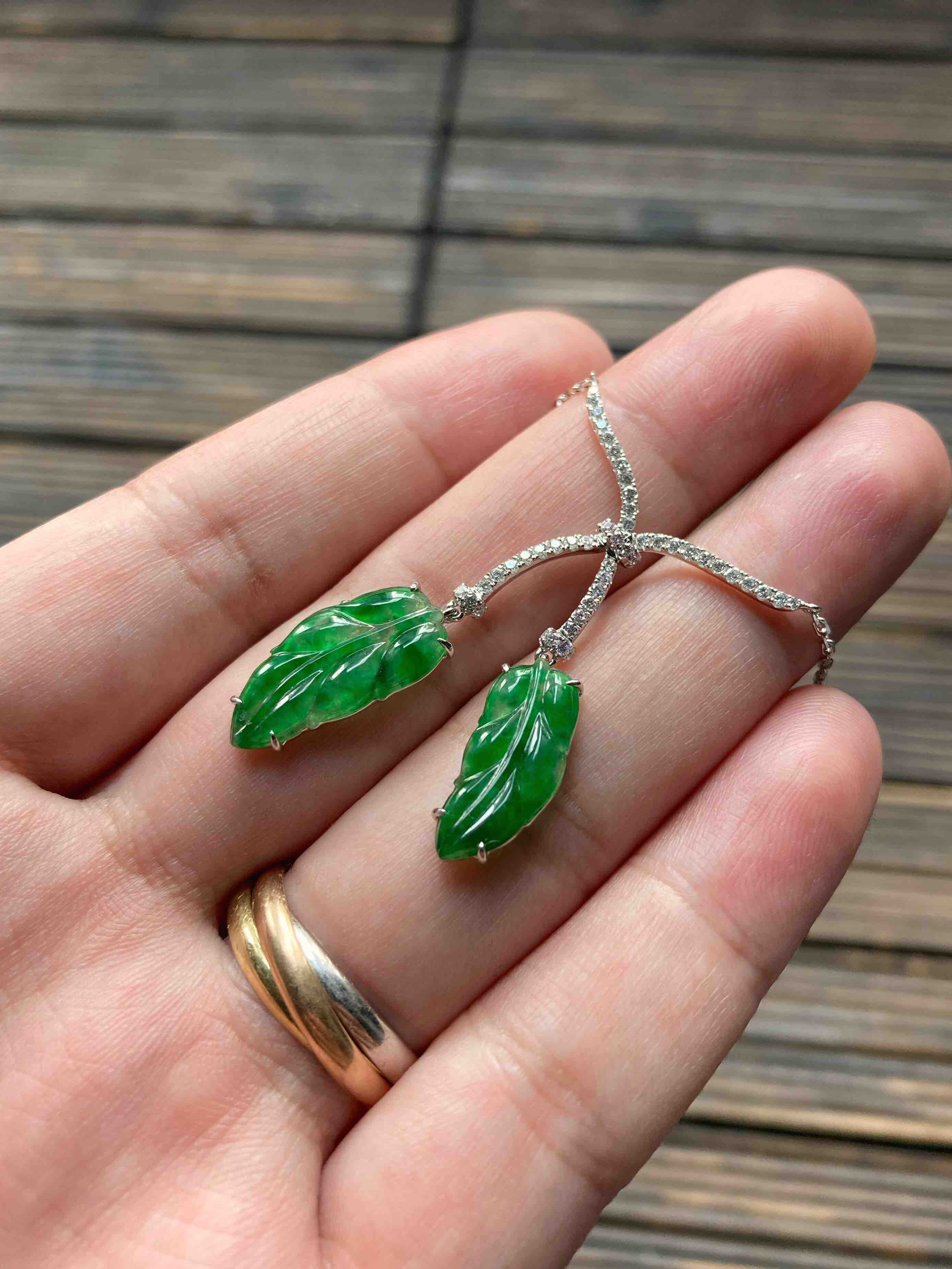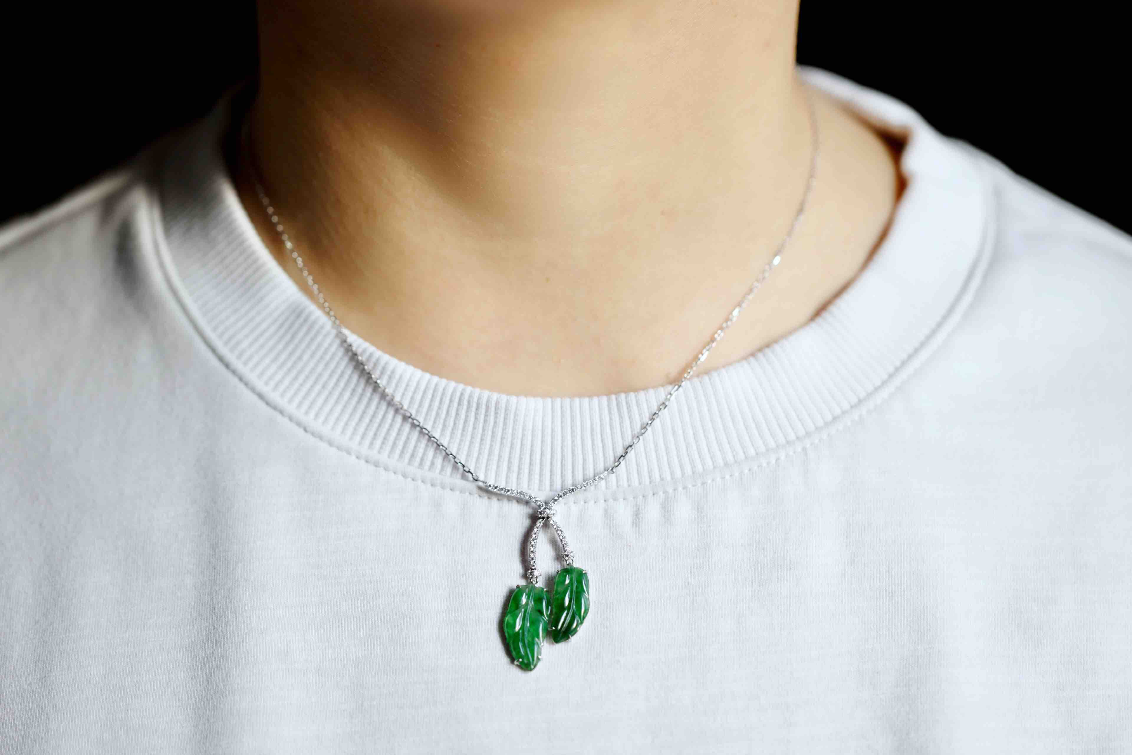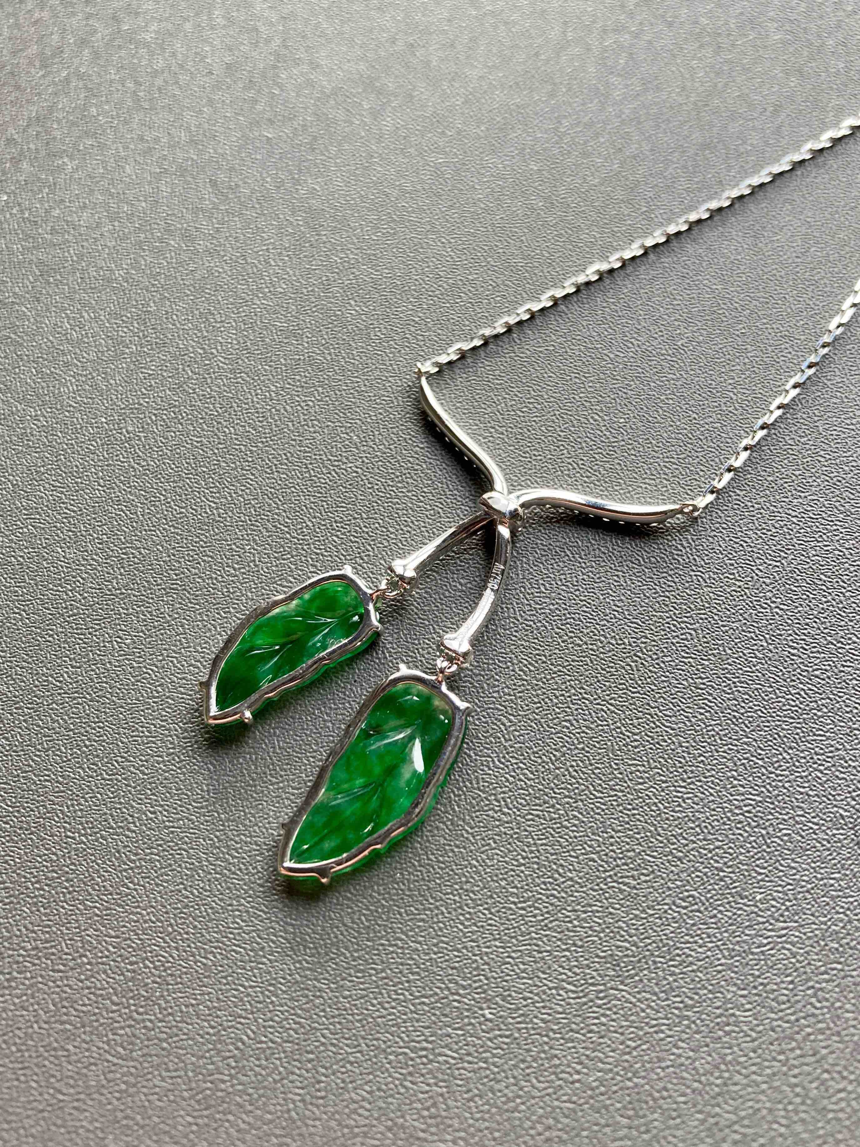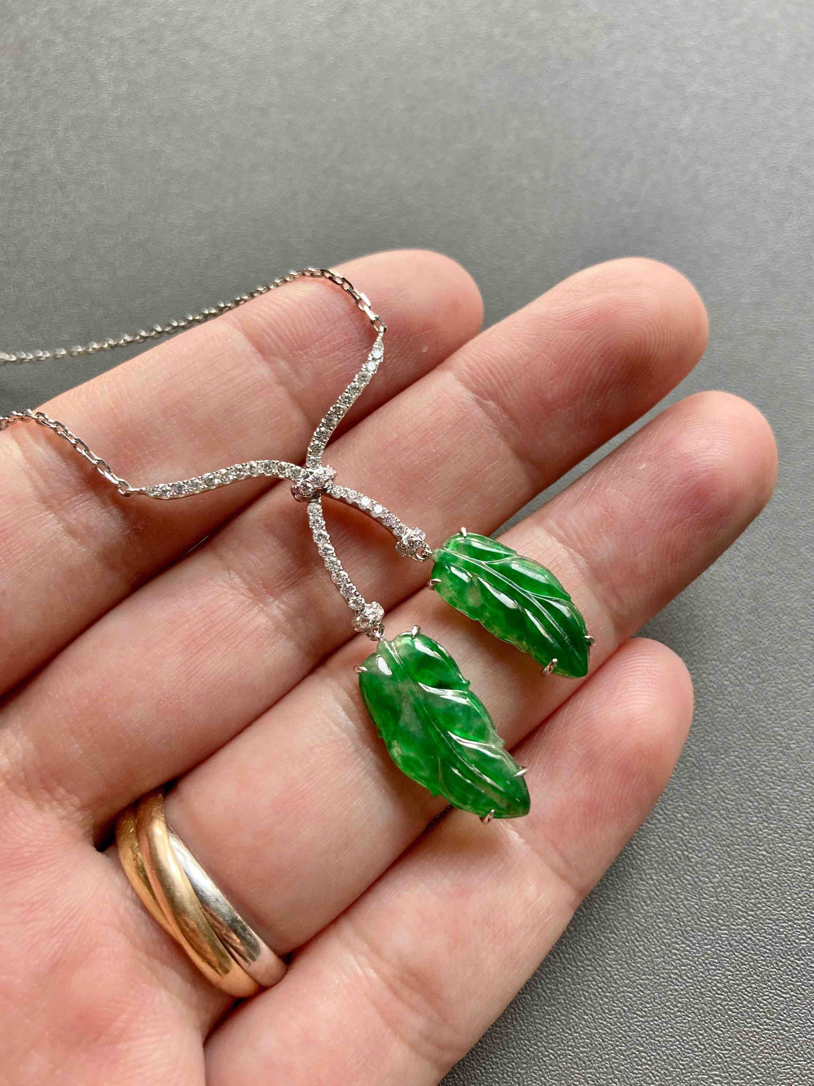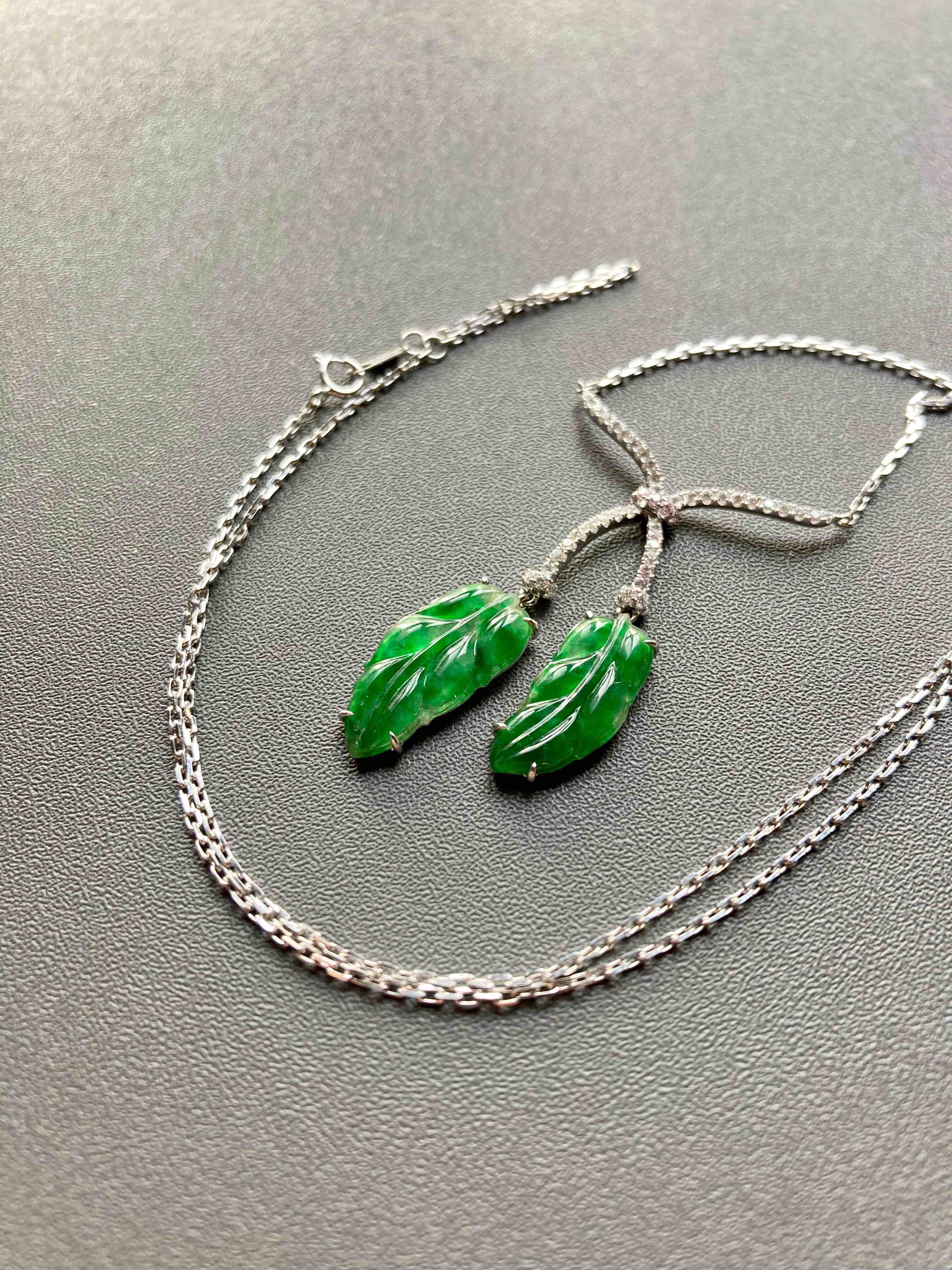 冰种阳绿辣色翡翠叶子项链18k白金钻石镶嵌