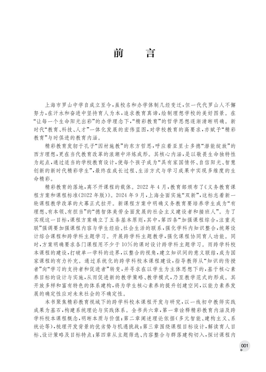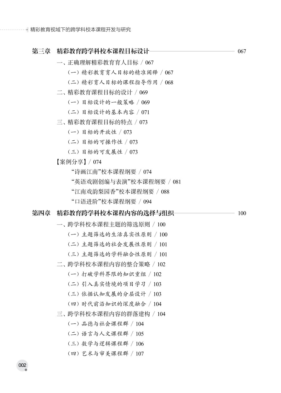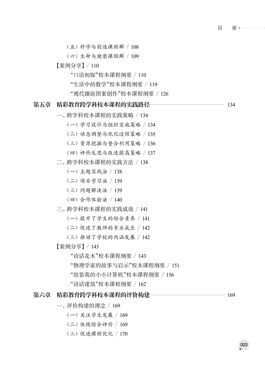 本书聚焦;精彩教育视域下的跨学科校本课程开发与研究,以一线初中教师实践成果为基石,构建系统理论与实践体系。第一章阐释精彩教育内涵及跨学科校本课程概念,明晰本质与价值;第二章剖析开发的理论基础(多元智能、建构主义、系统论),梳理开发背景的优劣势与机遇挑战;第三章围绕课程目标设计,解读育人目标、设计策略及目标特点;第四章从主题筛选、内容整合与群落建构,探讨课程内容选择组织;第五章介绍实践路径,含策略、方法与成效;第六章构建评价体系,涵盖理念、原则、指标及主客体工具。全书以理论指引实践,用案例支撑方法,为跨学科校本课程开发提供完整行动框架。