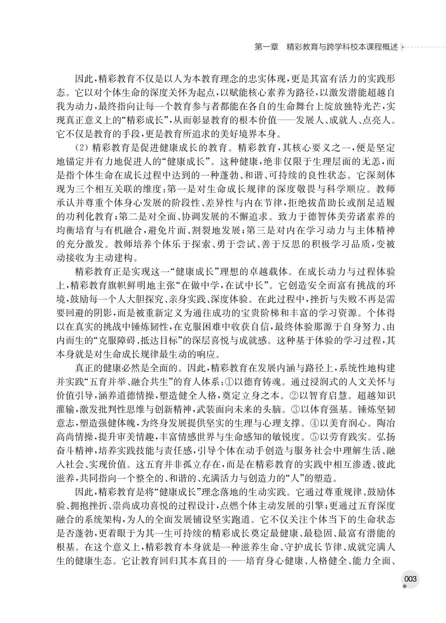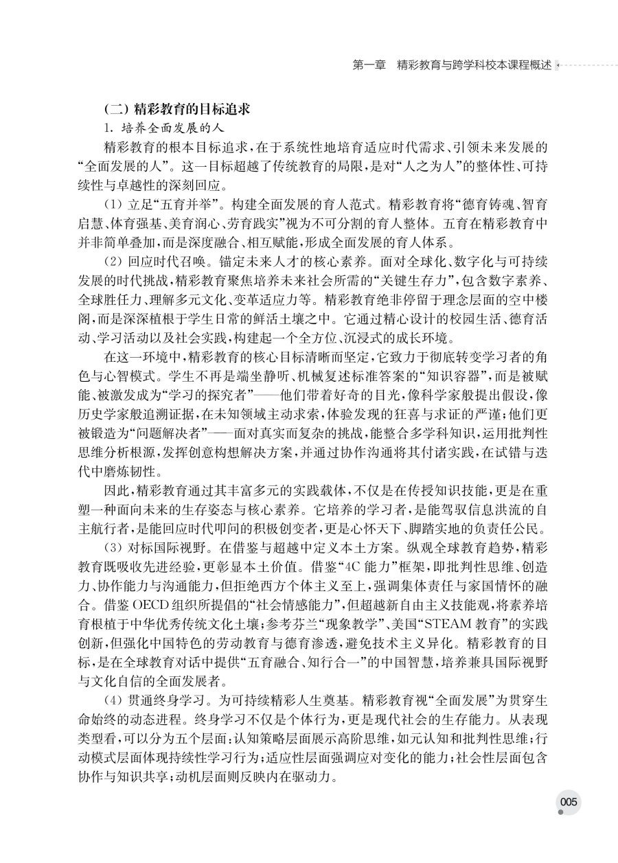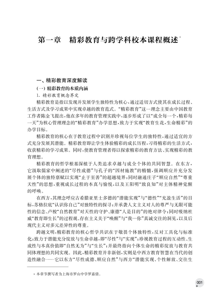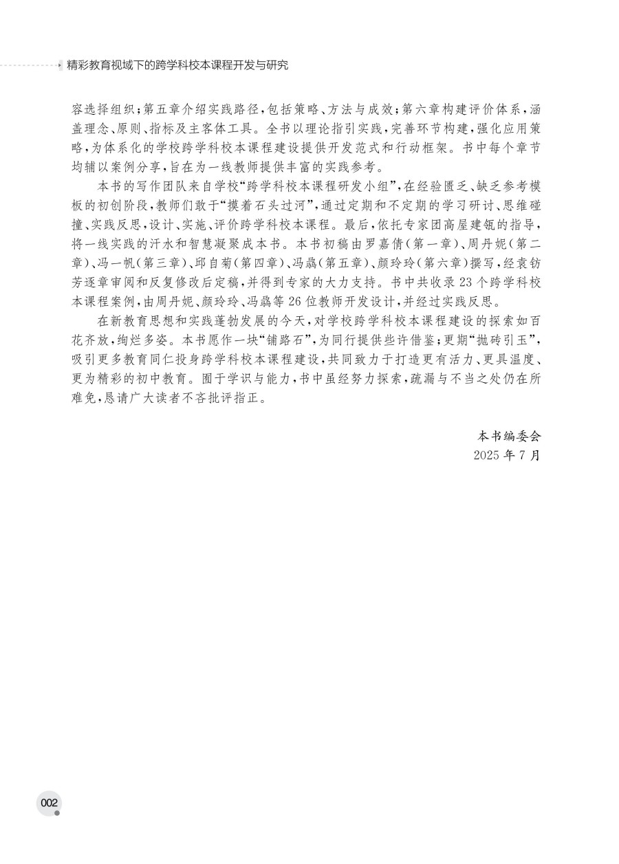 本书聚焦;精彩教育视域下的跨学科校本课程开发与研究,以一线初中教师实践成果为基石,构建系统理论与实践体系。第一章阐释精彩教育内涵及跨学科校本课程概念,明晰本质与价值;第二章剖析开发的理论基础(多元智能、建构主义、系统论),梳理开发背景的优劣势与机遇挑战;第三章围绕课程目标设计,解读育人目标、设计策略及目标特点;第四章从主题筛选、内容整合与群落建构,探讨课程内容选择组织;第五章介绍实践路径,含策略、方法与成效;第六章构建评价体系,涵盖理念、原则、指标及主客体工具。全书以理论指引实践,用案例支撑方法,为跨学科校本课程开发提供完整行动框架。