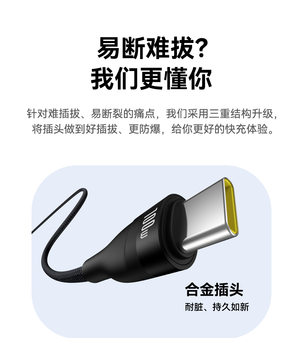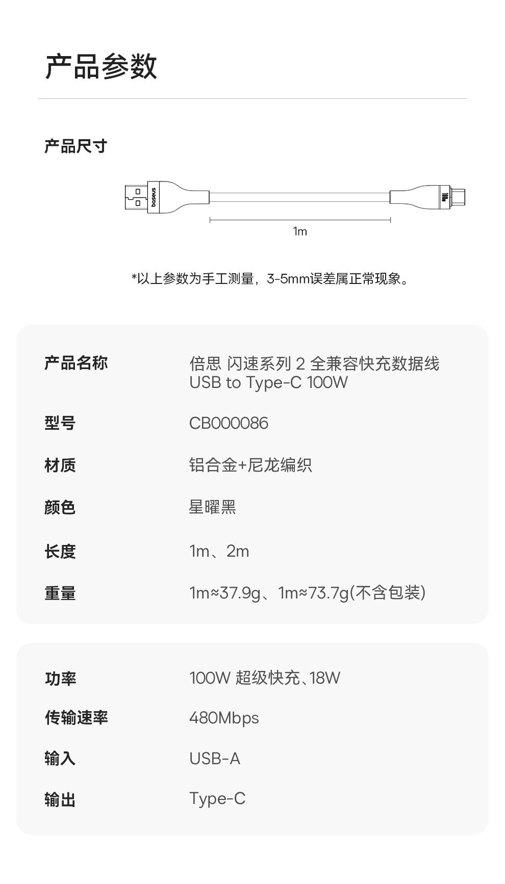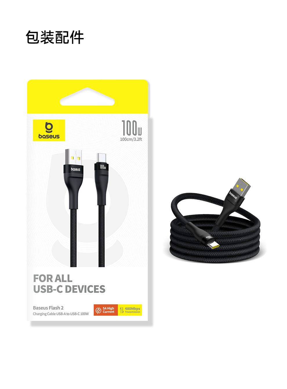 【69元3件】倍思 闪速系列 2 全兼容快充数据线 USB to Type-C 100W