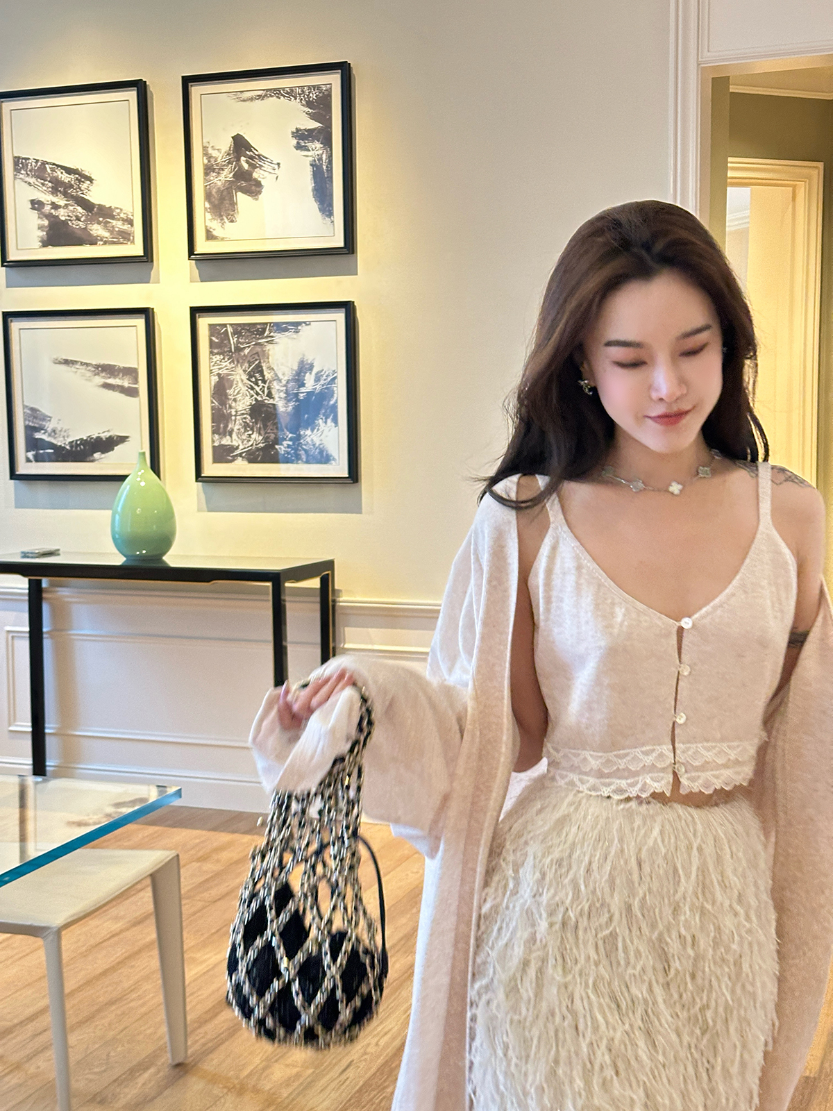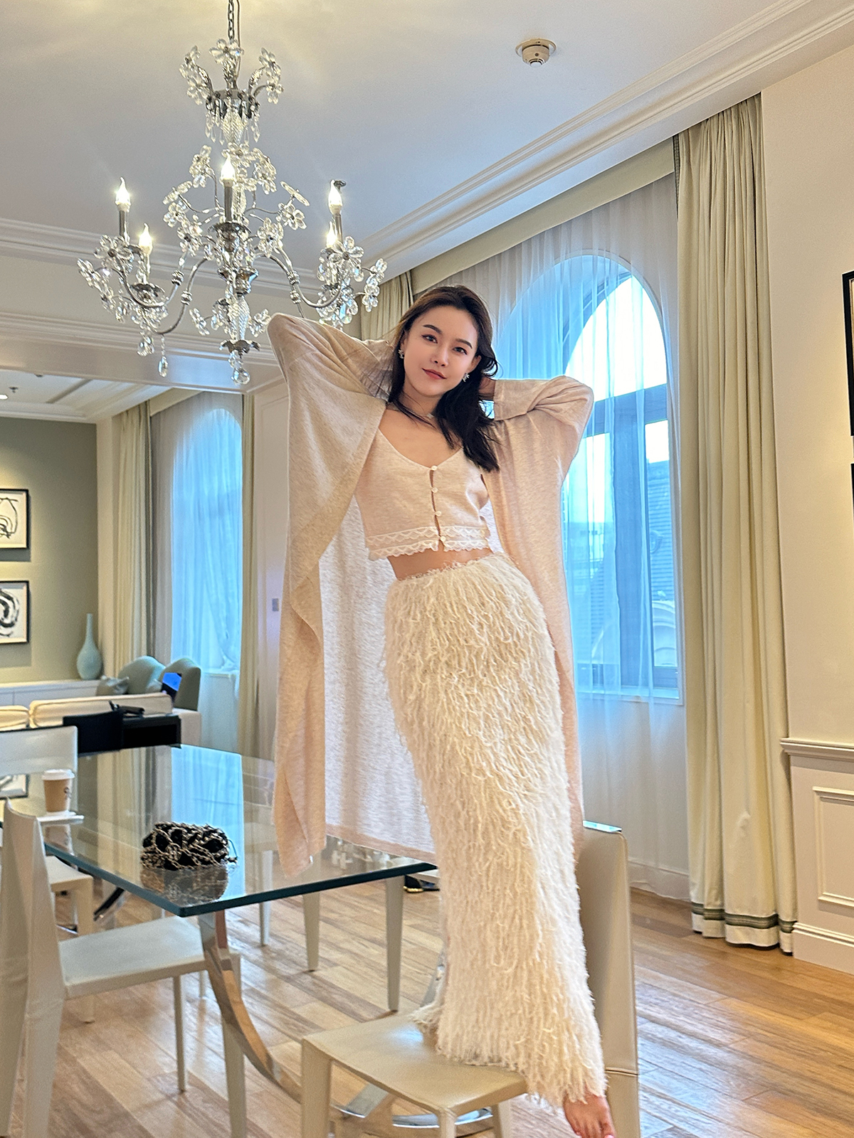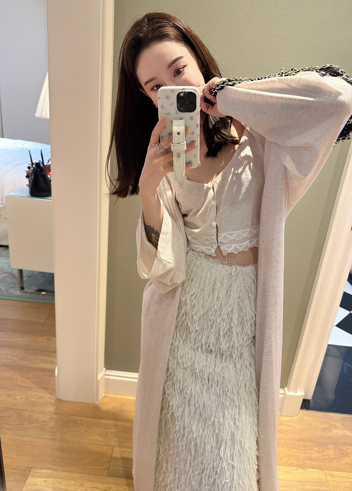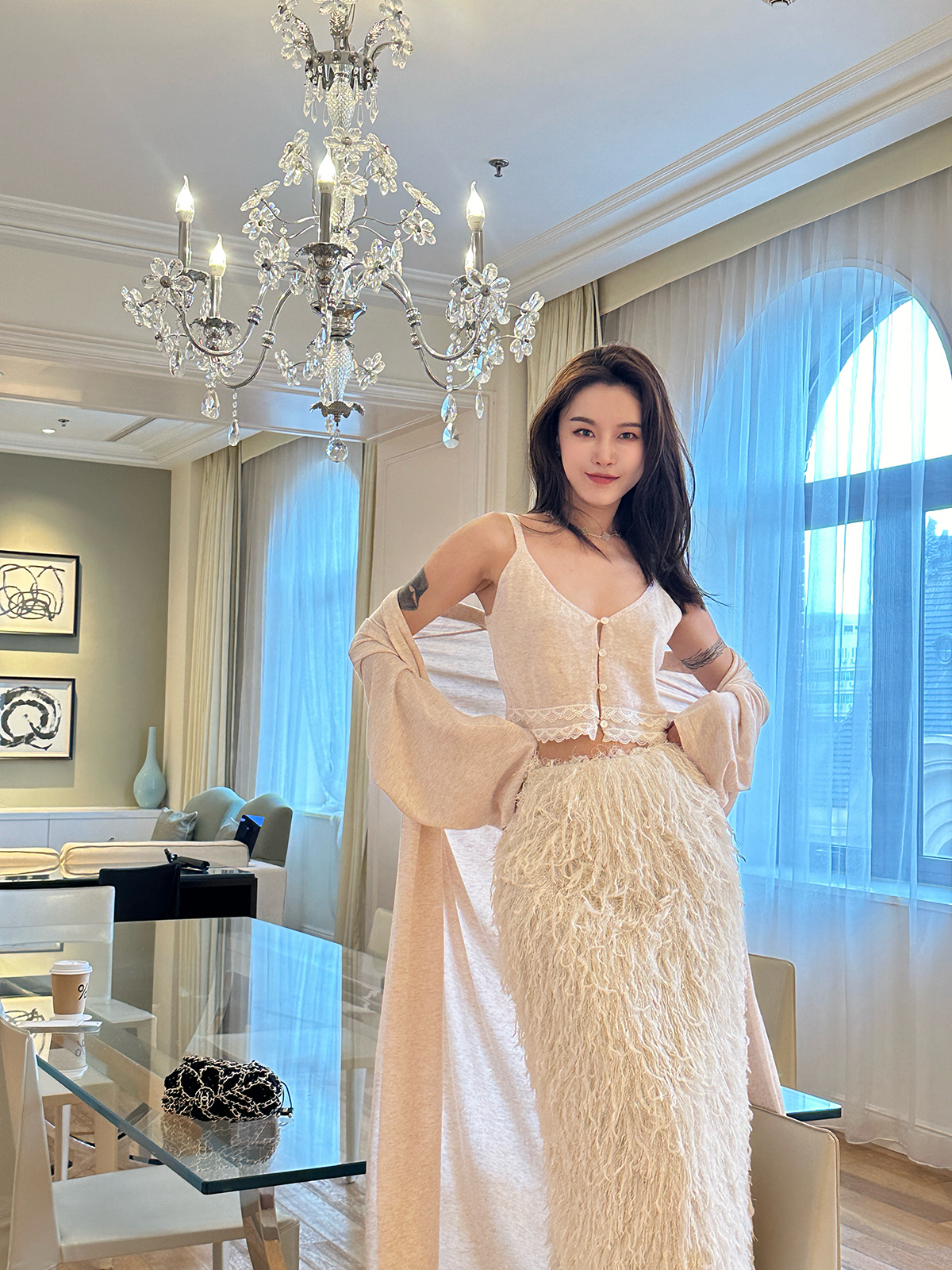 DUO智仙粉标少女雏菊淡粉色真丝混纺印花吊带连衣裙和夏日小披肩