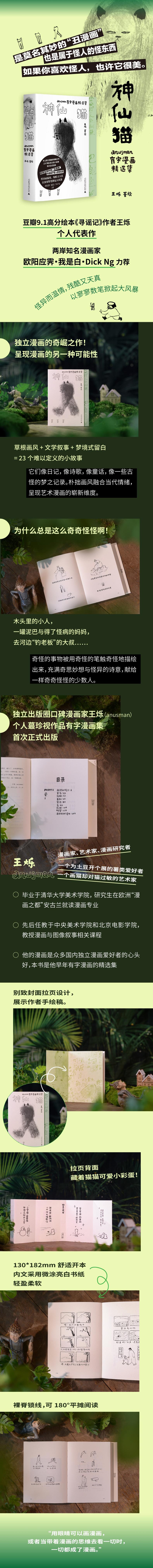 "★独立漫画的奇崛之作!呈现漫画的另一种可能性。 草根画风 + 文学叙事 +梦境式留白 = 23个难以定义的小故事。怪异而温情,残酷又天真,以寥寥数笔掀起大风暴。 它们像日记,像诗歌,像童话,像一些古怪的梦之记录。朴拙画风融合当代情绪,呈现艺术漫画的崭新维度。 ★是莫名其妙的“丑漫画”,也是属于怪人的怪东西。 为什么总是这么奇奇怪怪! 木头里的小人,一罐泥巴与得了怪病的妈妈,去池塘“钓老板”的大叔……奇怪的事物被用奇怪的笔触奇怪地描绘出来,充满奇思妙想与怪异的诗意,献给一样奇奇怪怪的少数人。 ★独立出版圈口碑漫画家王烁anusman,个人蕞珍视作品有字漫画集首次正式出版。 独立漫画家anusman毕业于清华大学美术学院,研究生在欧洲“漫画之都”安古兰就读漫画专业,先后任教于中央美术学院和北京电影学院,教授漫画与图像叙事相关课程。他的漫画是众多国内独立漫画爱好者的心头好,本书是他早年有字漫画的精选集。 ★别致封面拉页设计,展示作者手绘稿。 拉页背面藏着猫猫可爱小彩蛋! 130*182mm舒适开本,内文采用微涂亮白书纸,轻盈柔软; 裸脊锁线,可180°平摊阅读。"