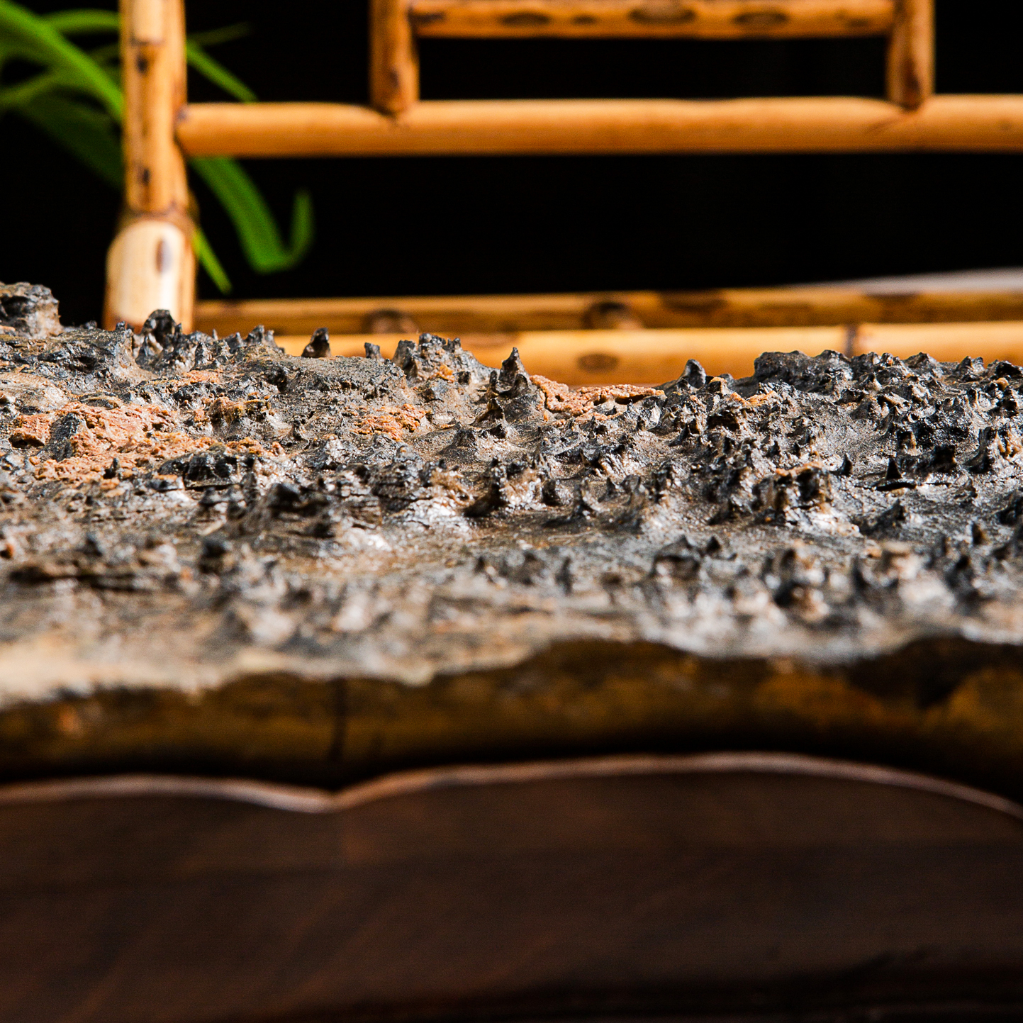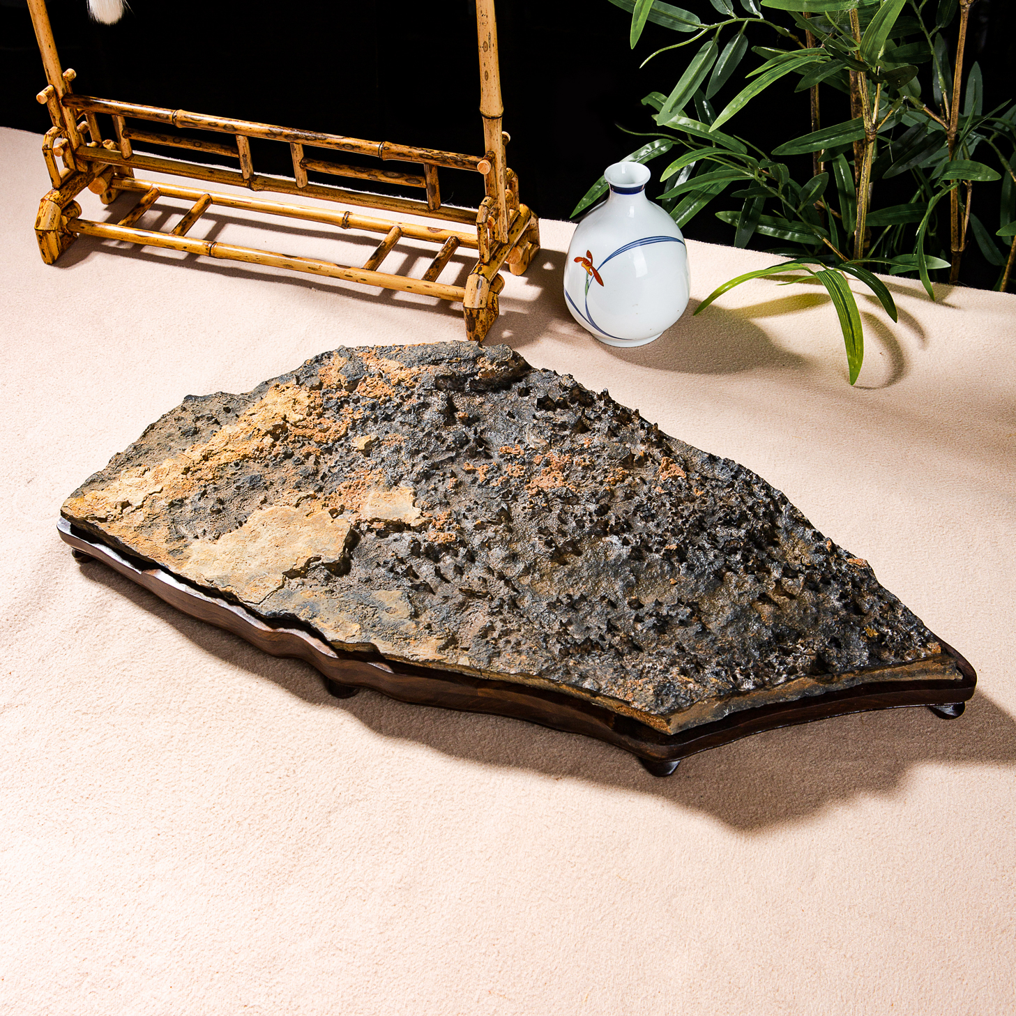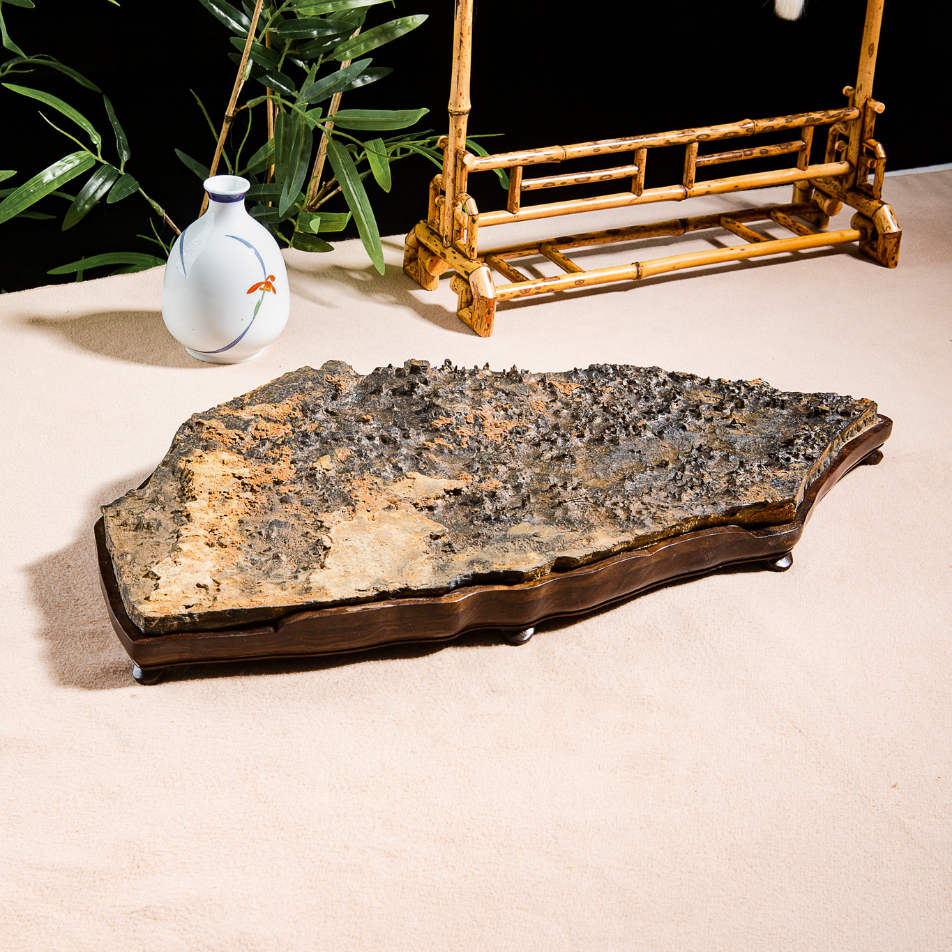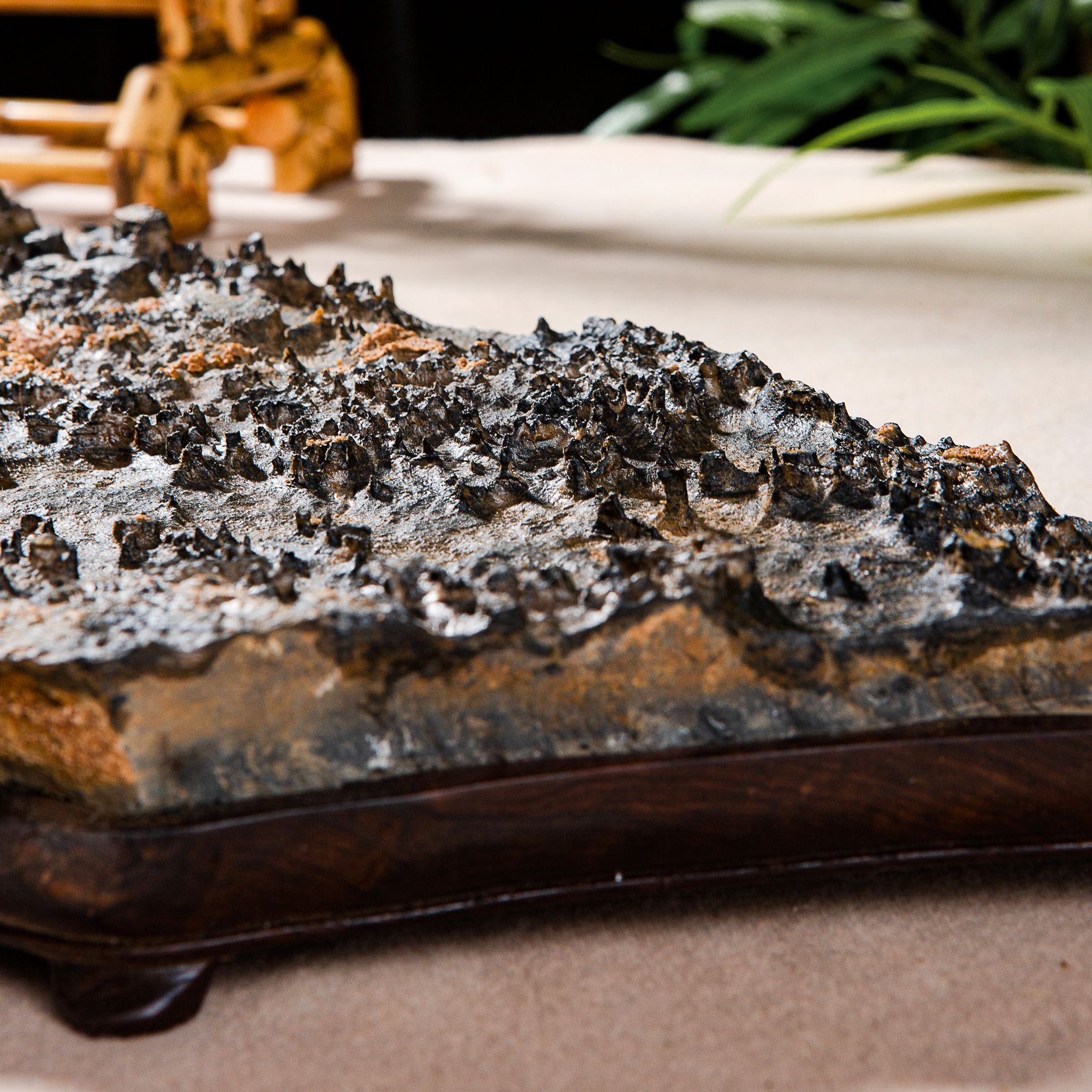 此方灵璧石楼兰景观文房赏石,原石原底,未经人工修饰,配苏工底座。造型独特,恰似大地上蜿蜒起伏的山脉,展现出一种磅礴的气势,其表面上的纹理就像是山丘上历经风雨侵蚀而形成的沟壑与峰峦,静静置于一处,便自成一方天地,可遇而不可求。