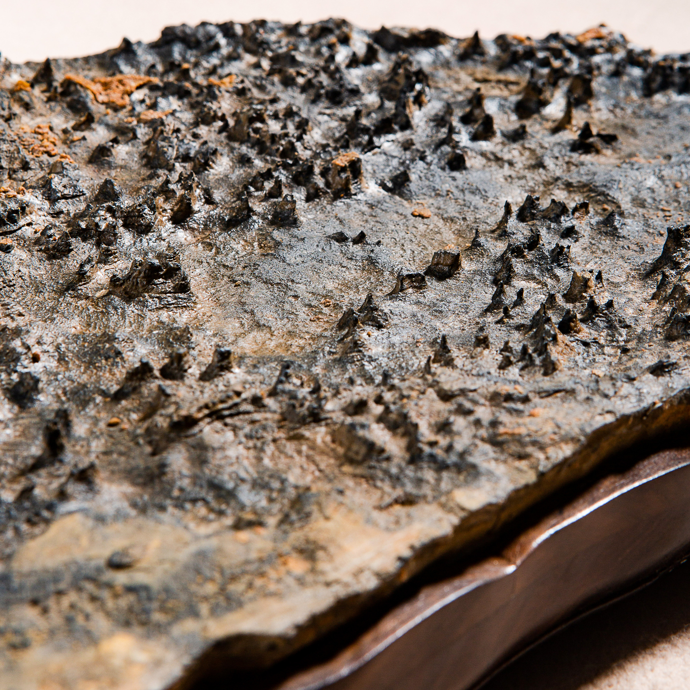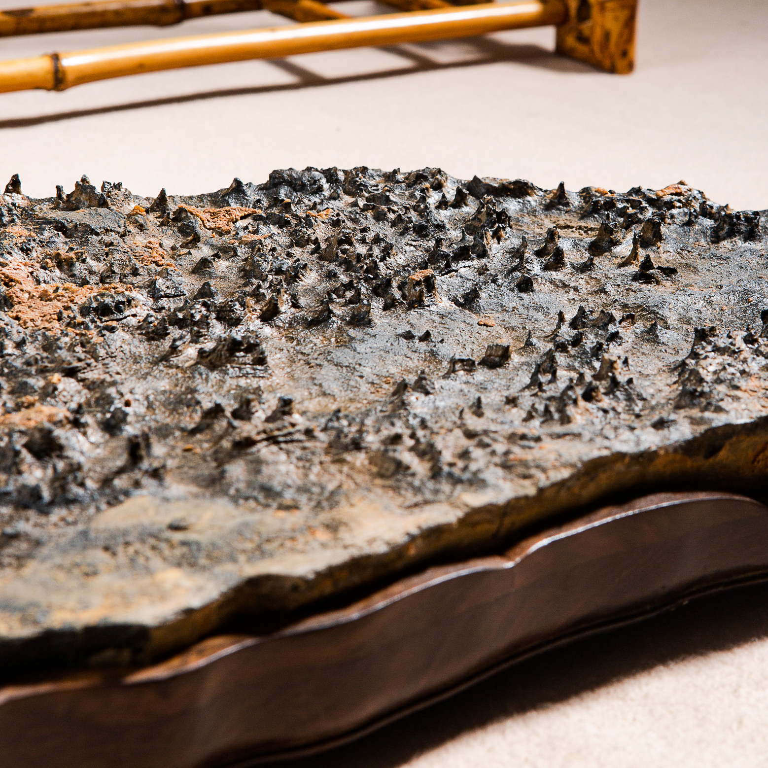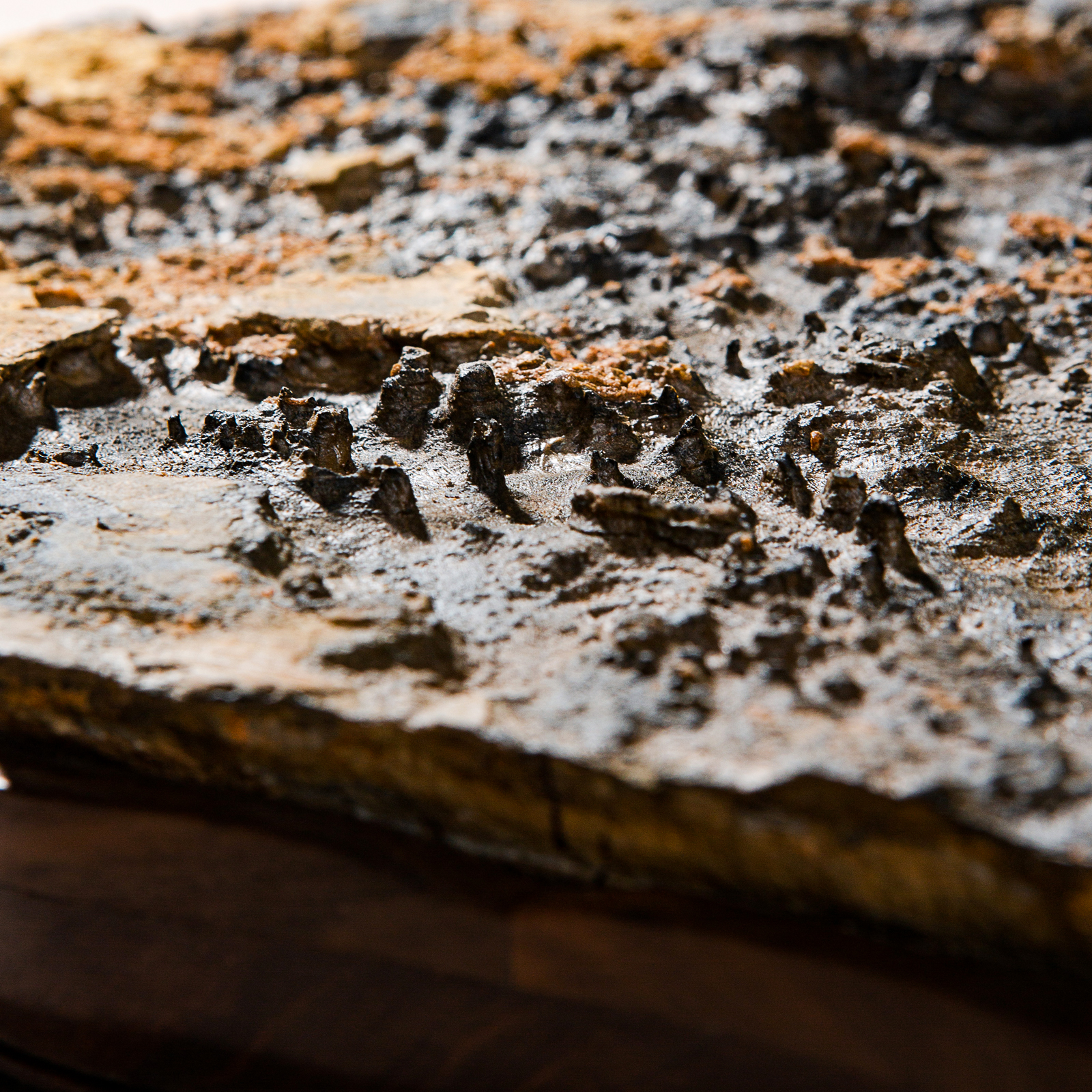 此方灵璧石楼兰景观文房赏石,原石原底,未经人工修饰,配苏工底座。造型独特,恰似大地上蜿蜒起伏的山脉,展现出一种磅礴的气势,其表面上的纹理就像是山丘上历经风雨侵蚀而形成的沟壑与峰峦,静静置于一处,便自成一方天地,可遇而不可求。