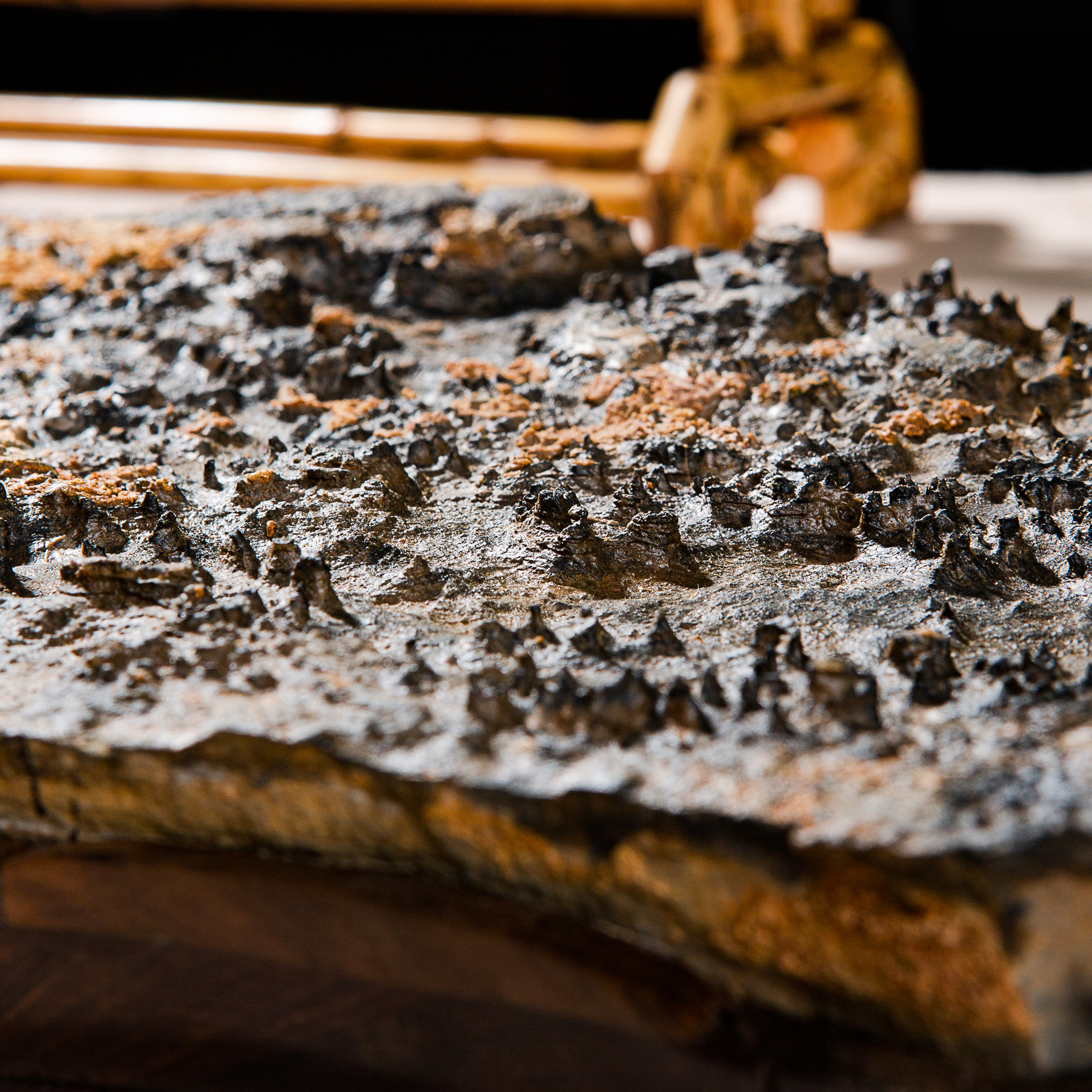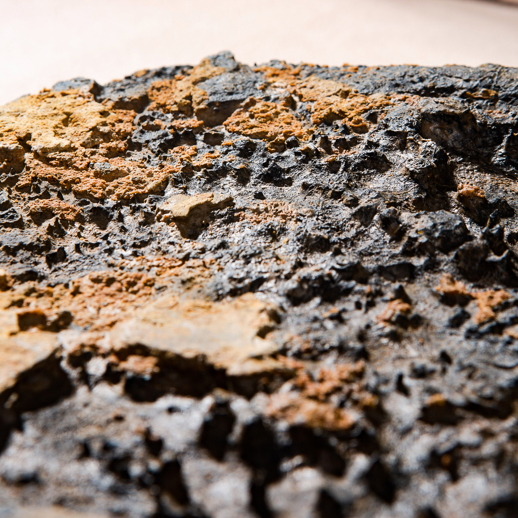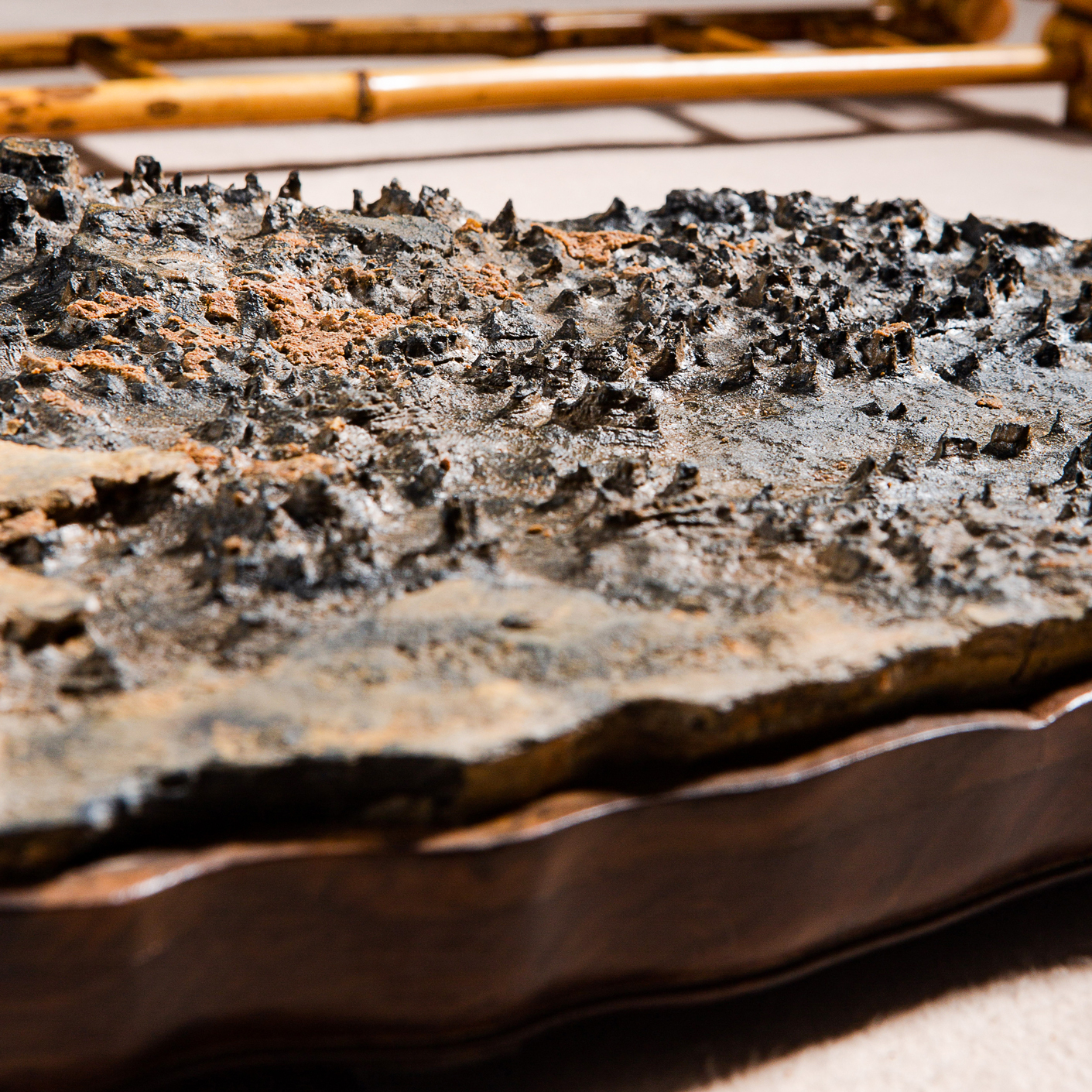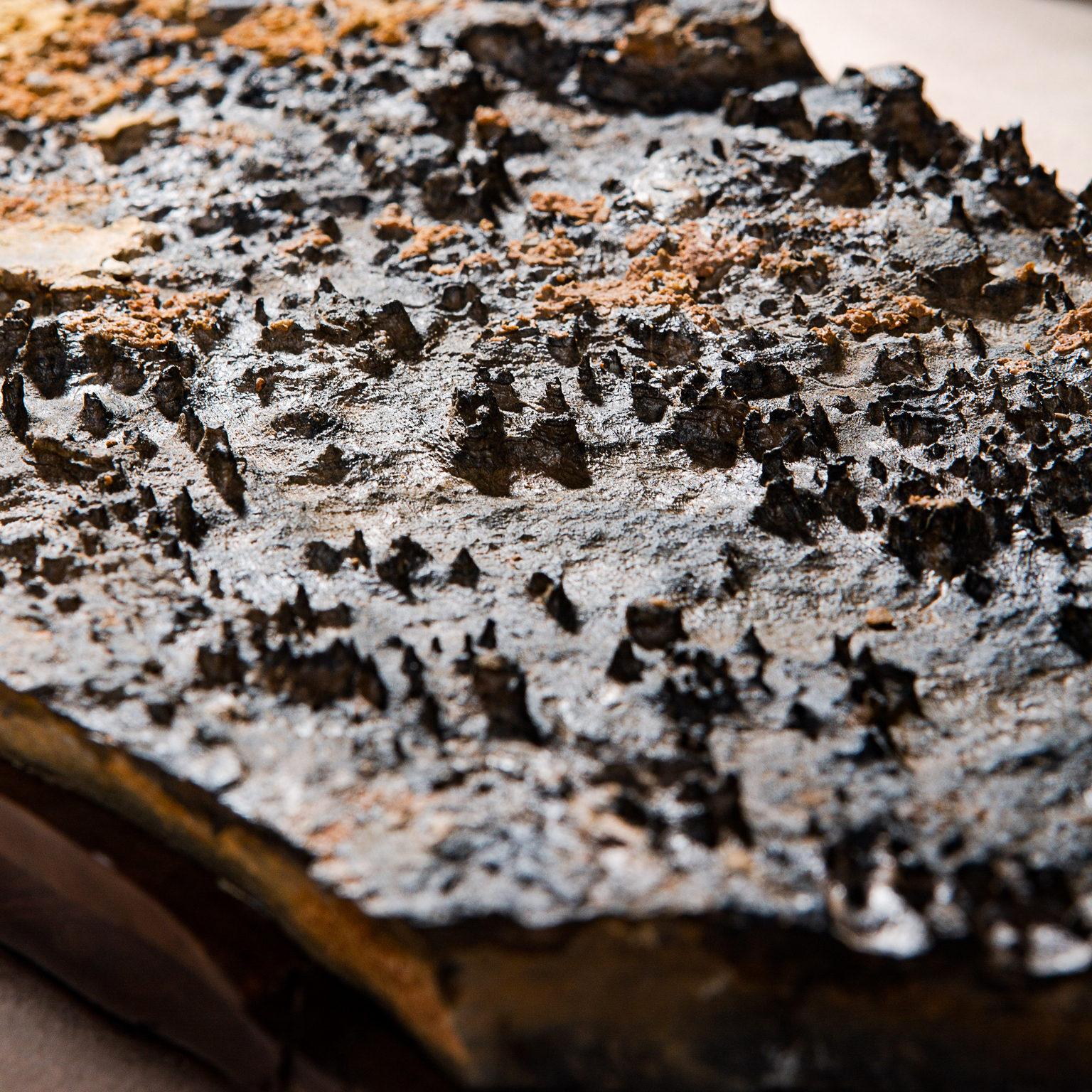 此方灵璧石楼兰景观文房赏石,原石原底,未经人工修饰,配苏工底座。造型独特,恰似大地上蜿蜒起伏的山脉,展现出一种磅礴的气势,其表面上的纹理就像是山丘上历经风雨侵蚀而形成的沟壑与峰峦,静静置于一处,便自成一方天地,可遇而不可求。