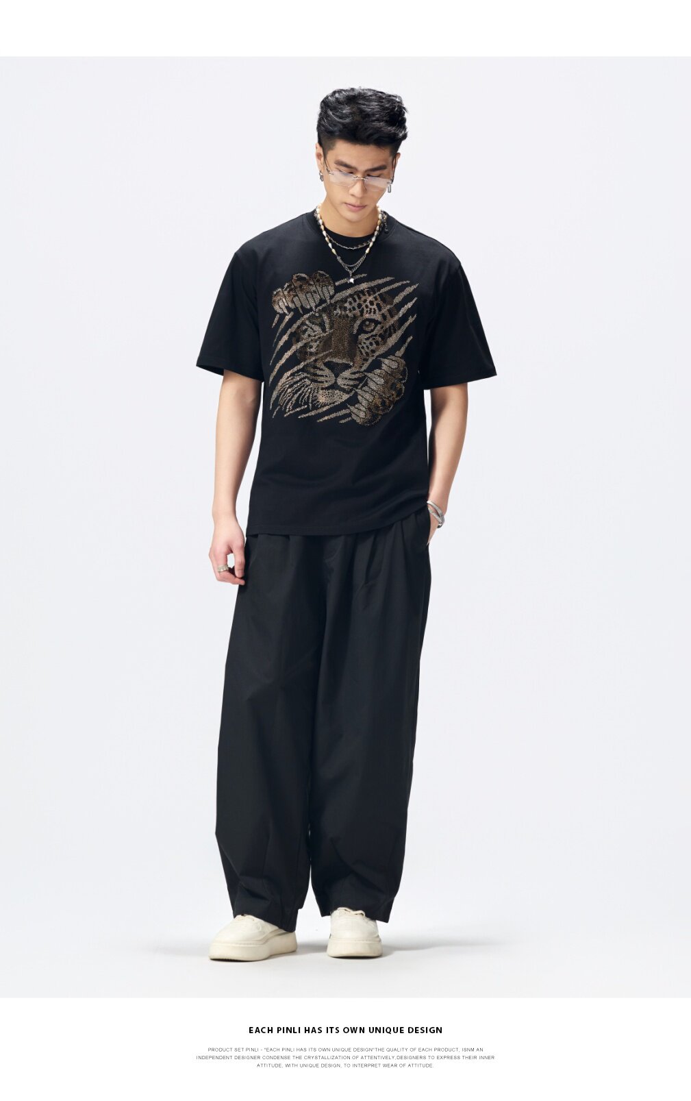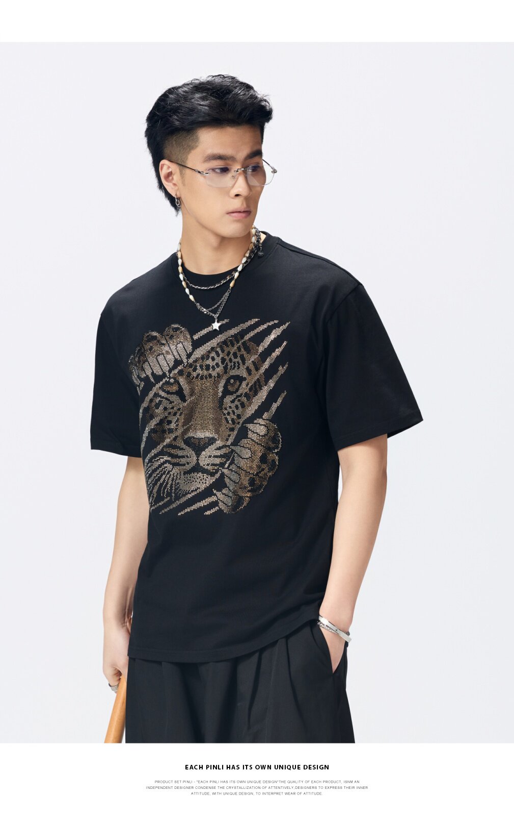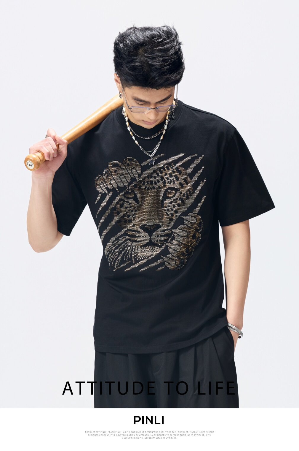 PINLI品立2026夏季新款男老虎烫钻圆领落肩袖短袖T恤上衣青年体恤BG262111024