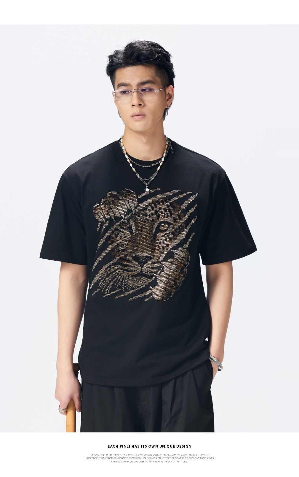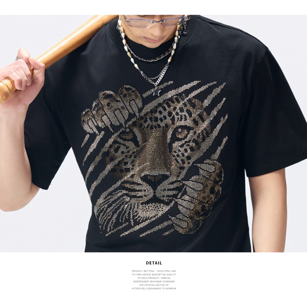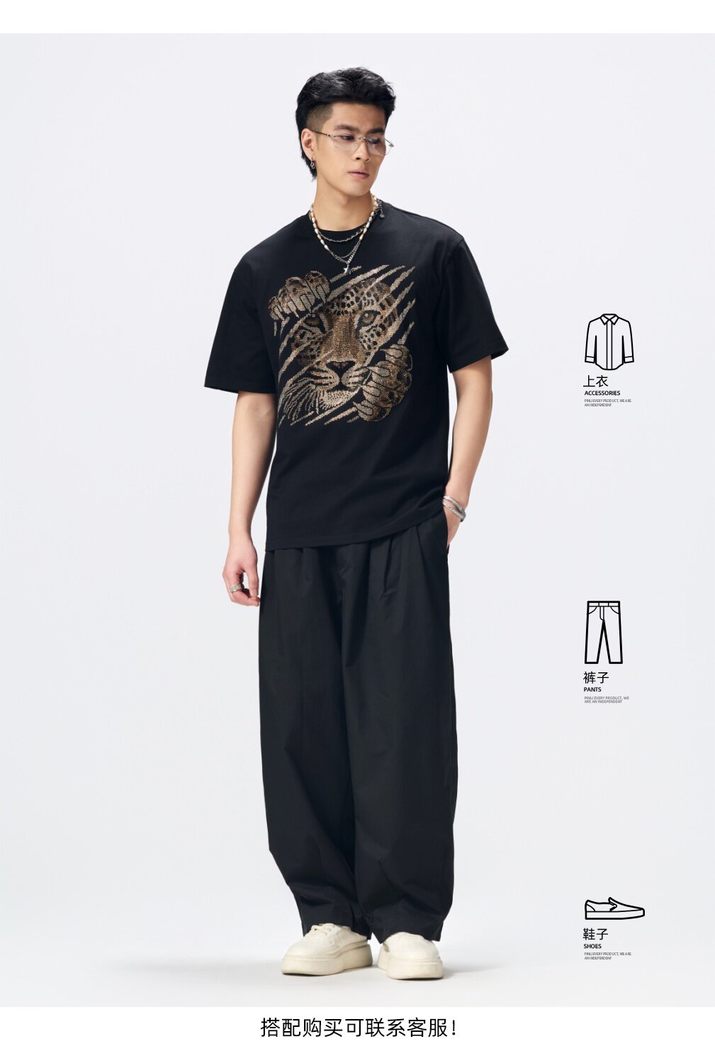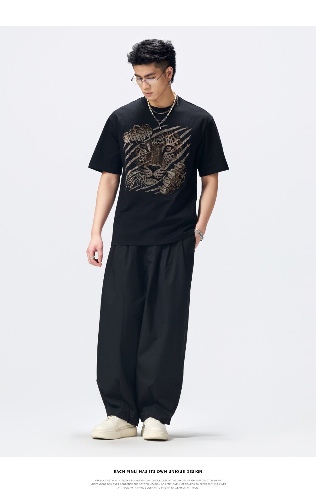 PINLI品立2026夏季新款男老虎烫钻圆领落肩袖短袖T恤上衣青年体恤BG262111024