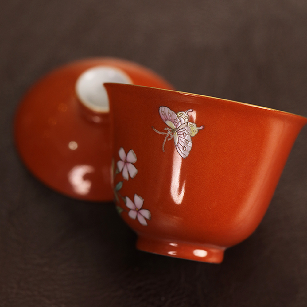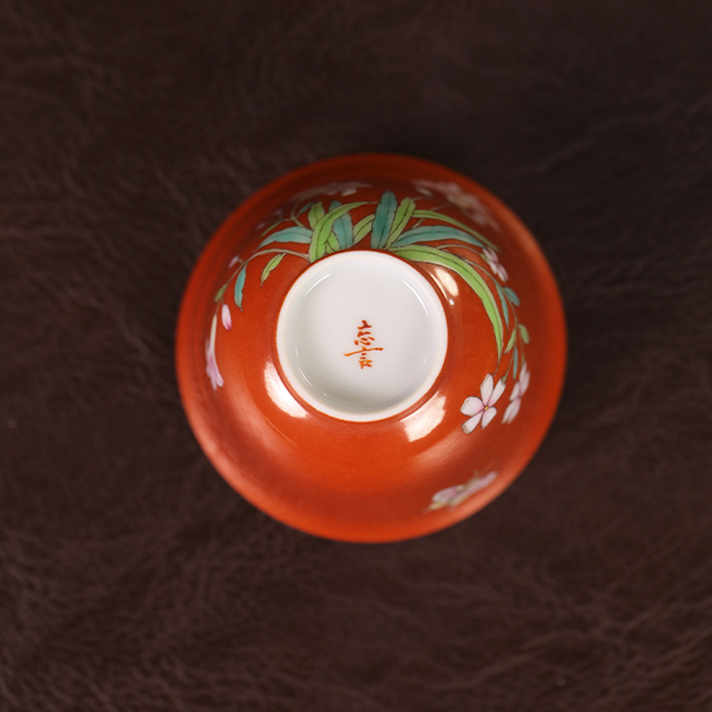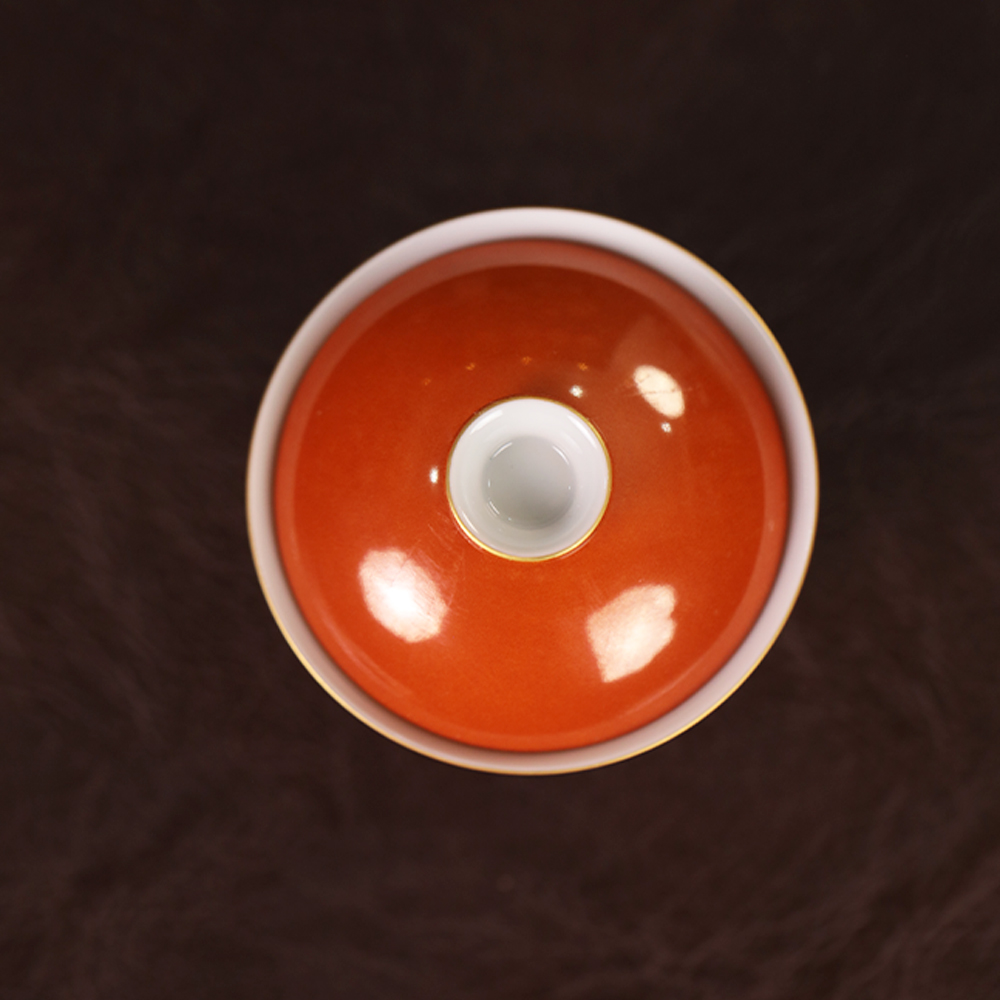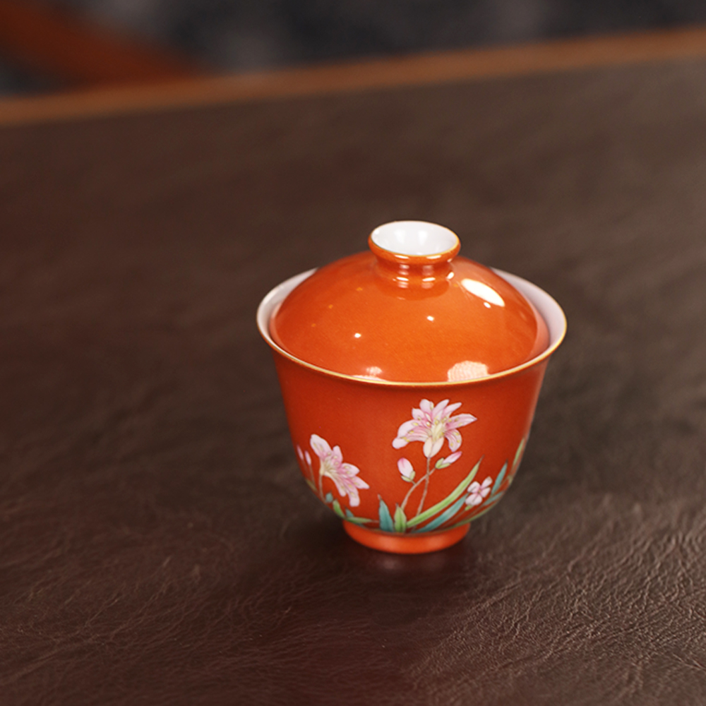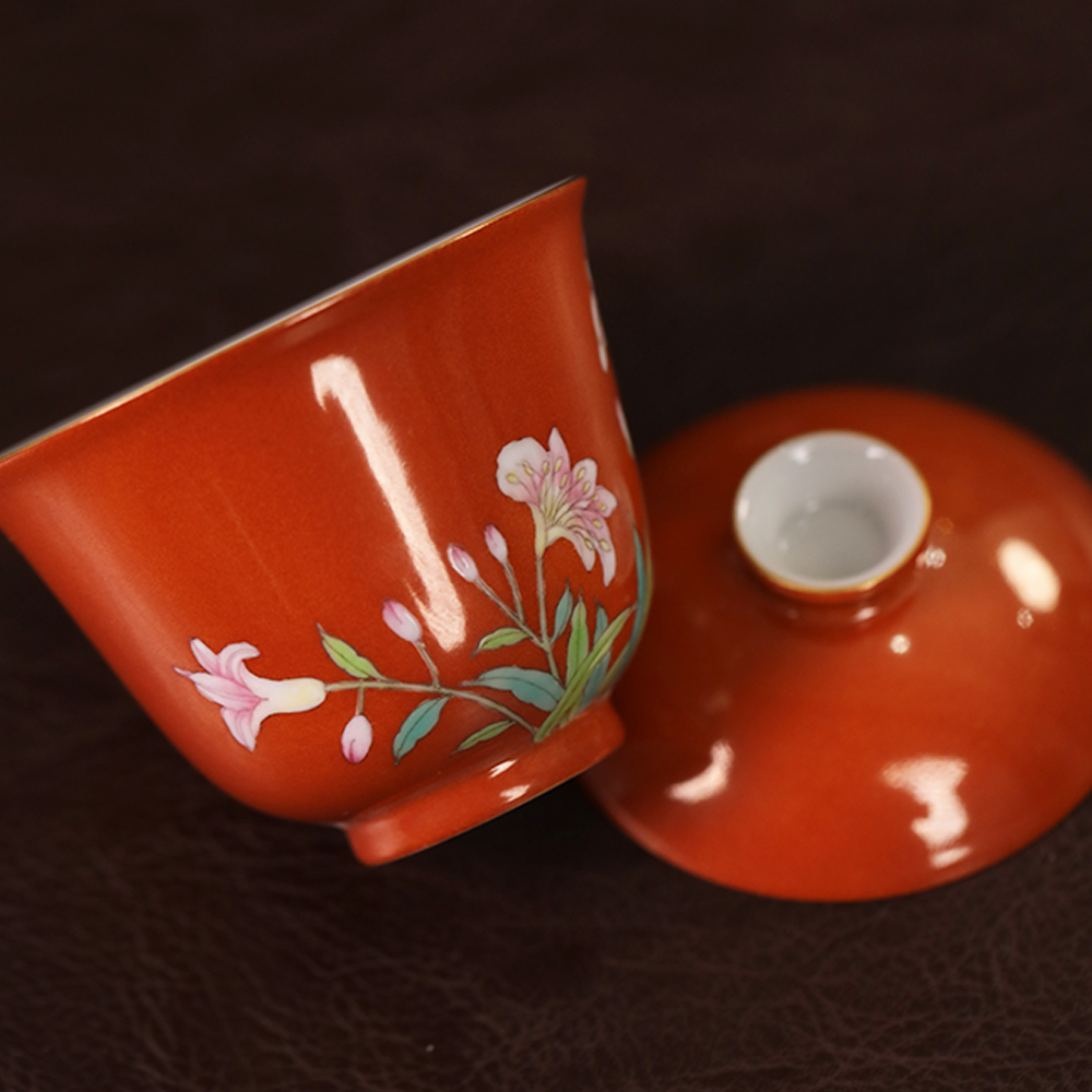 【忘言】矾红粉彩萱草纹小茶碗 盖碗 曰何文人器