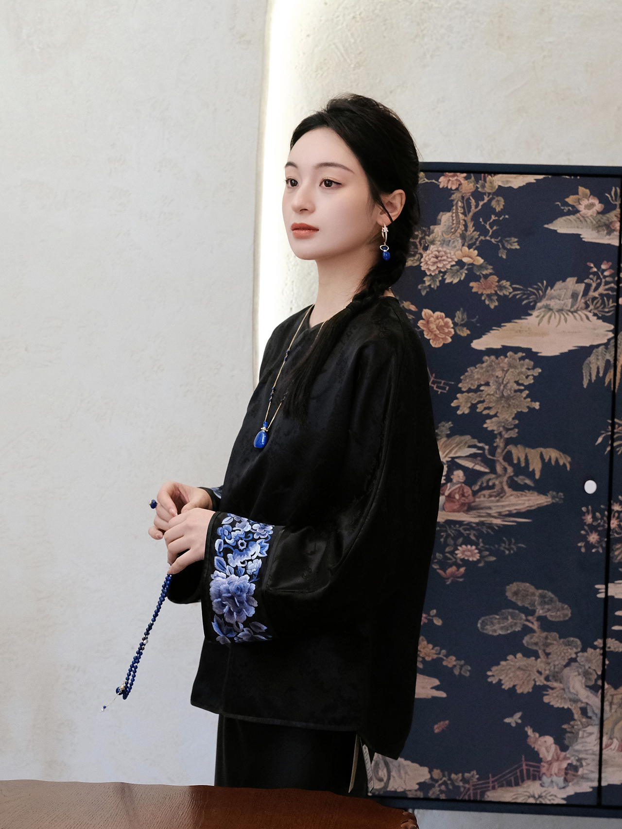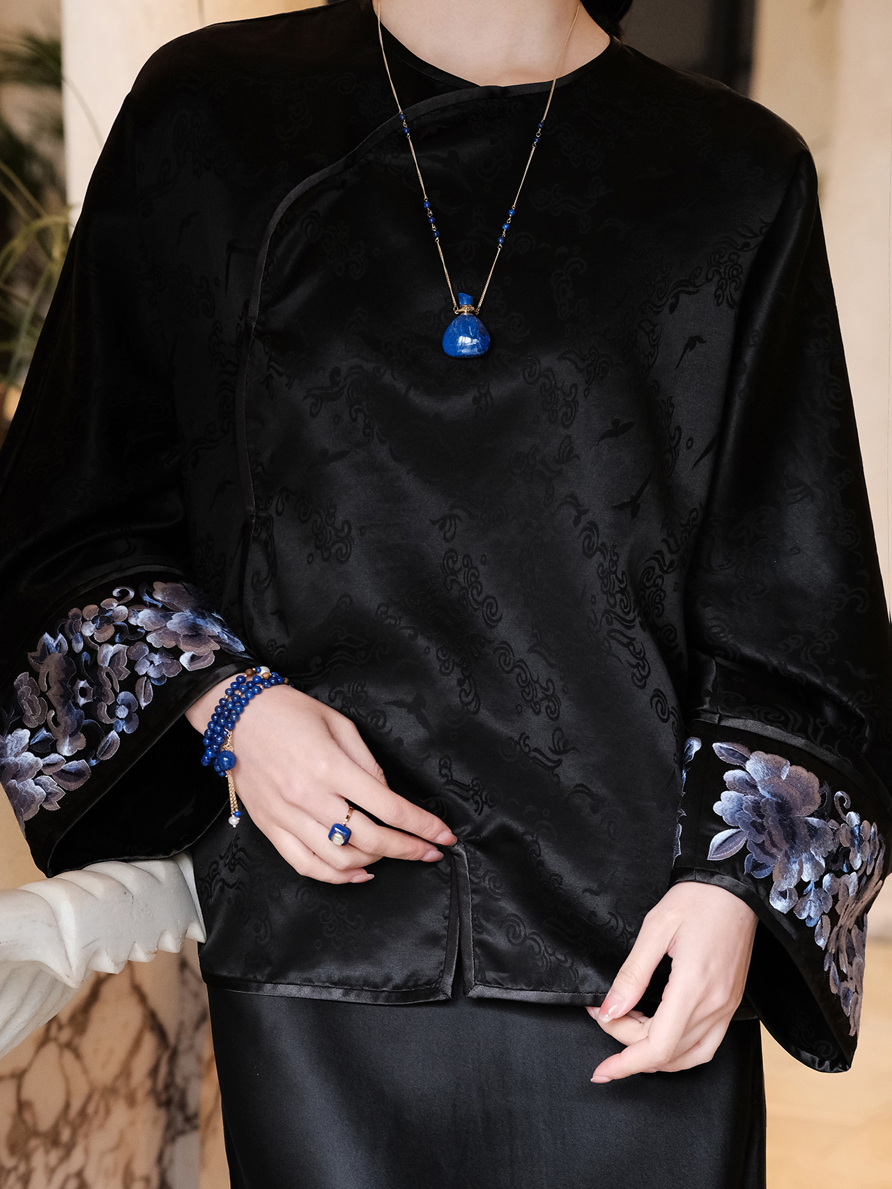 盛唐牡丹 |丝毛三蓝手推绣挽袖上衣-黑色(限量款-售完不补)