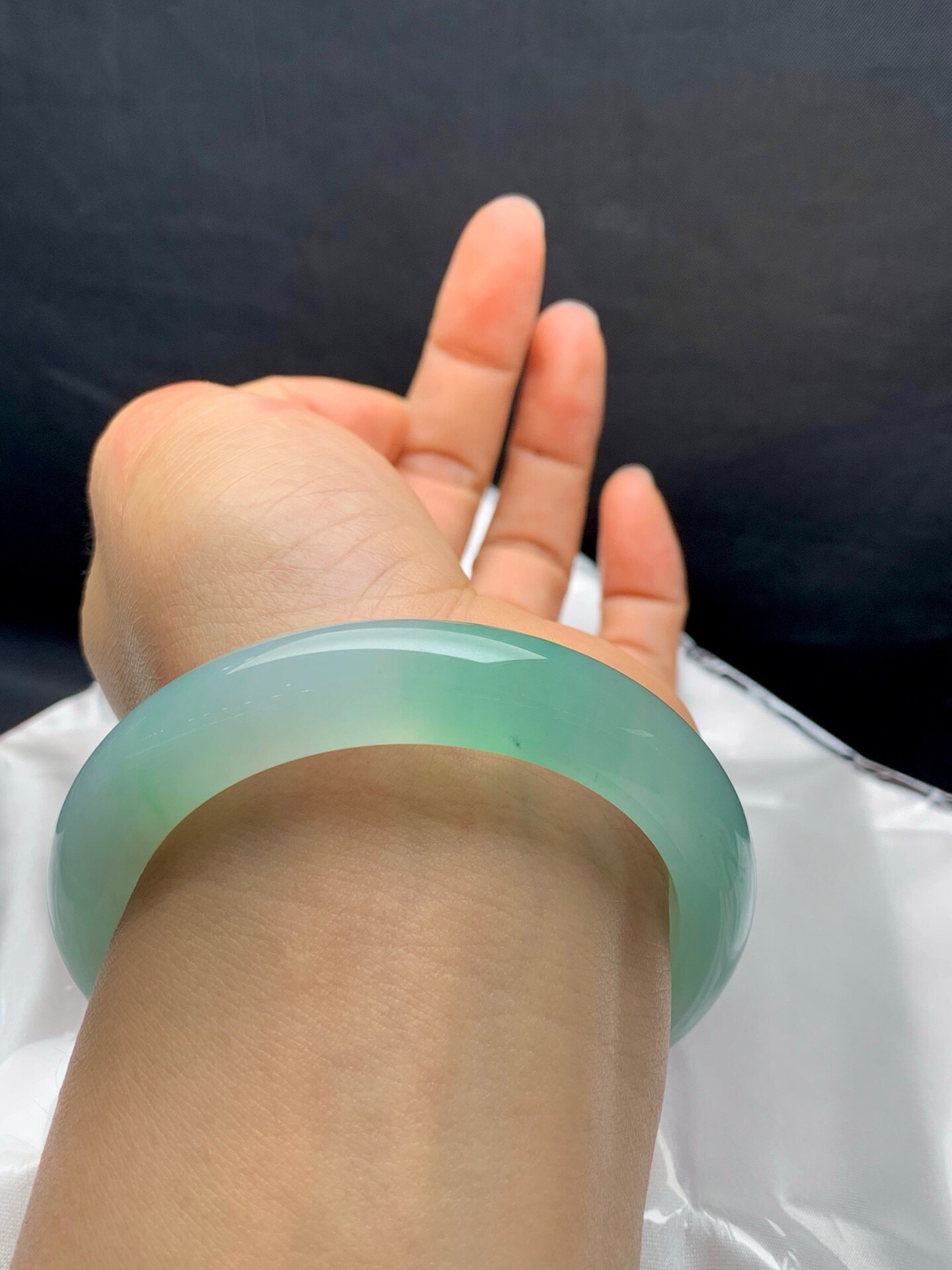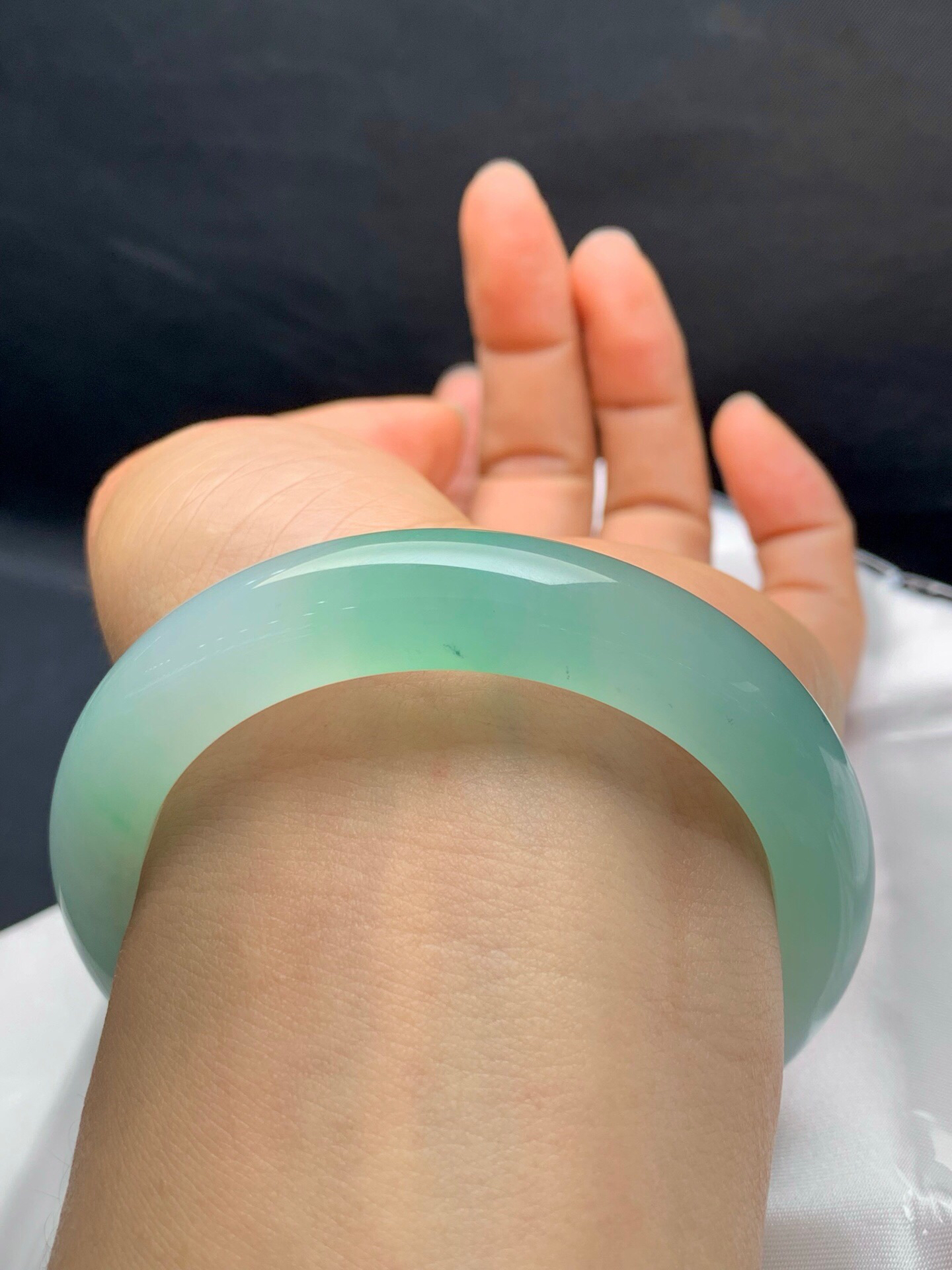 612767,56.3圈口,冰甜绿正圈平安镯,冰胶起光,晴水甜绿底色,打灯有一处纹,肉眼不明显,上手完美,尺寸:56.3-11.8-9.2,超值价💰72000 #优石客珠宝#香玉荟萃