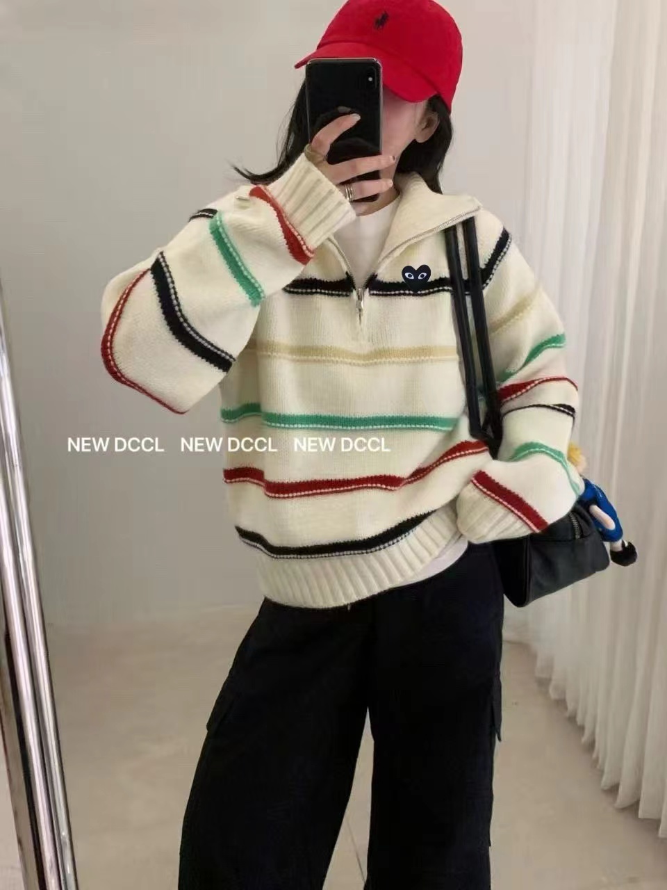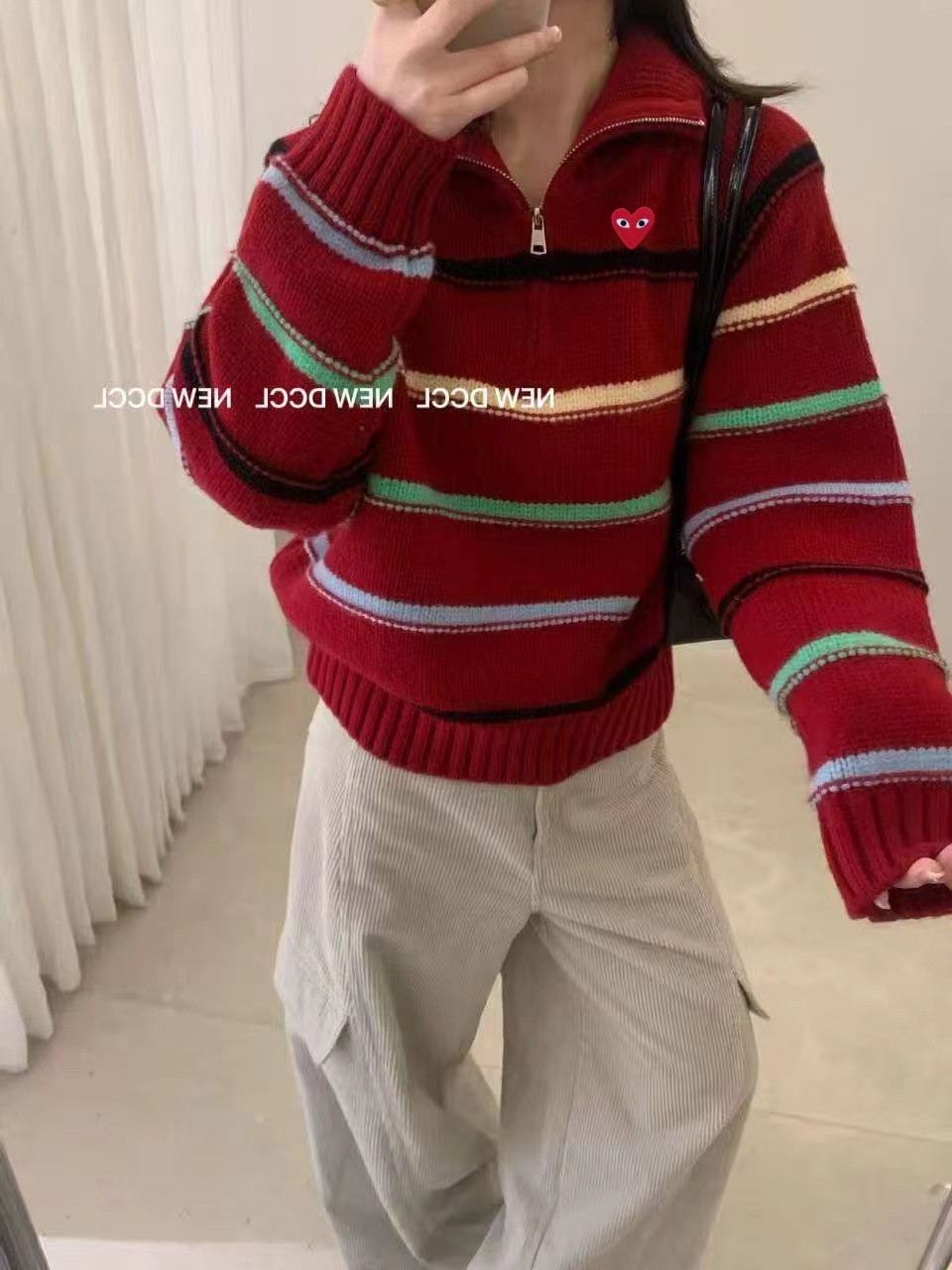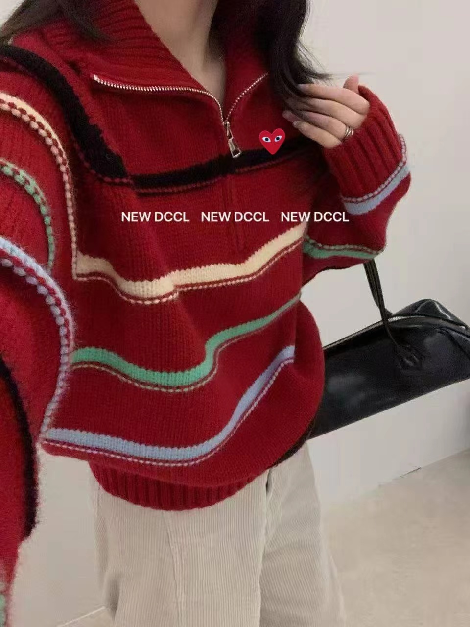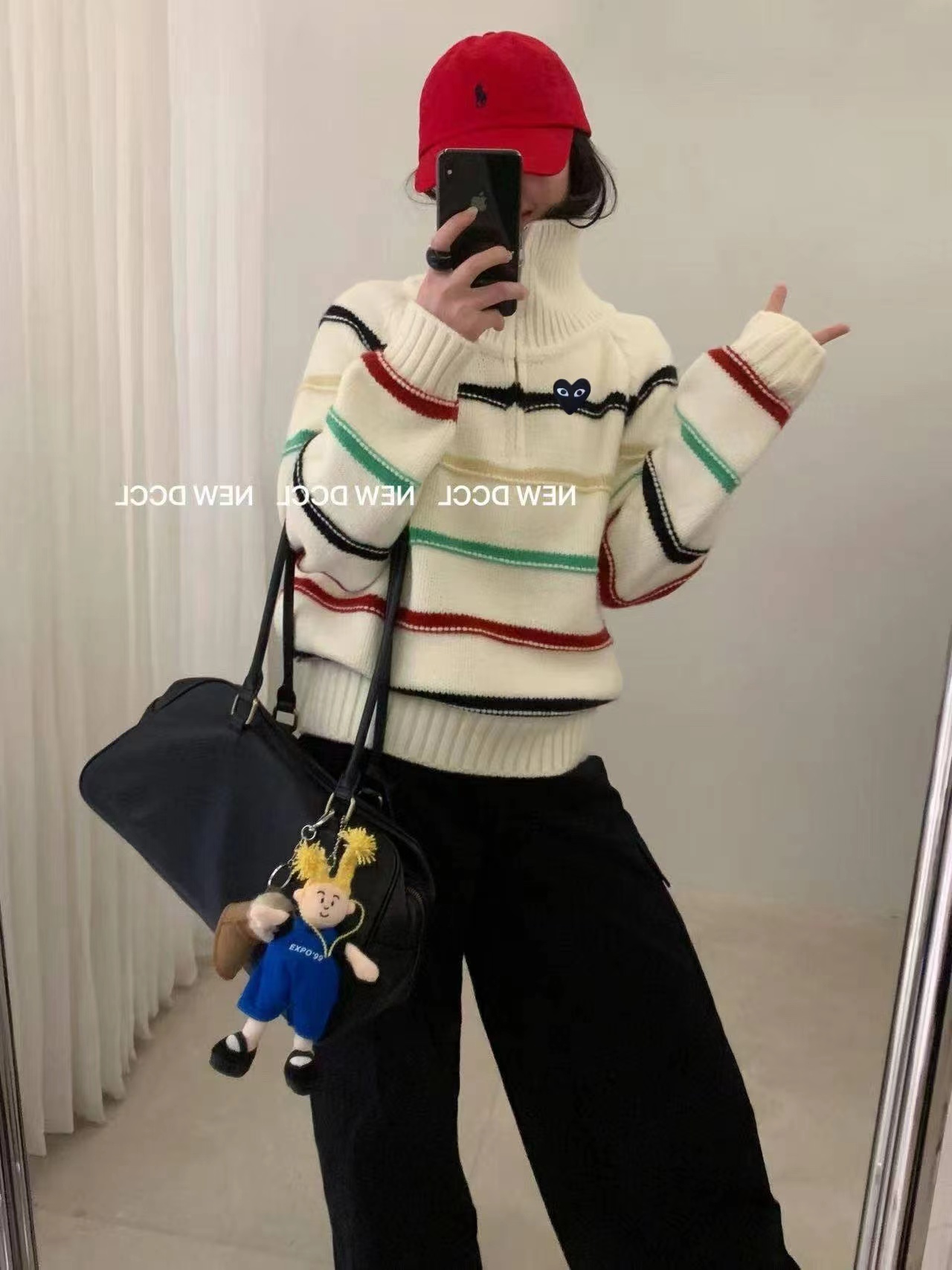 半拉链针织毛衣是兼具时尚感与氛围感的日系秋冬款,波浪形条纹,色彩碰撞活泼又亮眼,基底也让衣服自带节日与新年氛围。采用宽松的短款版型,对身材包容度高,还能拉高腰线优化比例;袖口和下摆做了罗纹收口设计,贴合身形又防风。半拉链的高领设计,可自由调节领口开合度,兼具实用性与造型感;粗线针织的工艺让衣服质感厚实,保暖性也更佳。整体是休闲韩系风,既可以搭配牛仔裤、休闲裤打造日常随性穿搭,也能配半身裙营造甜酷混搭效果。