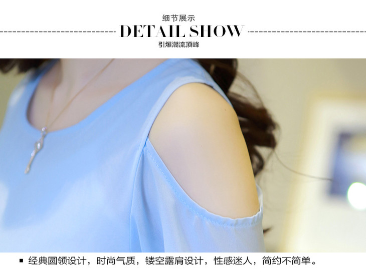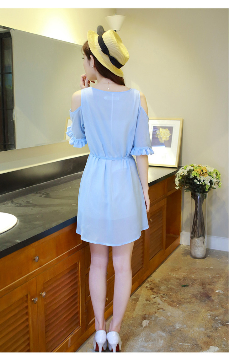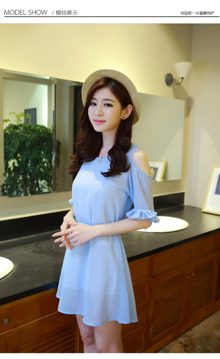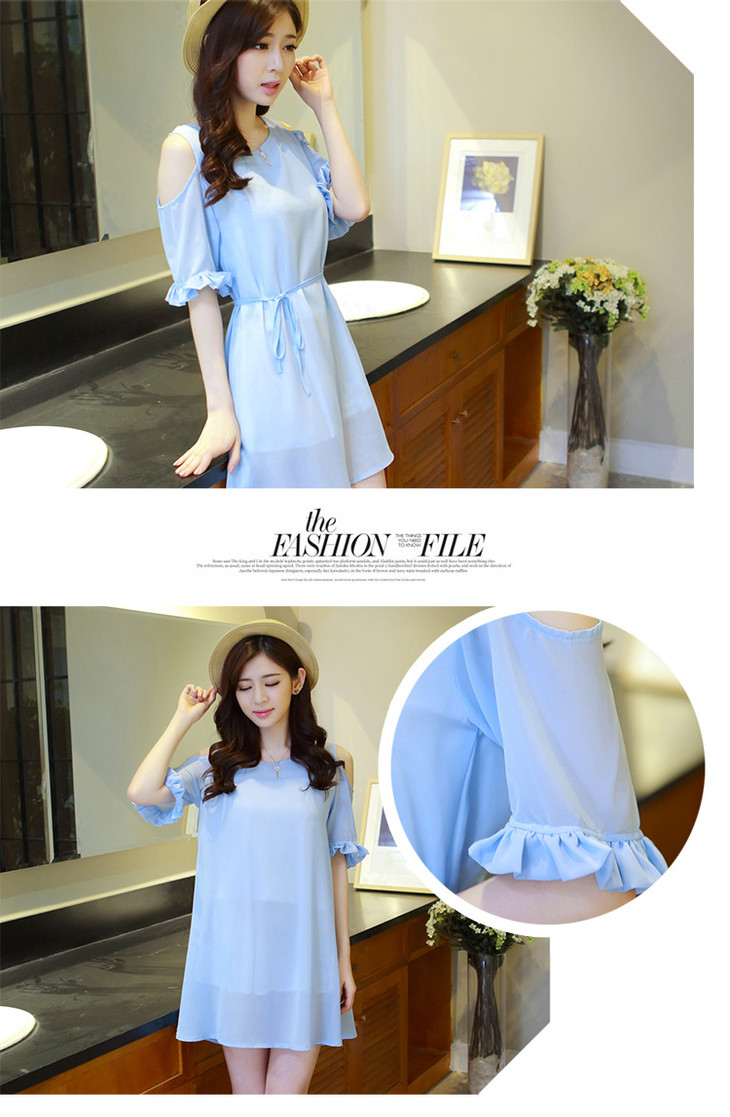 【服饰鞋包】夏季新款韩版荷叶边露肩女雪纺连衣裙纯色大码显瘦A字裙 商品图3