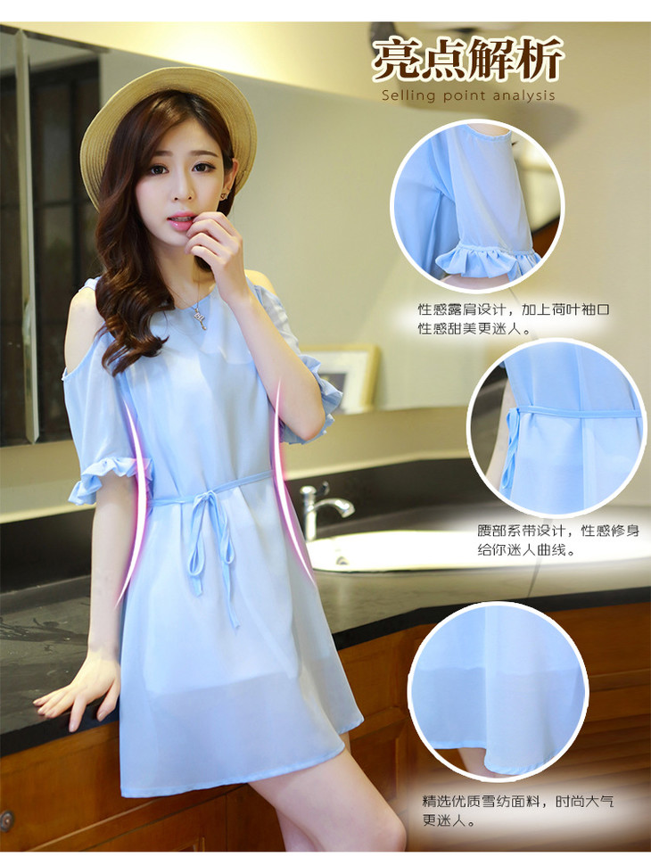 【服饰鞋包】夏季新款韩版荷叶边露肩女雪纺连衣裙纯色大码显瘦A字裙 商品图2