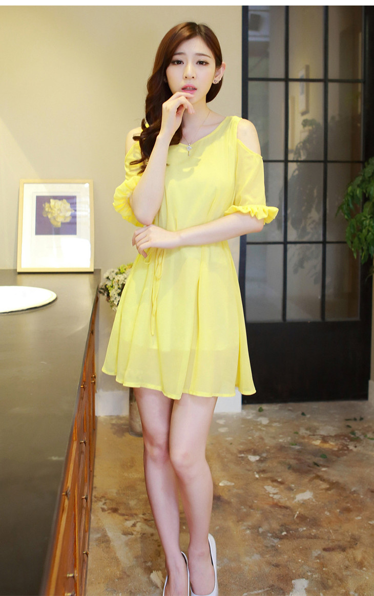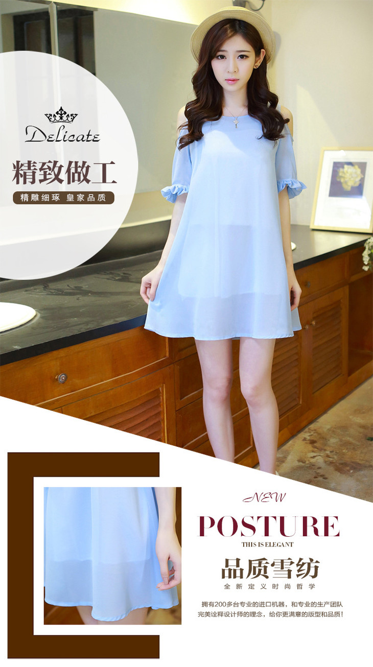 【服饰鞋包】夏季新款韩版荷叶边露肩女雪纺连衣裙纯色大码显瘦A字裙 商品图0
