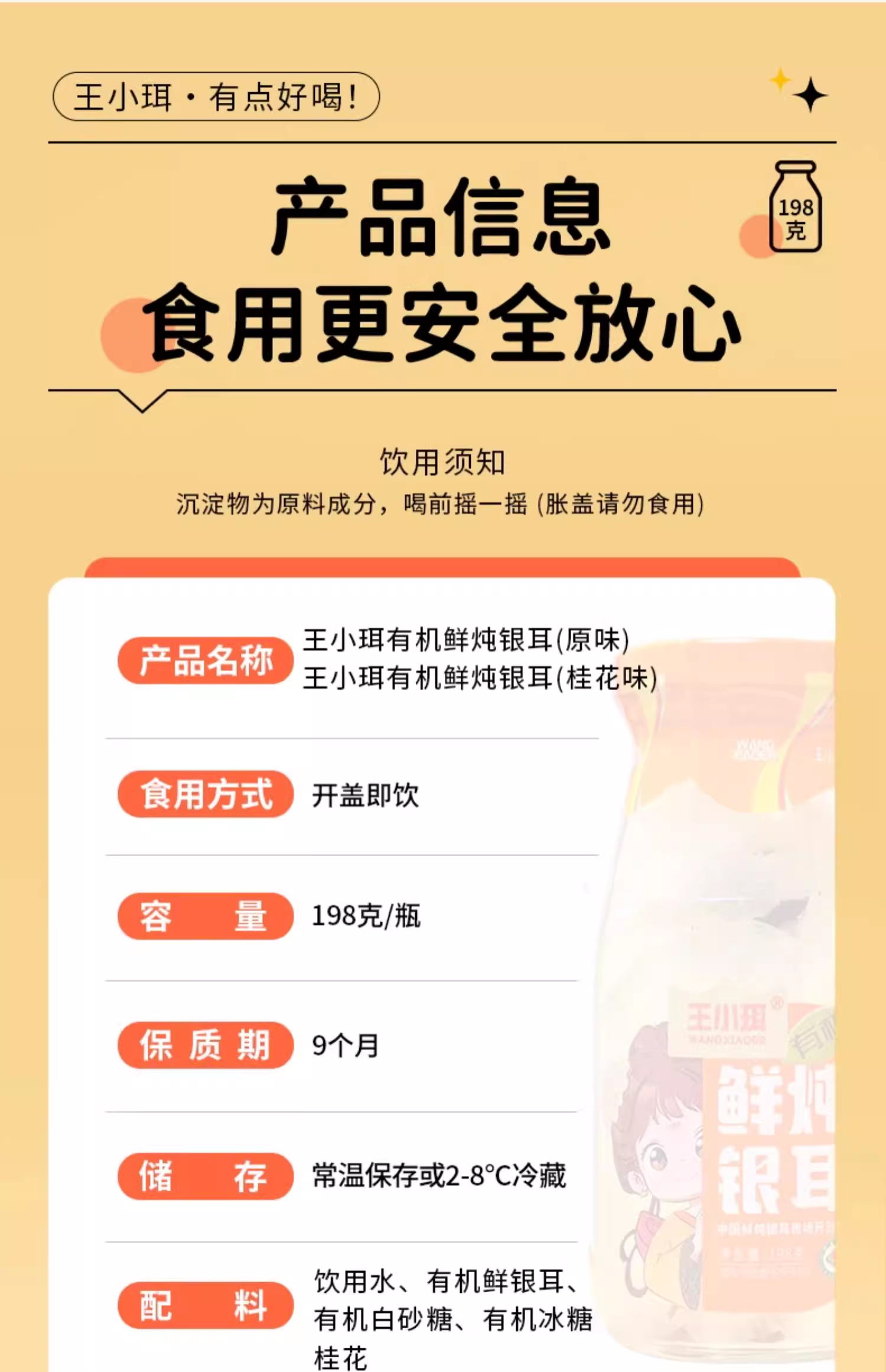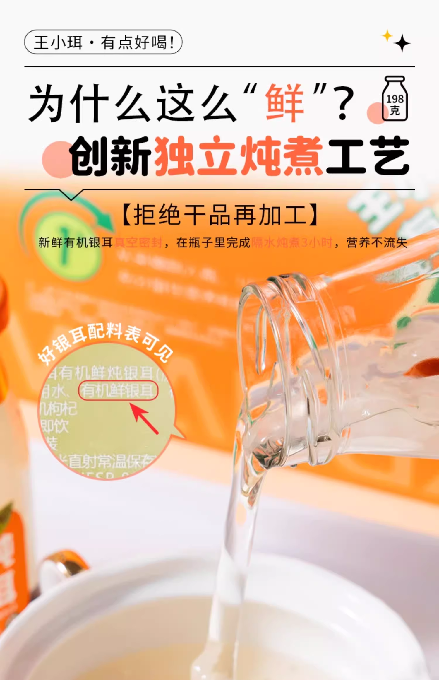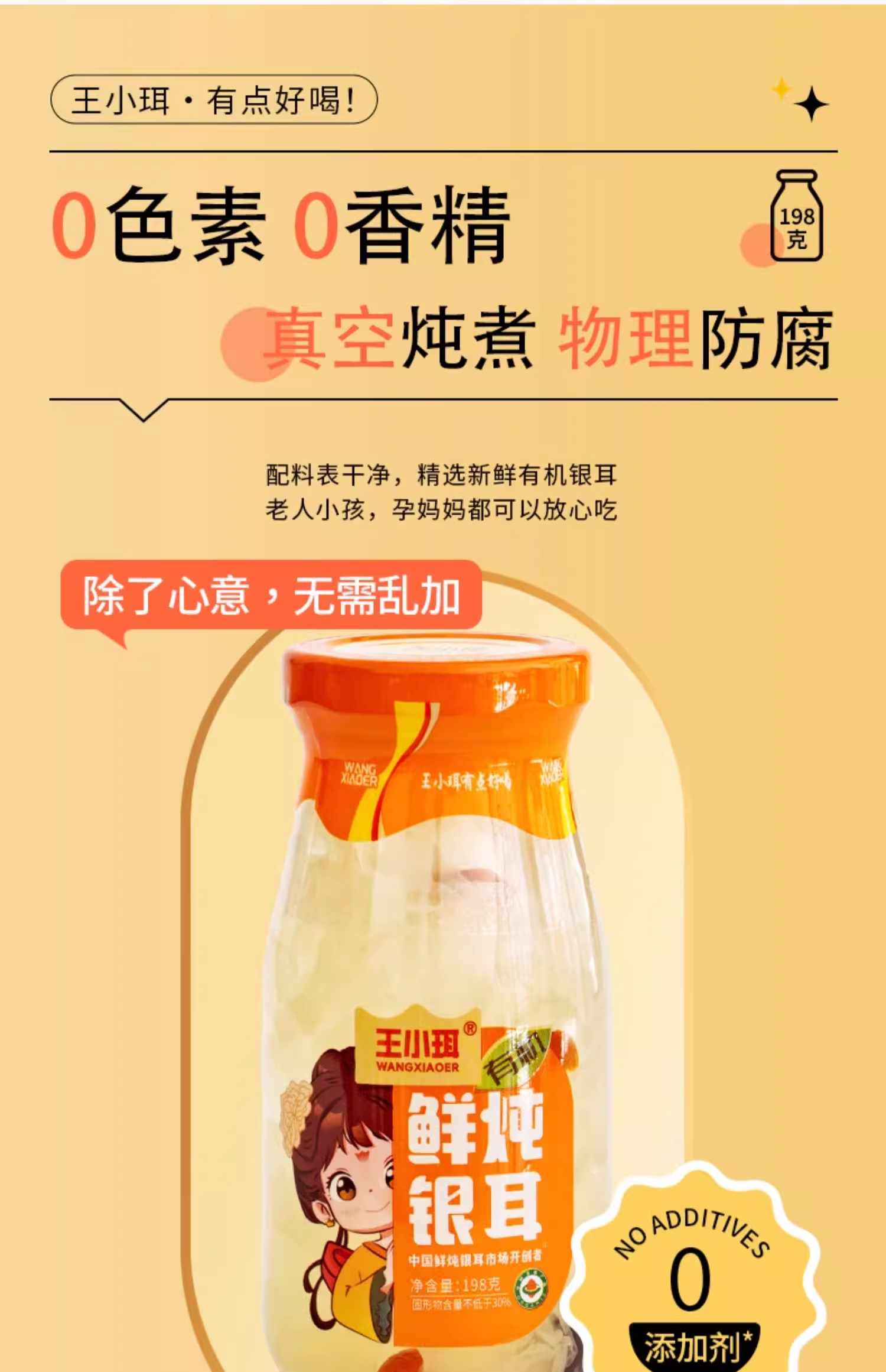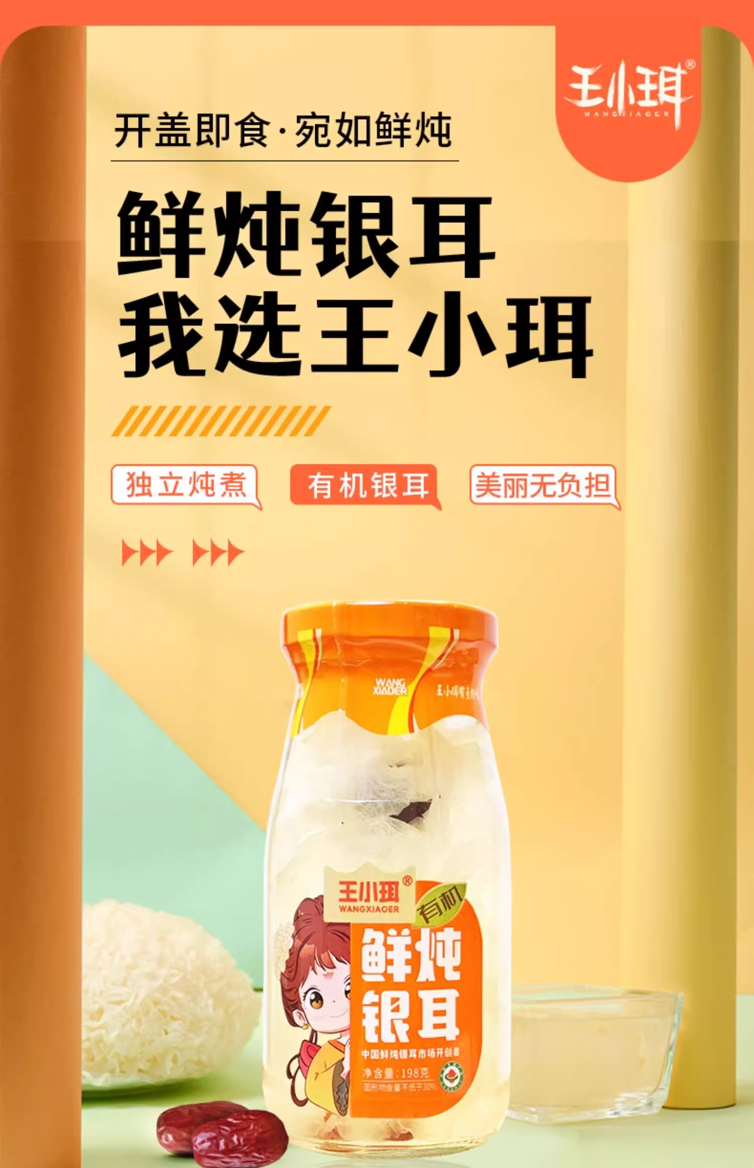 【1件起全国包邮】王小珥 鲜炖有机银耳羹 即食免煮瓶装0脂肪(198g*6瓶*1箱)