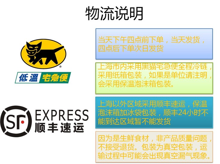 物流说明:上海采用黑猫宅急便全程冷链配送,外地采用顺丰生鲜速配,顺丰次日不能到达区域不发货。江浙沪全场肉品满500元免运费,外地肉品满500元减25元运费。