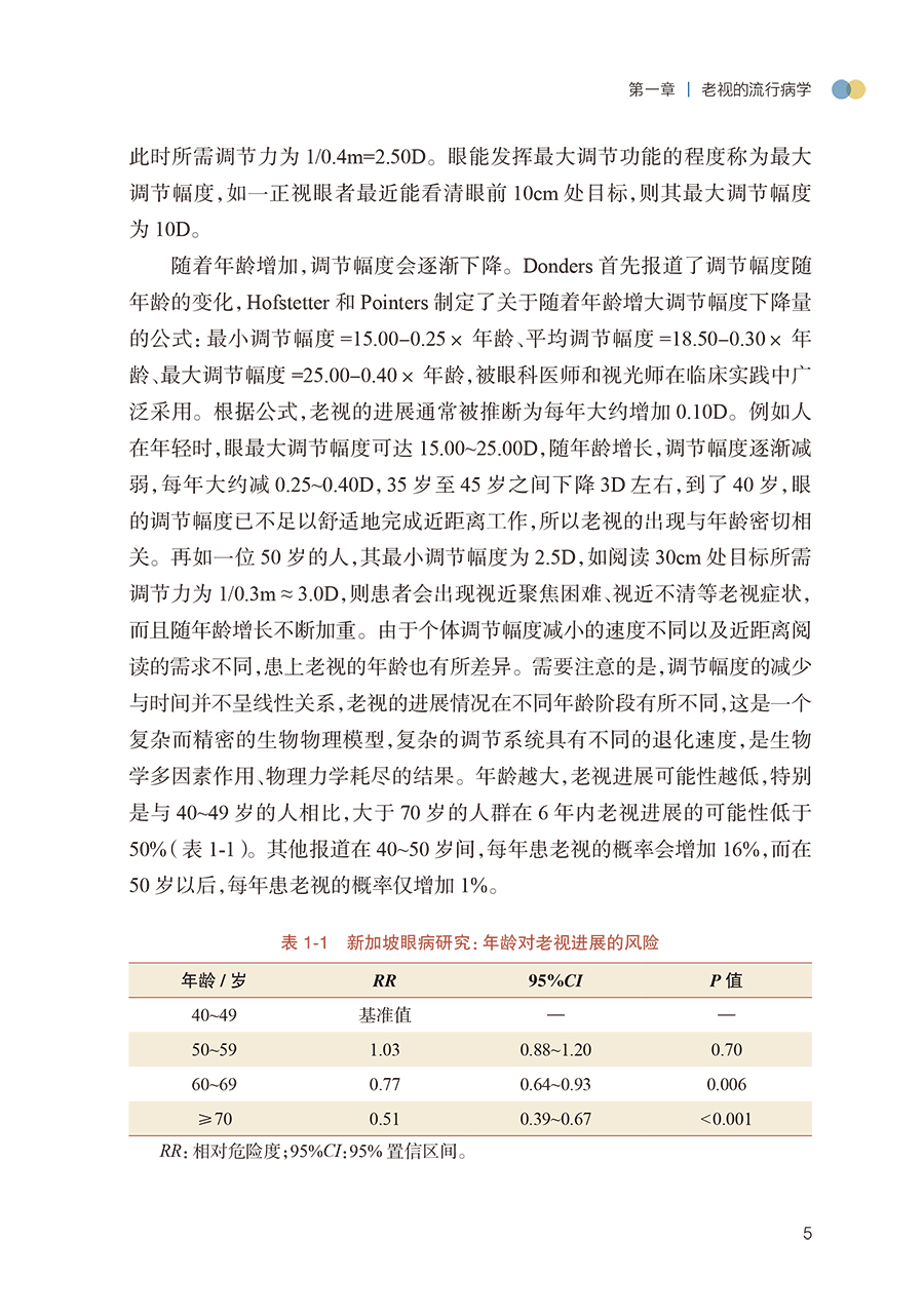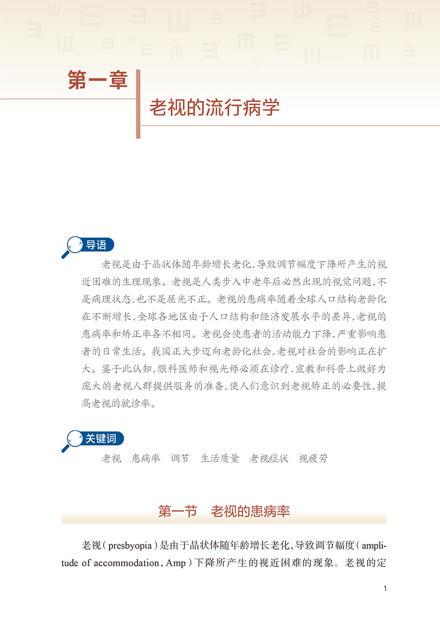 本书分为三个部分,包括老视的机制、老视临床特点和矫正方法、老视的心理和社会经济学三方面内容。老视临床特点和矫正方法是本书的重点,包括配镜、手术和药物三种处理方法。本书旨在为临床医生提供老视诊断和矫正方式的指导。本书从老视流行病学出发,详细分析了老视的患病率、患者的生活质量以及影响老视发生及其程度的相关因素,不仅涵盖了视觉症状和视觉检查,还详细介绍了老视的检测方法。治疗方面介绍了老视的矫正方法,包括框架眼镜矫正、角膜接触镜矫正、调节训练、手术矫正以及药物治疗,系统梳理了各种矫正方法的原理、发展和适用范围,并结合大量图片介绍代表性的临床案例,对不同的矫正方式的特点进行了比较,为患者个性化选择合适的矫正方案提供了科学指导。