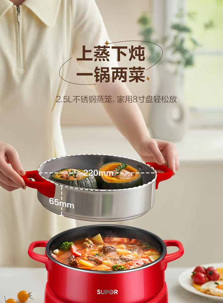苏泊尔(SUPOR)3L家用多功能锅电火锅分体式设计1300W大功率上蒸下煮电火锅H22YKX55A