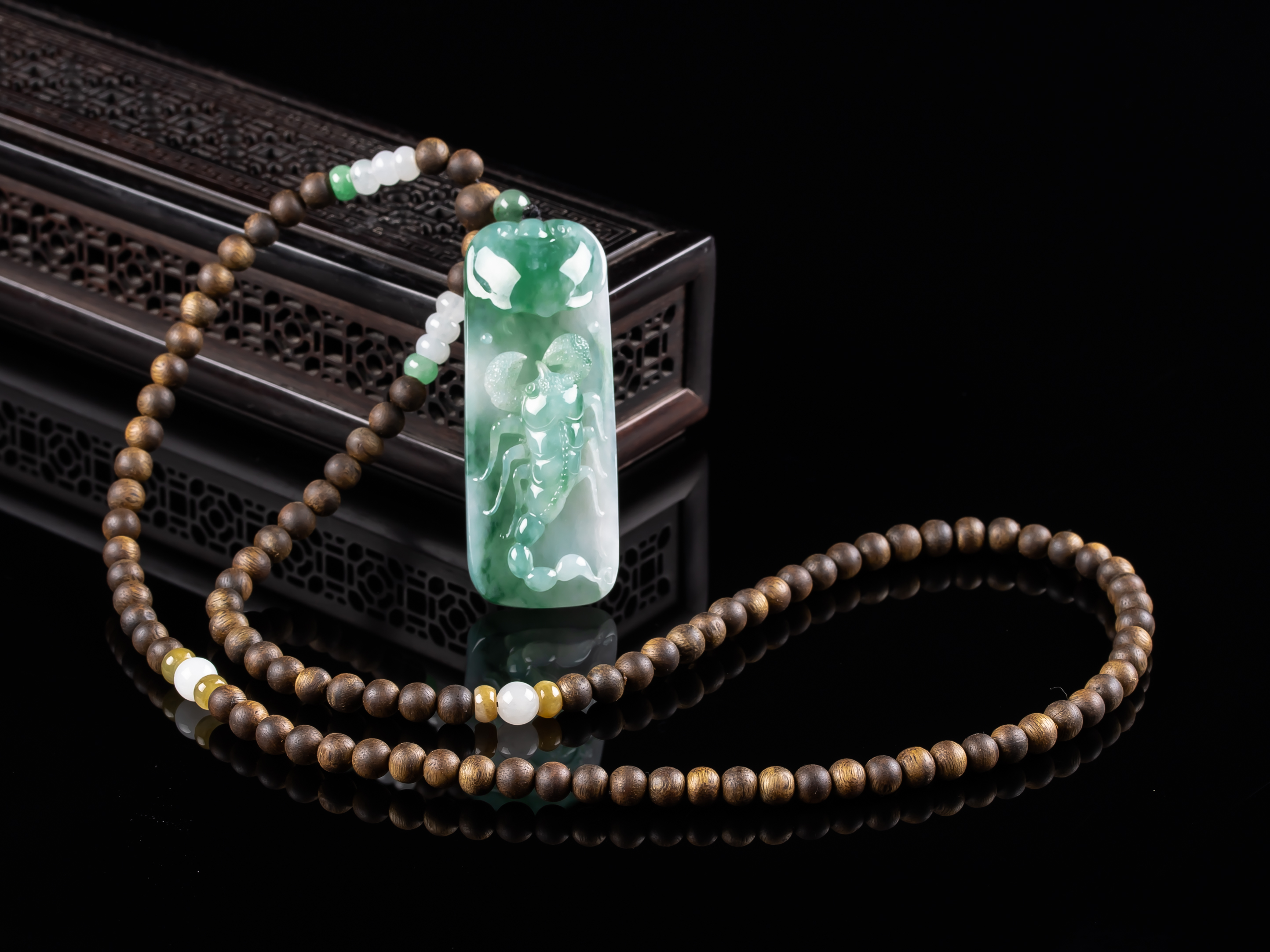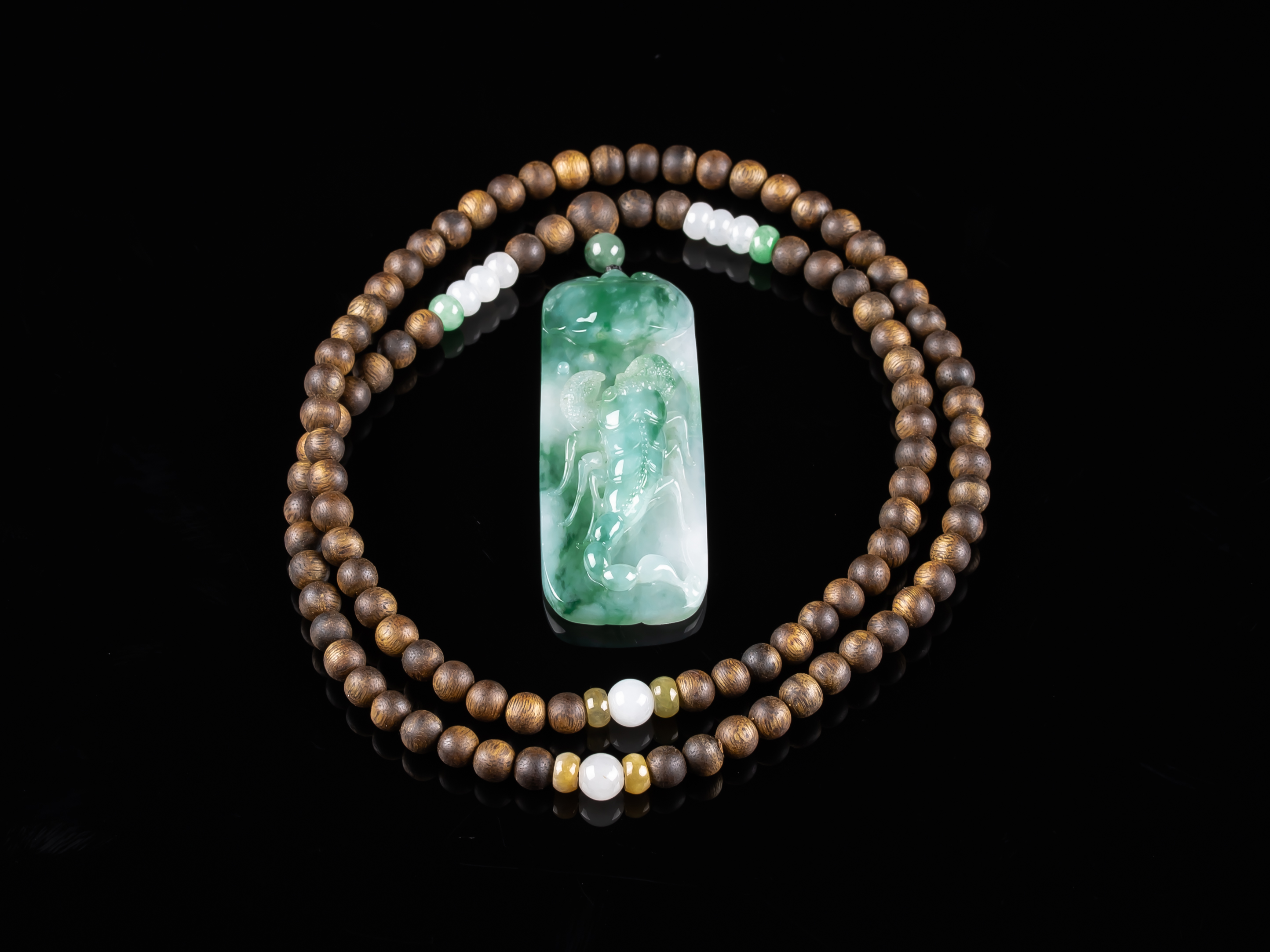 原创沉香+翡翠蝎子挂件,天然沉香圆珠6.4mm,原色原味,香味清甜自然,配珠:翡翠。冰糯底飘蓝花的翡翠大蝎子,雕刻精细,立体饱满威武,66*25.5*13.7mm,独甲一方、辟邪趋吉。