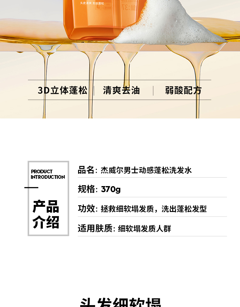 杰威尔男士动感蓬松控油去屑止痒清洁洗发水洗发露洗头液370g
