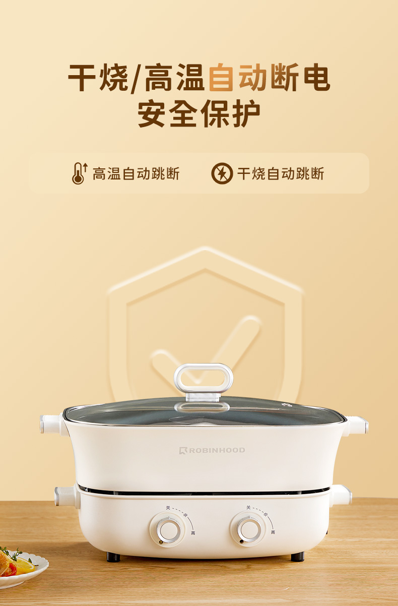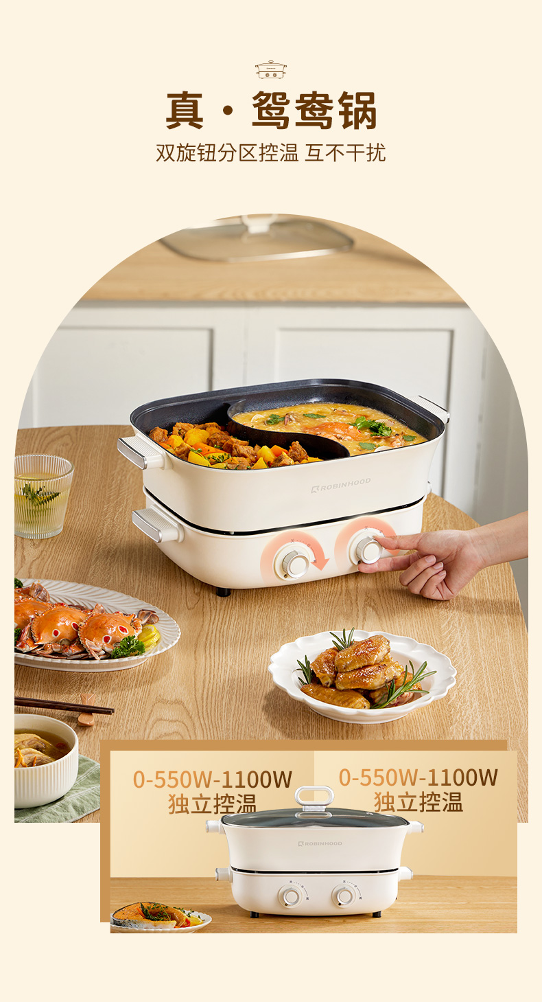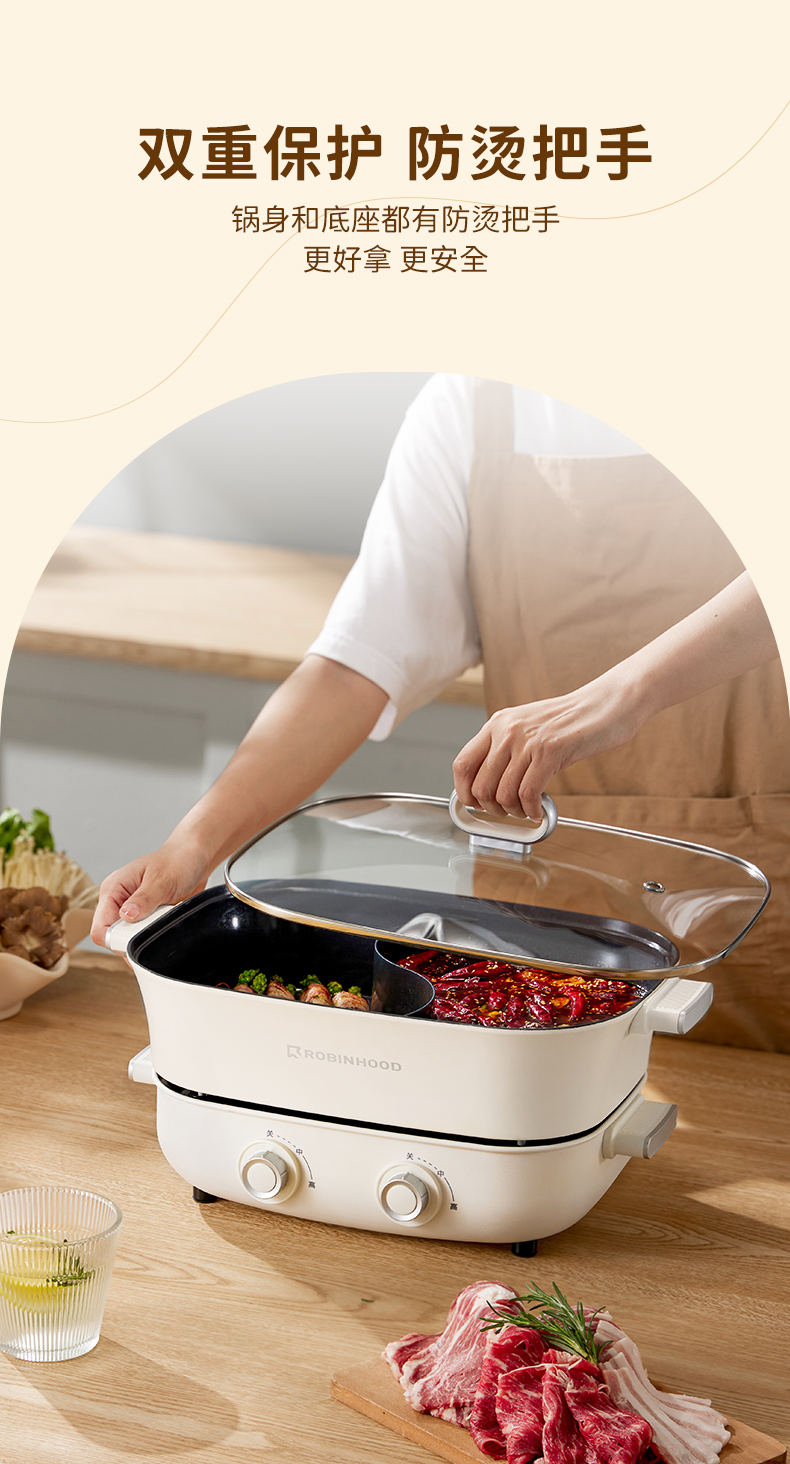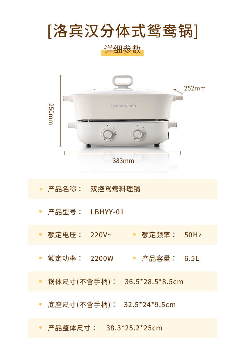 【文怡之选】洛宾汉 分体式鸳鸯锅LBHYY-01 电火锅 6.5L大容量 8.5CM锅深 双旋钮分区控温 一锅多用