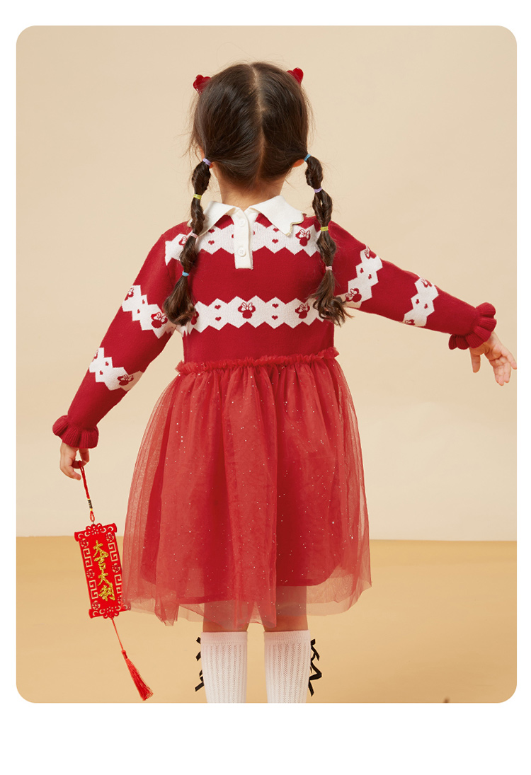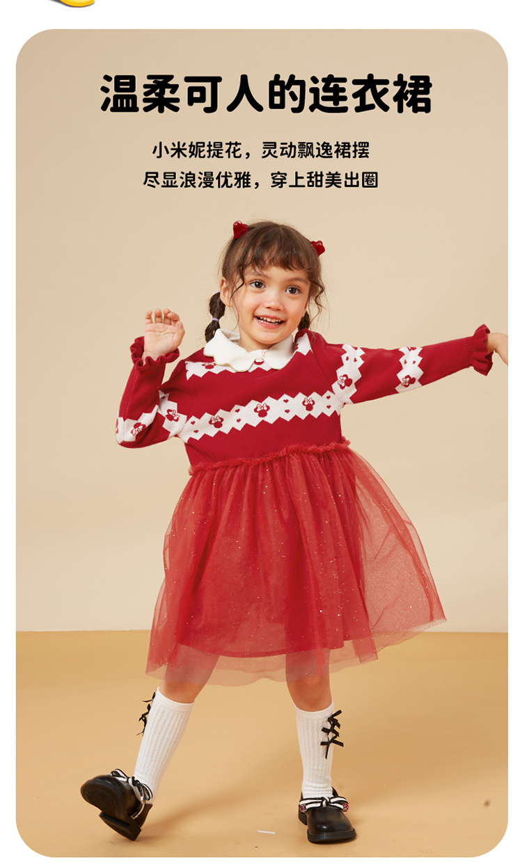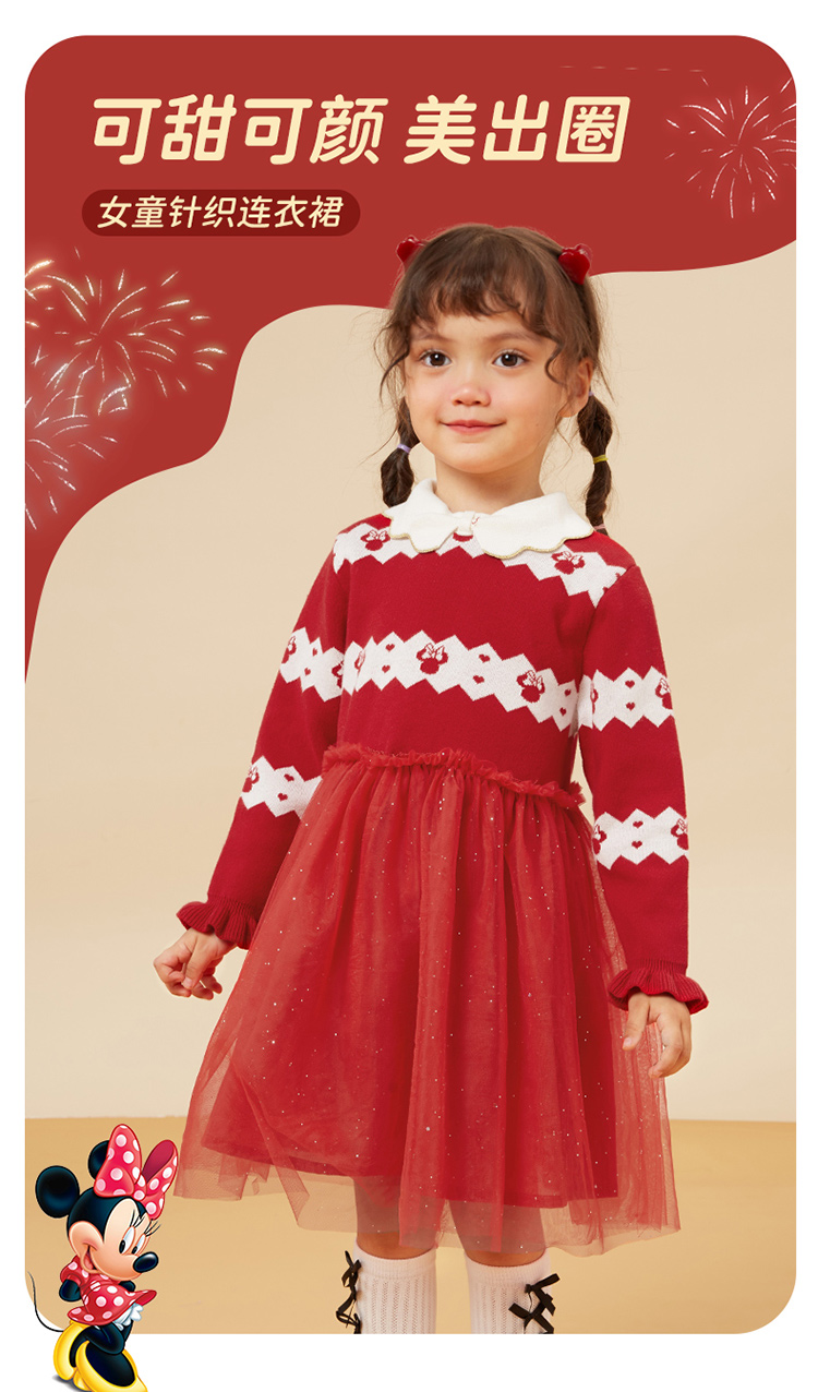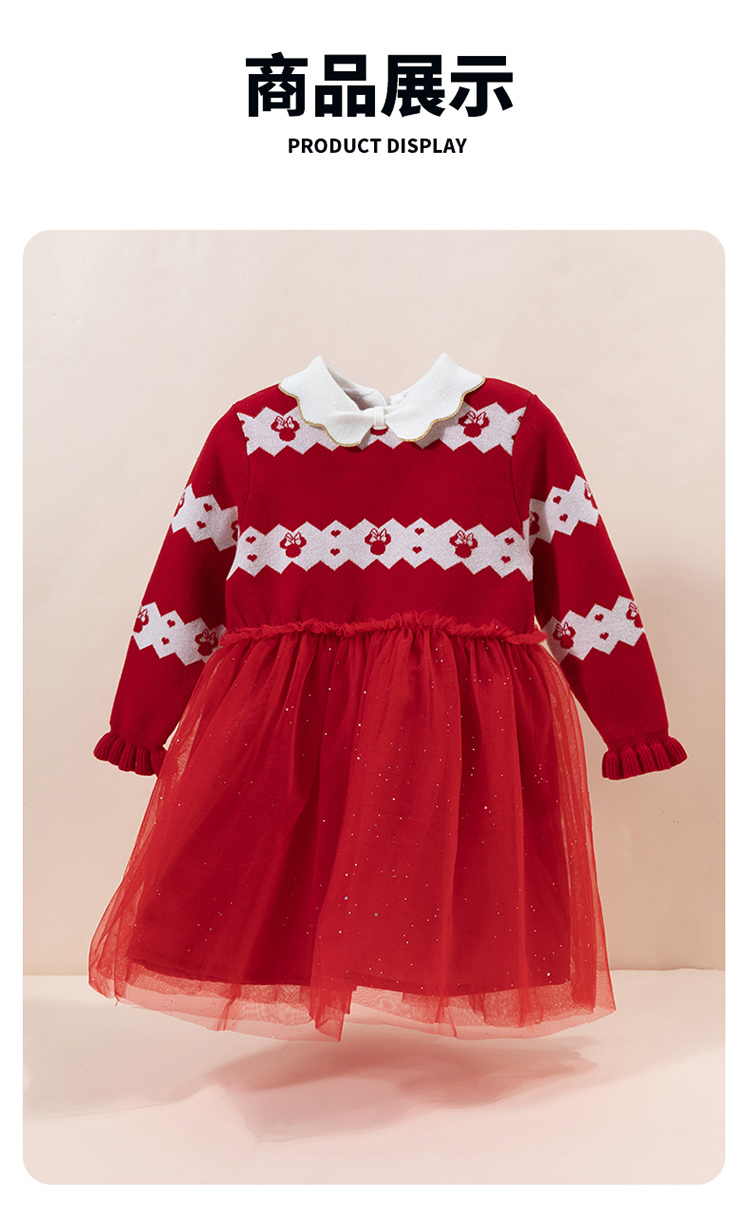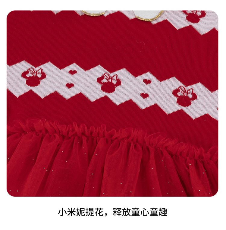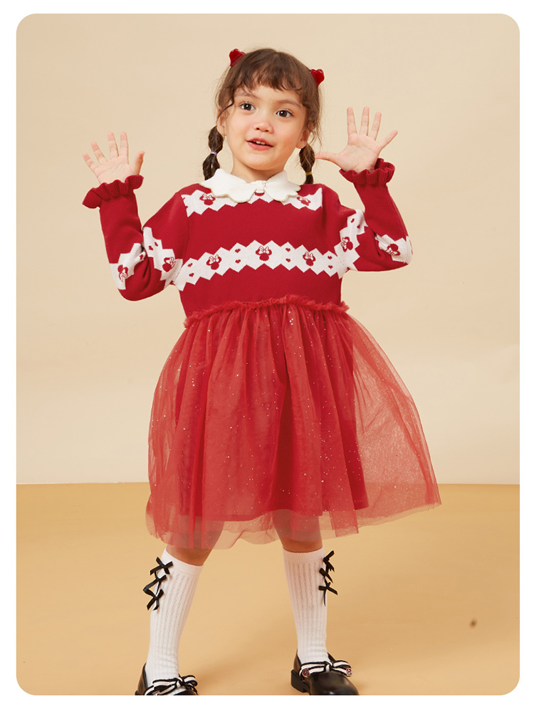 秋冬女童针织连衣裙米妮条纹印花大红公主裙百搭拜年233Q824