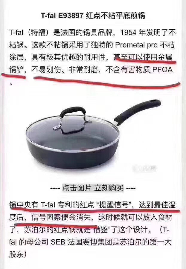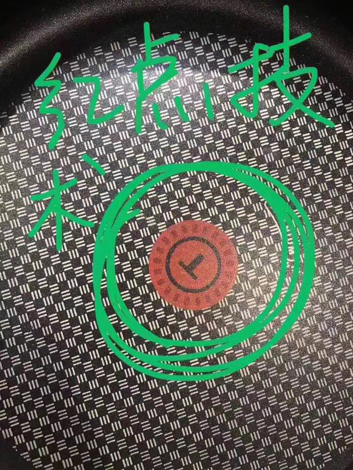 2️⃣锅中央有T-fal 专利红点 “提醒信号”,达到最佳温度后,信号图案会变化,这时候就可以放入食材了,苏泊尔的红点锅就是“借鉴”了这个设计。