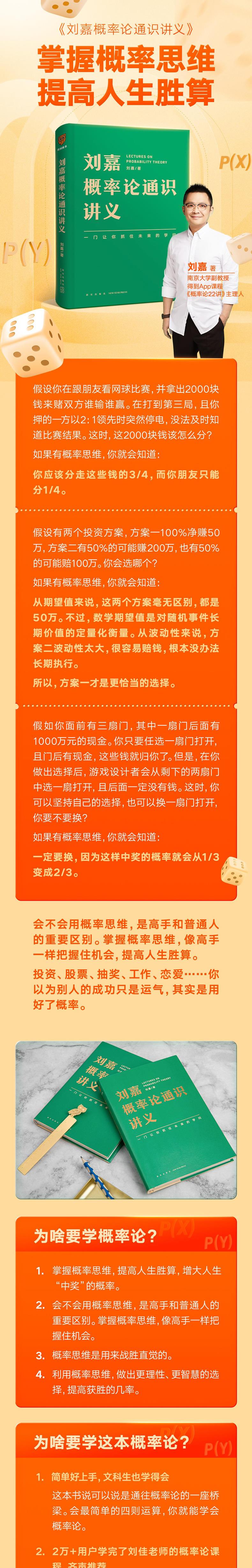 概率论的本质上面的故事虽然是我虚构的,但却从本质上揭示了概率论解决问题的思维框架。澳大利亚网球公开赛男单决赛的第四局谁会赢,我不知道;最后谁拿冠军,我也不知道。就像抛硬币时下一次是正面还是反面,掷骰子时下一把是什么数字,明天的股票会涨还是会跌,买的彩票会不会中奖这些事情一样,它们的结果都是随机的,是不可预测的。但在停电的这个当下,我们如何分这200块钱,却是确定无疑的。概率论解决随机问题的本质,就是把局部的随机性转变为整体上的确定性。这不仅是概率论的思想基石,也是概率论作为一种数学工具的基本思路。有了概率论,我们就能对生活中随机的事情,对未来发生的随机的事情,做出数学上确定性的判断。我们都知道量子力学中那只和HelloKitty齐名的薛定谔的猫,我们不知道那只猫下一秒是生还是死,但它生死可能性的叠加态是确定的;我们不知道对冲基金明天会涨还是会跌,但在基金公司的模型里,套利收益的预期是确定的......