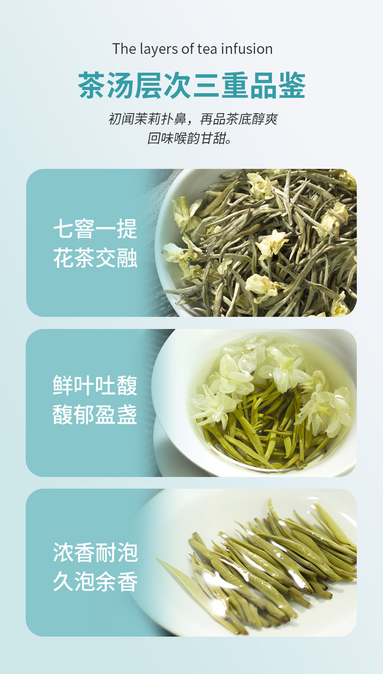 3、外观白毫尽披,芽头肥壮,颗颗树立;入口柔顺,滋味清甜,舌面回甘甜润;汤色嫩黄明亮,通透;茉莉花香气鲜灵度高,毫香与花香交织持久,杯底香气依旧萦绕不散