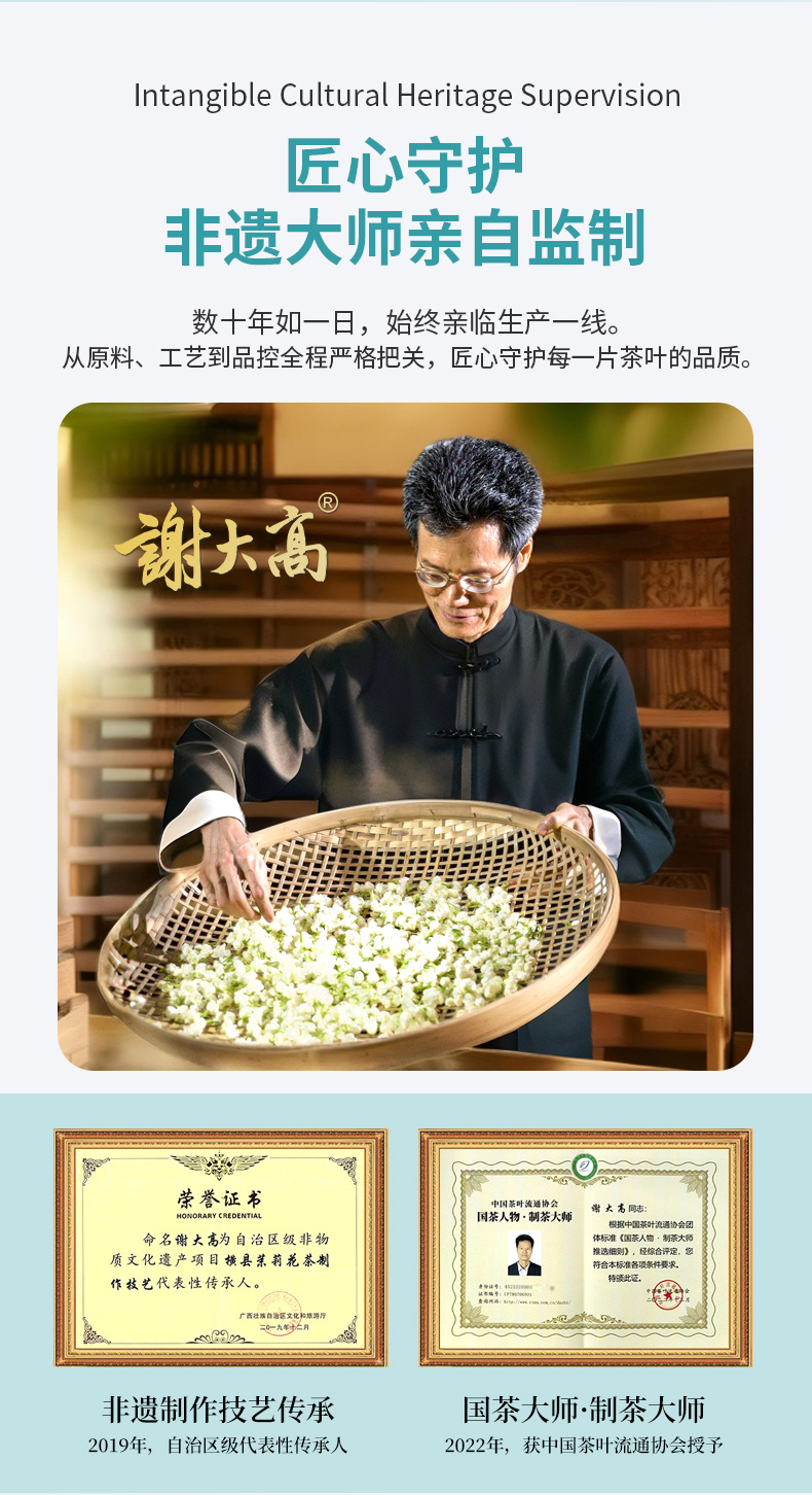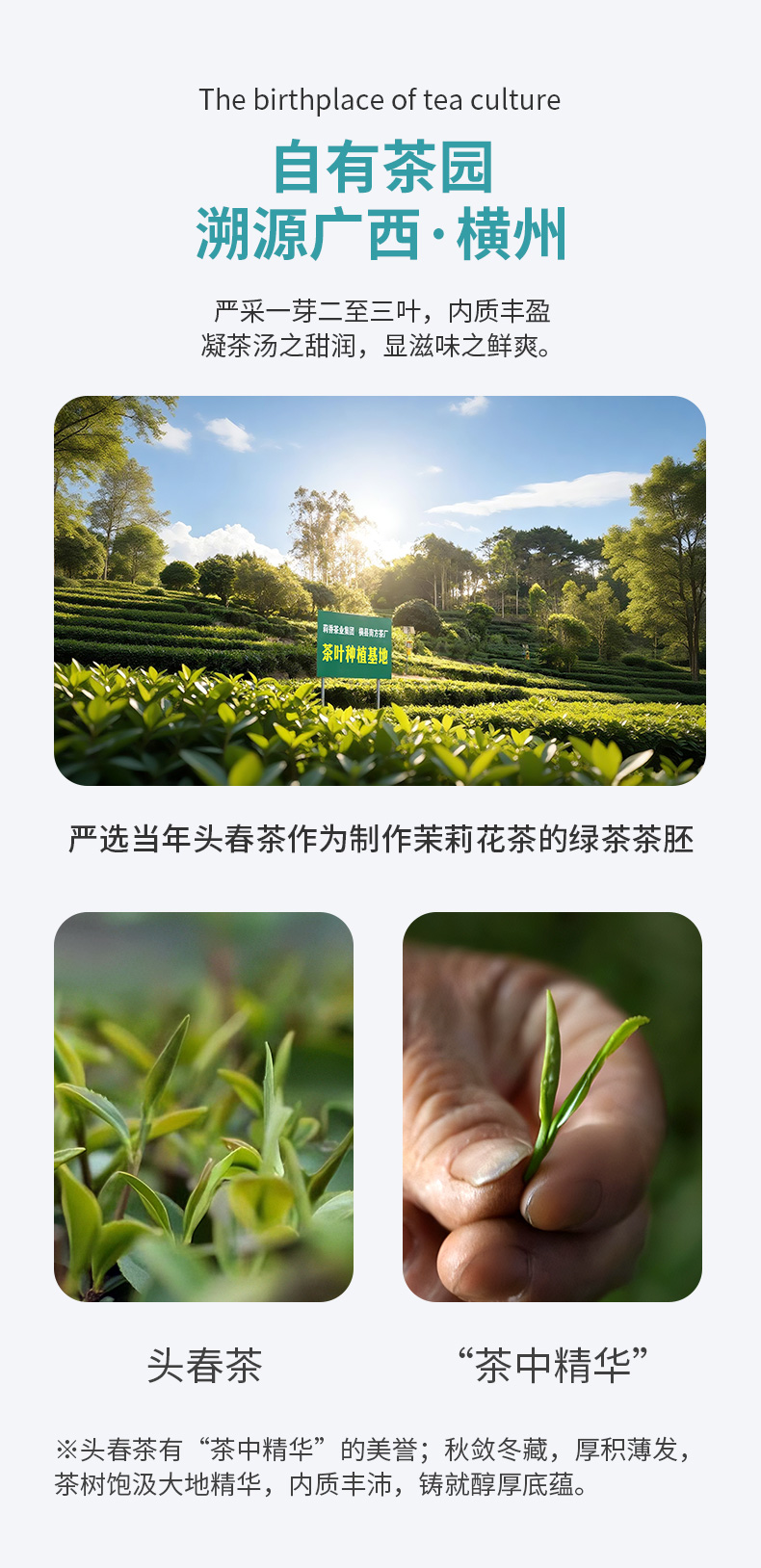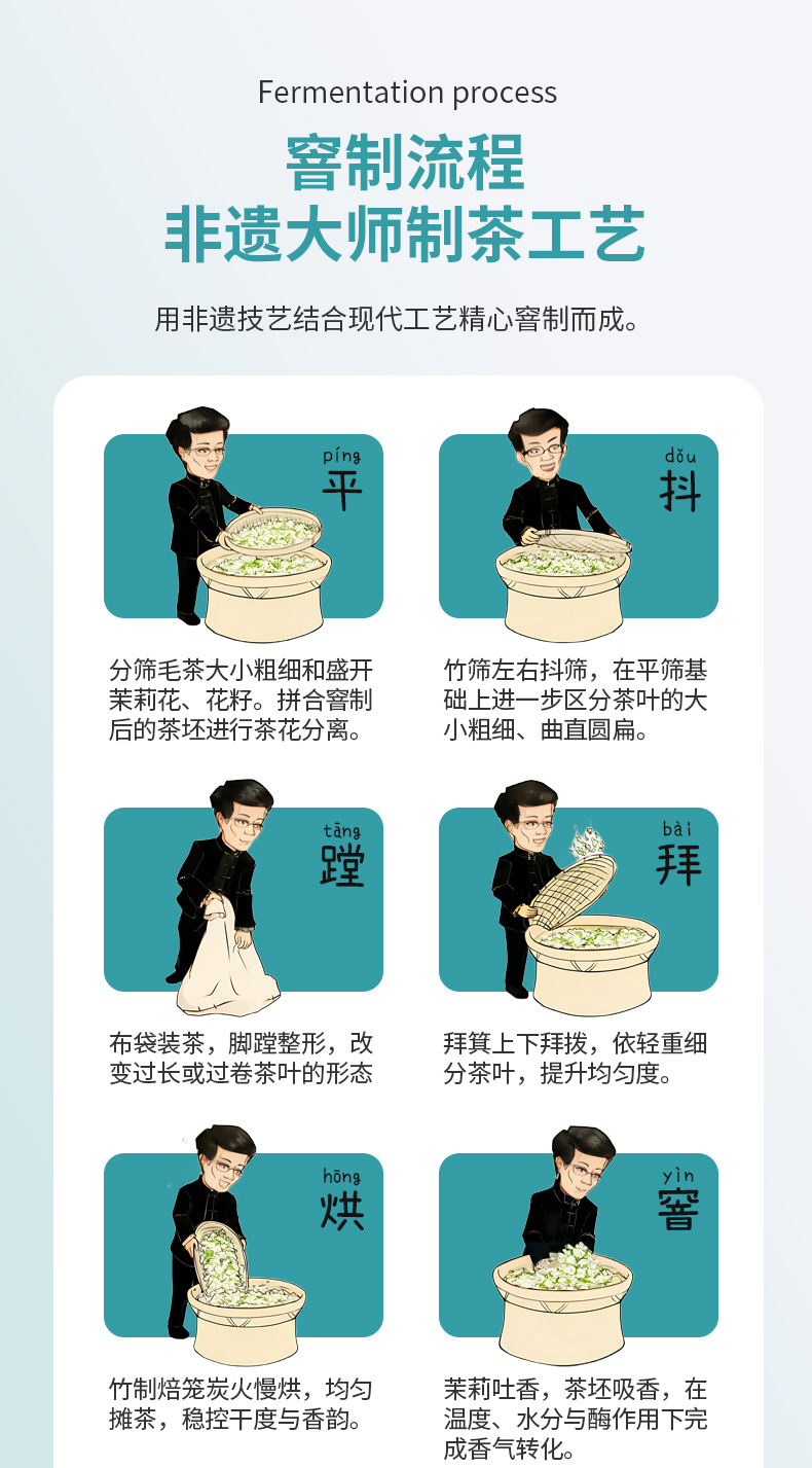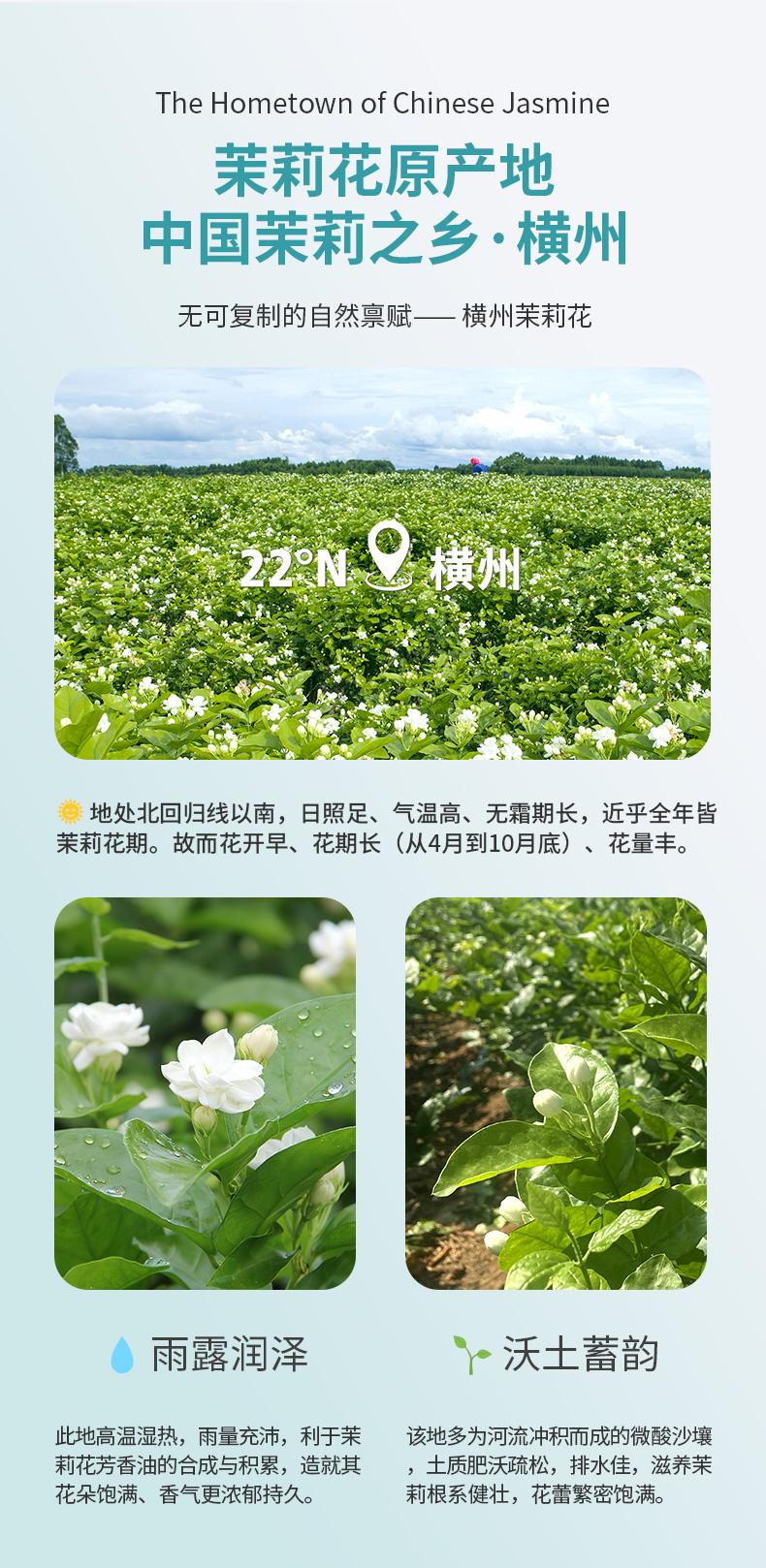 2、茉莉花只选用横县伏天花,采摘午后朵大饱满、含苞欲放的鲜花,这样的茉莉花花香浓郁悠长,香气纯正,花朵水分低,与茶胚窨制结合,能让茶胚更充分吸收花香,品质稳定。