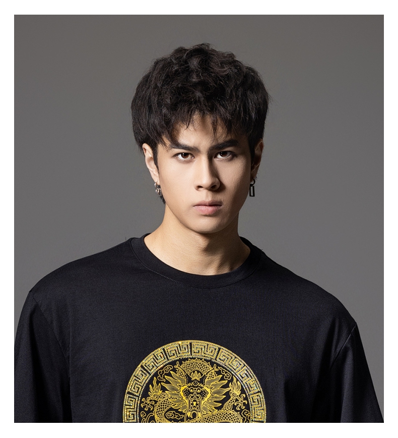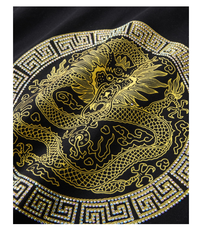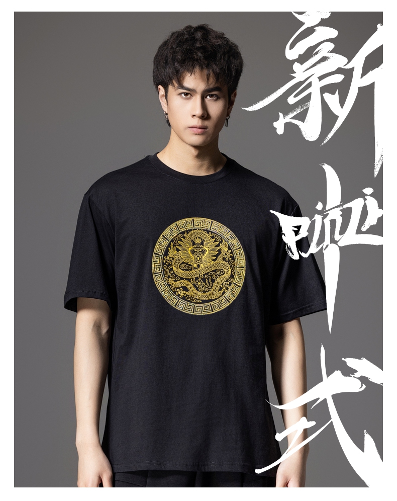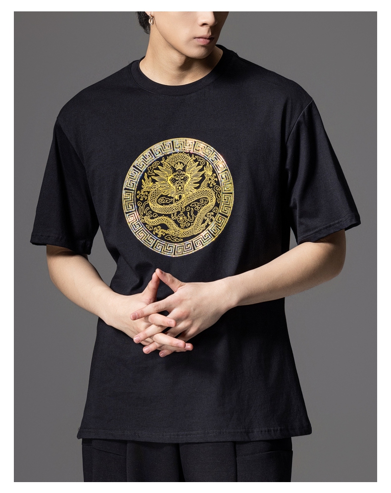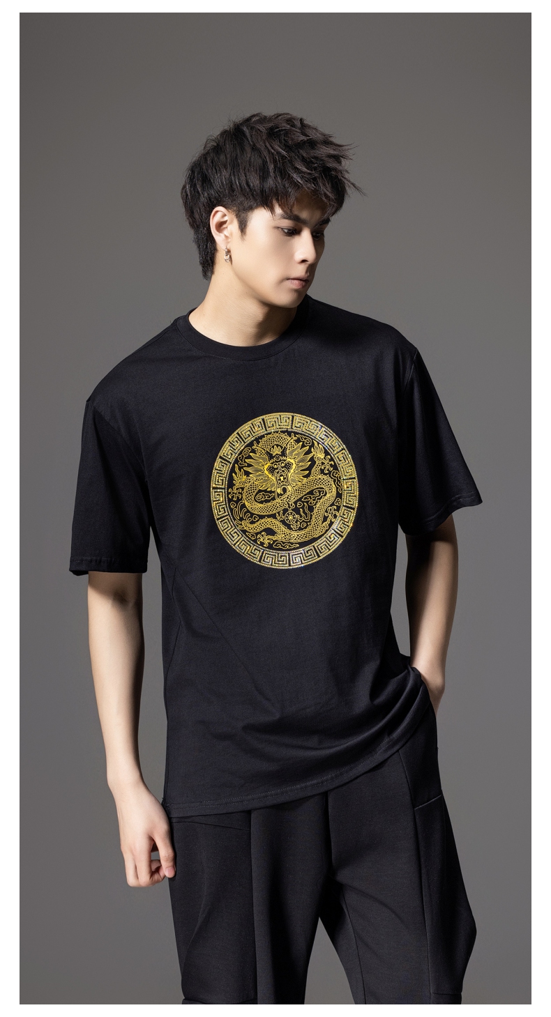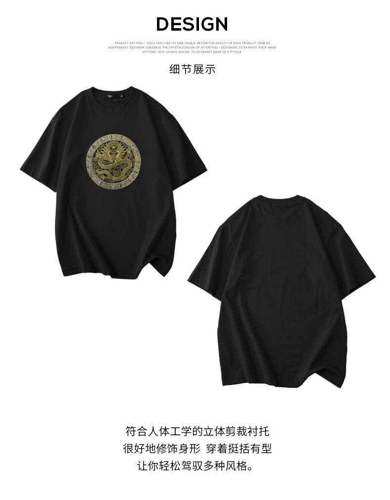 PINLI品立新中式2024夏季新款盘龙印花烫钻短袖T恤男国潮圆领上衣BG242111015
