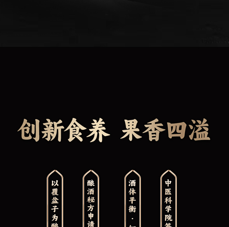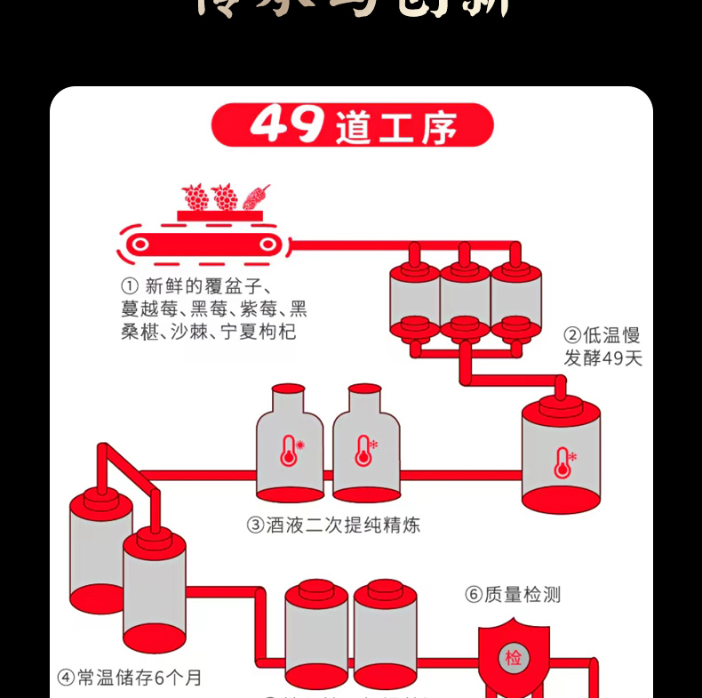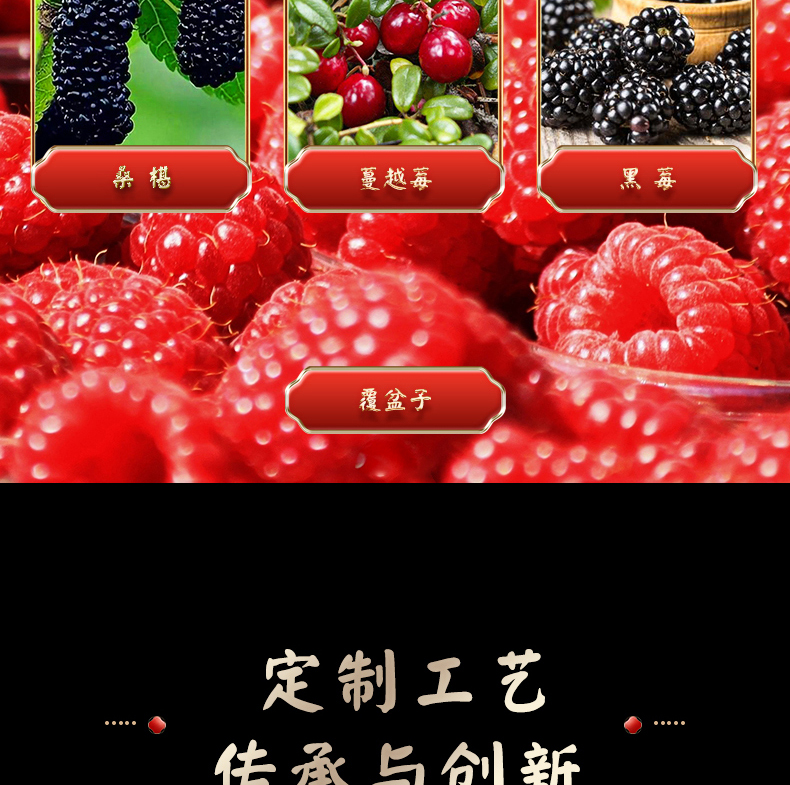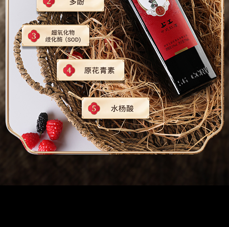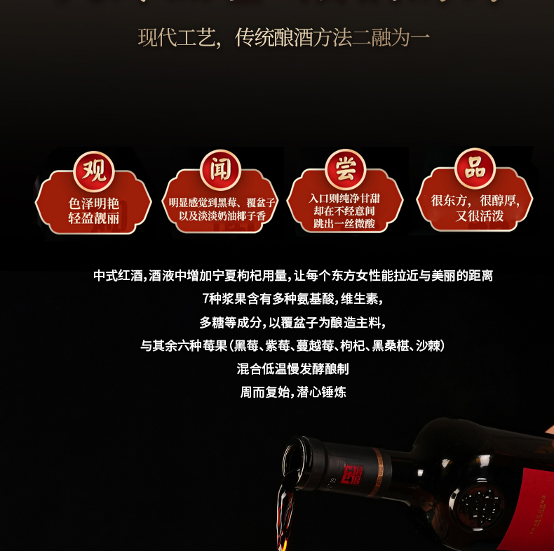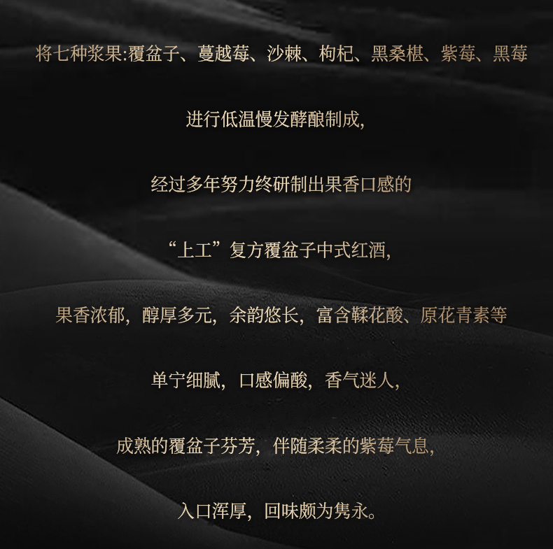 它的酿酒原料精心挑选七种上乘酱果,有宁夏枸杞、黑龙江蔓越莓、黑龙江覆盆子、内蒙古沙棘、河南黑莓、吉林紫莓、河北黑桑葚等,都是来自全国各地地理标志性物品。