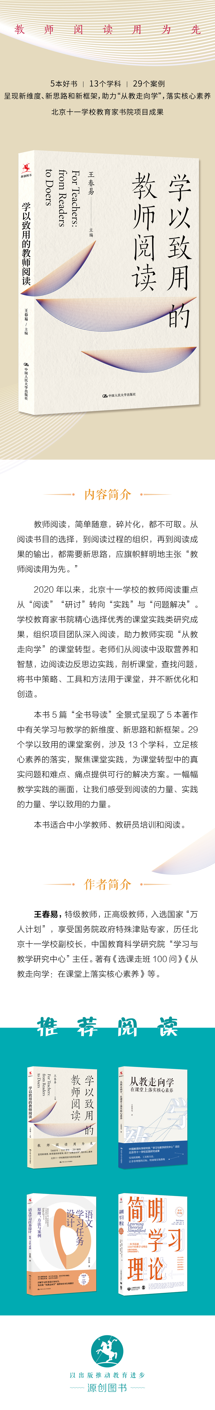 北京十一学校教育家书院精心选择5本好书,组织项目团队深入阅读,跨学科研讨,通过5篇全书导读、13个学科29个学以致用的案例,呈现5本书中有关学习与教学的新维度、新思路和新框架,助力教师实现“从教走向学”,落实核心素养。