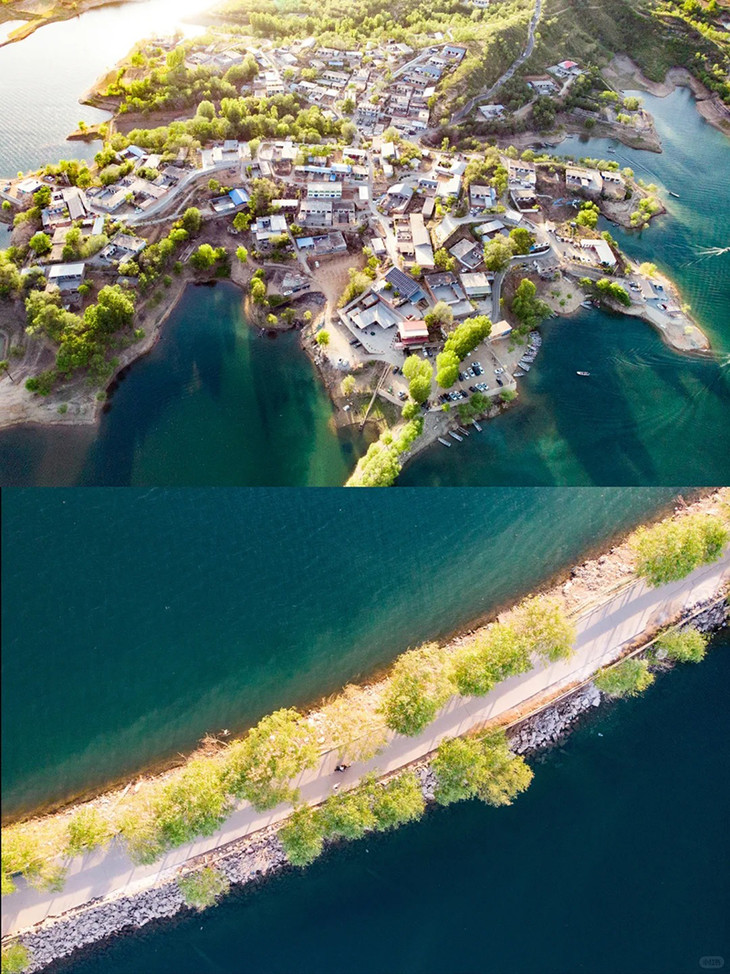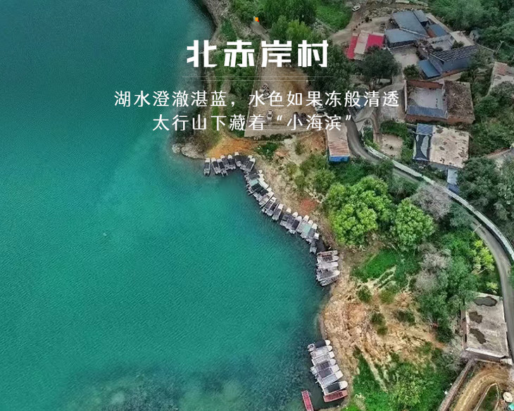 北赤岸村坐落于王快水库北岸,是公认的 “太行小马尔代夫” 核心网红打卡地。这里湖水澄澈湛蓝,水色如果冻般清透,湖岸线蜿蜒曲折,与连绵青山相映成趣,随手一拍都是海岛大片。必打卡 水上公路(水位较低时可穿行、踩水)、临湖沙滩、蓝色湖面观景台,无人机视角下宛如大海嵌入太行。可沿湖漫步、露营野餐、拍逆光人像;村民提供小船服务,可登湖心岛探险。无过度商业化,农家院可尝水库鱼、炸虾,原汁原味。春秋湖水最蓝,夏季清凉避暑,日落时分 “橘子海” 氛围感拉满,是京津冀网红湖景 TOP 级点位。