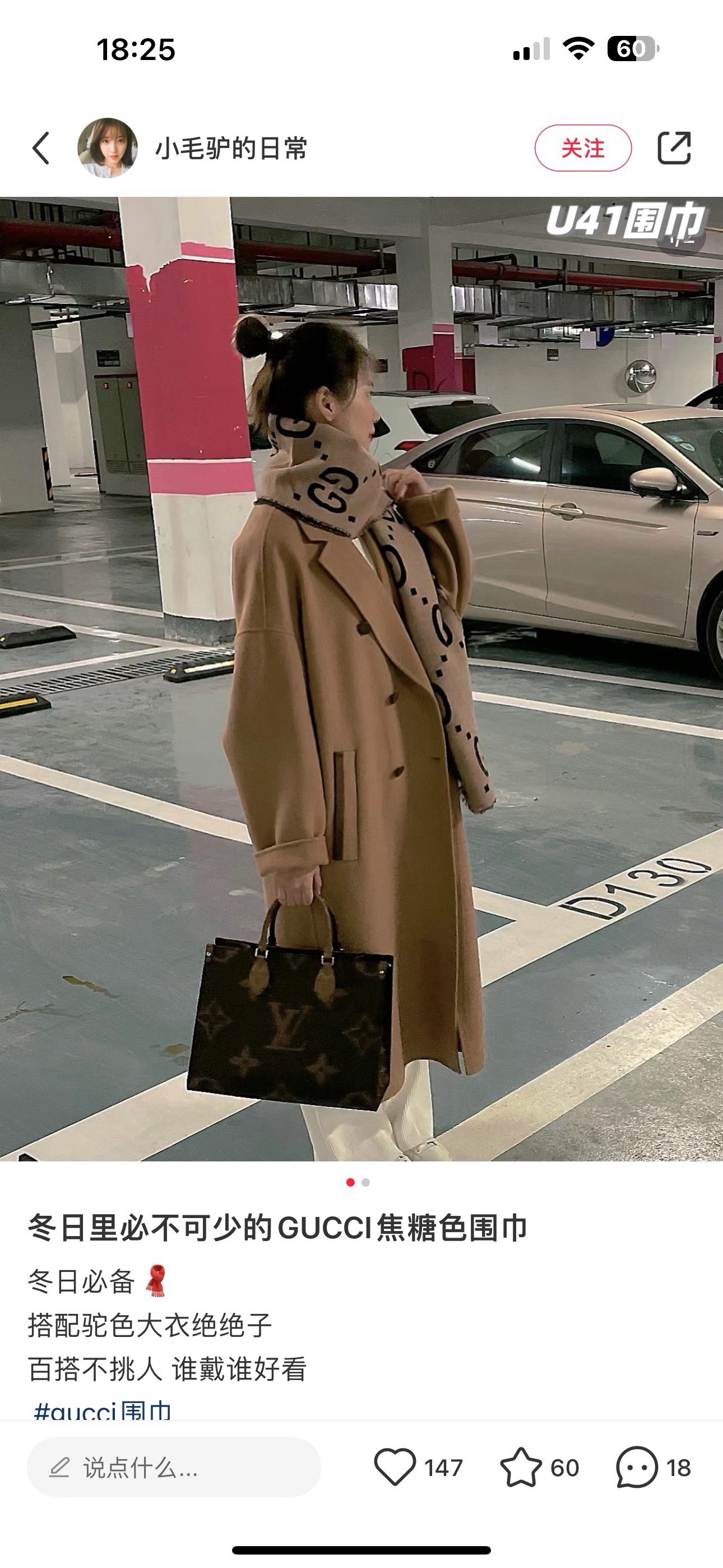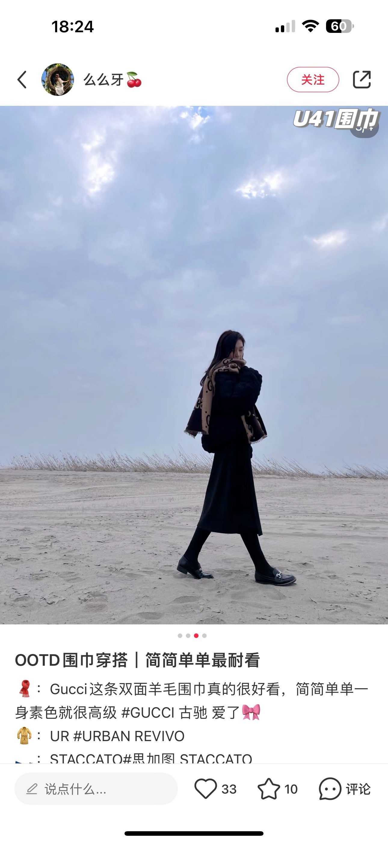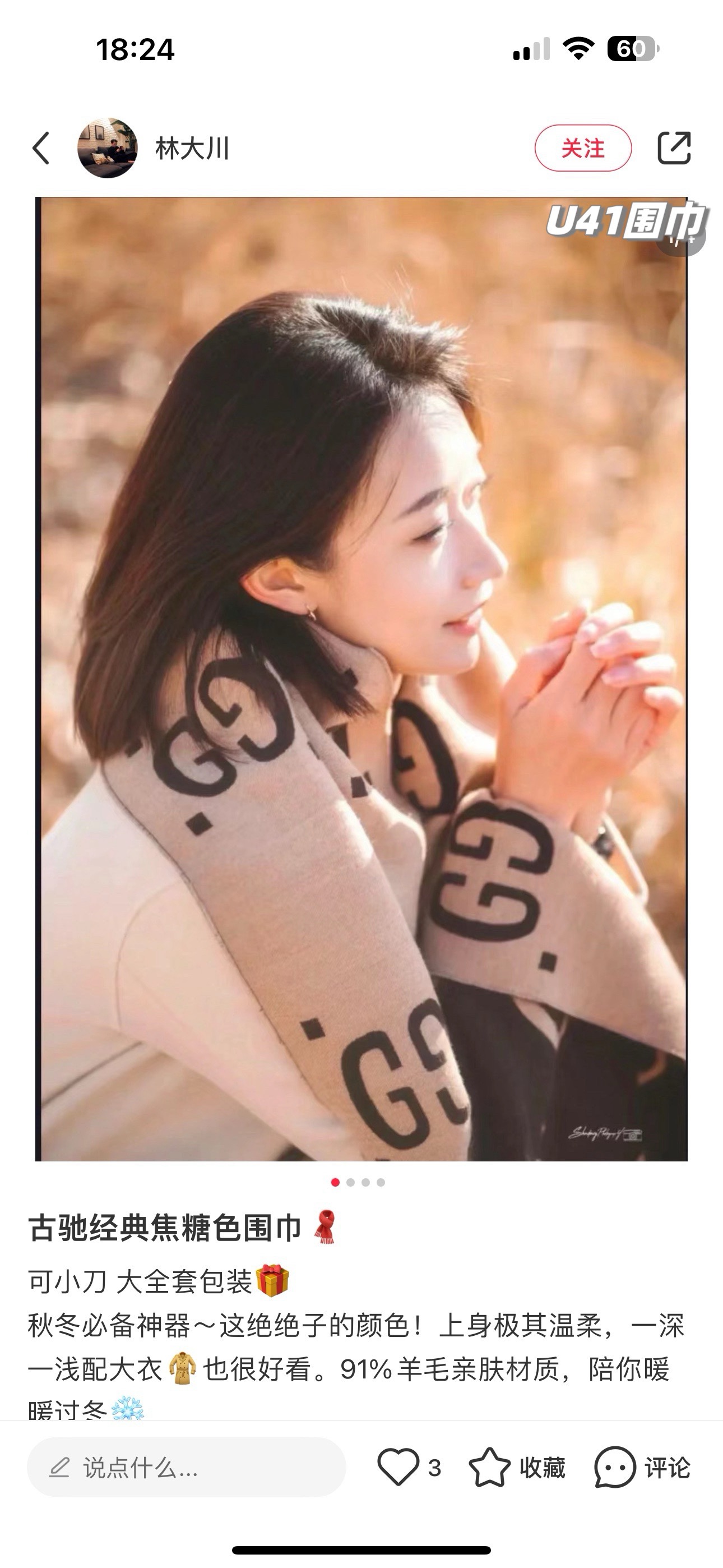 可做情侣款!穿哪件衣服都可以搭,稀罕到骨子里,GG标识作为G家颇具代表性的传统精髓,以饱含新意的现代方式推陈出新,呈现不同凡响的层次、面料手感好,有着羊毛的细腻柔糯感,又有堪比蚕丝的丝滑质感!显白!宽大的尺寸,除了当做围巾,还可以做室内披肩~方便,这几天气温下降,我出门直接当头巾连脖子围上,保暖!