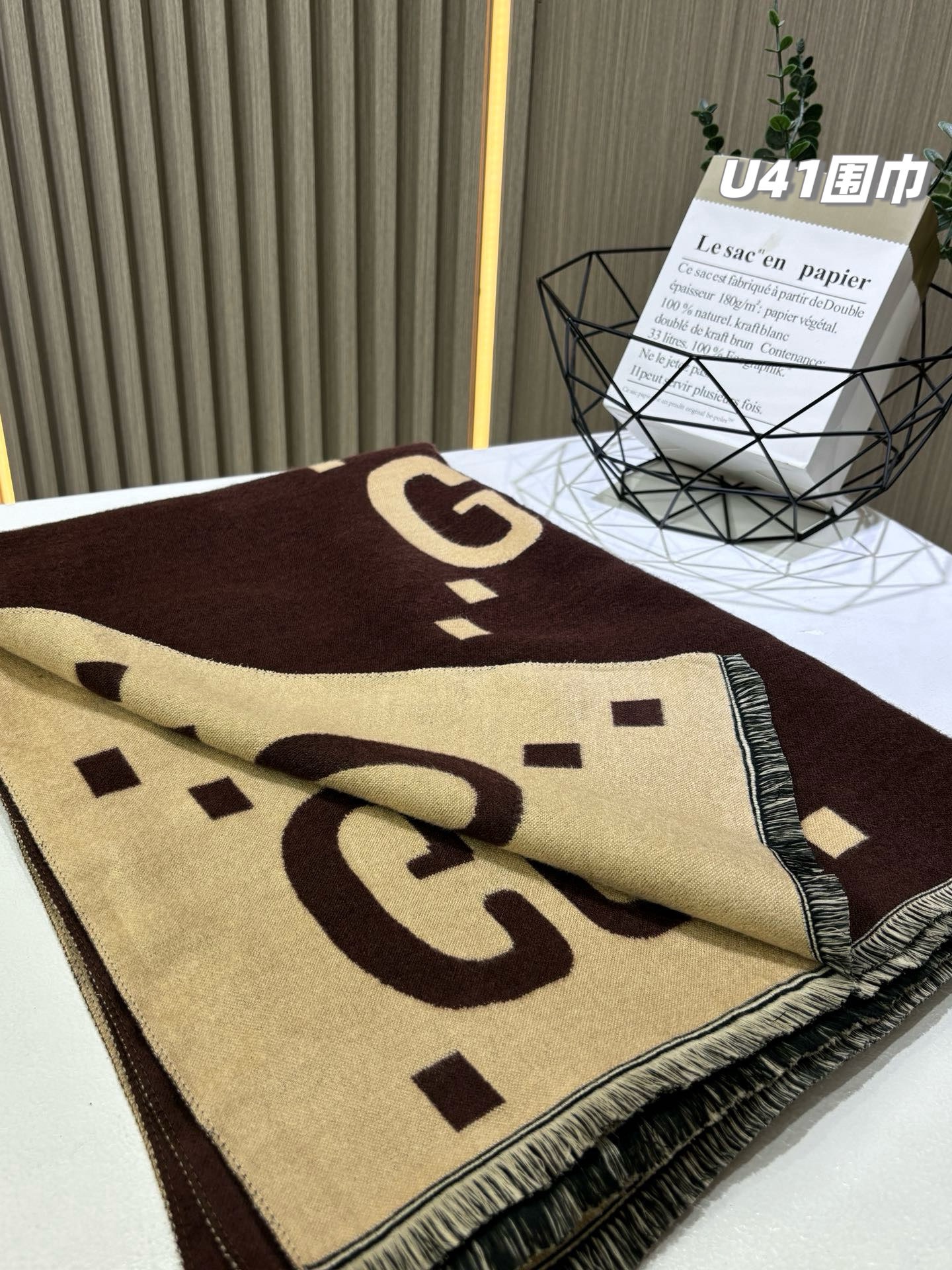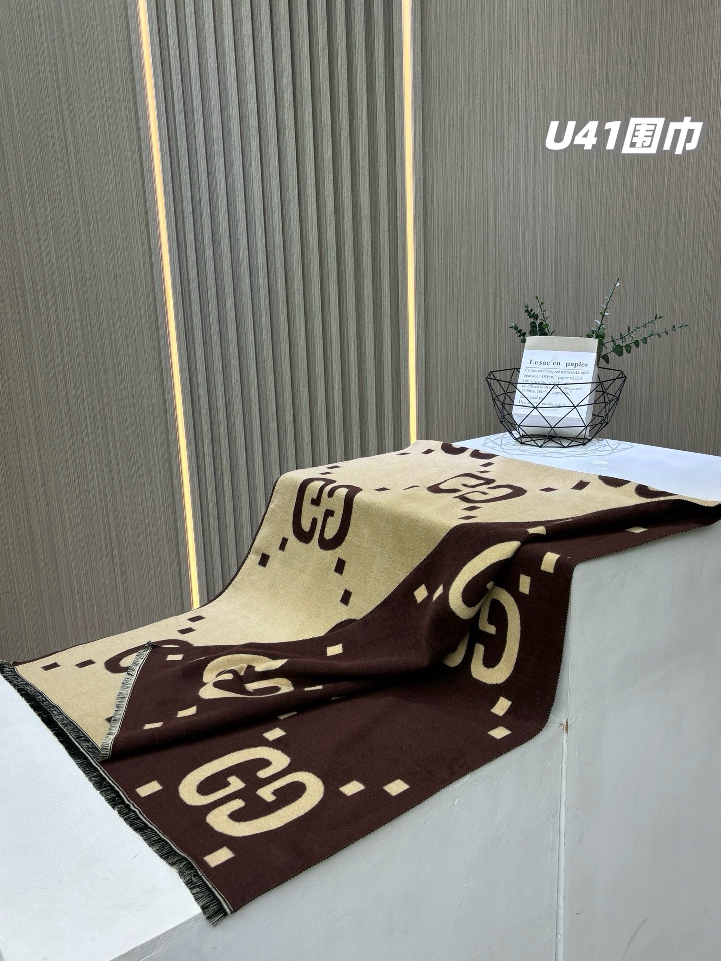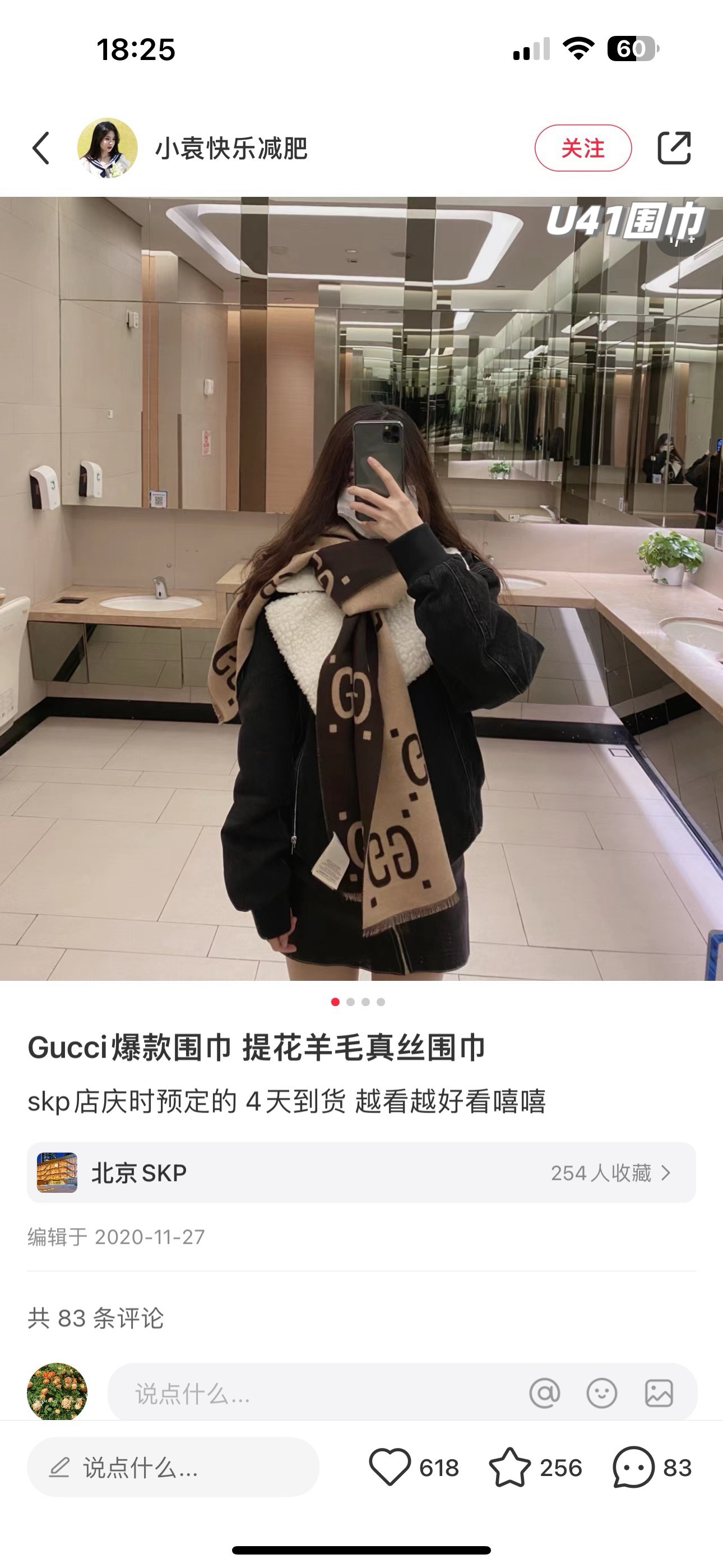 可做情侣款!穿哪件衣服都可以搭,稀罕到骨子里,GG标识作为G家颇具代表性的传统精髓,以饱含新意的现代方式推陈出新,呈现不同凡响的层次、面料手感好,有着羊毛的细腻柔糯感,又有堪比蚕丝的丝滑质感!显白!宽大的尺寸,除了当做围巾,还可以做室内披肩~方便,这几天气温下降,我出门直接当头巾连脖子围上,保暖!