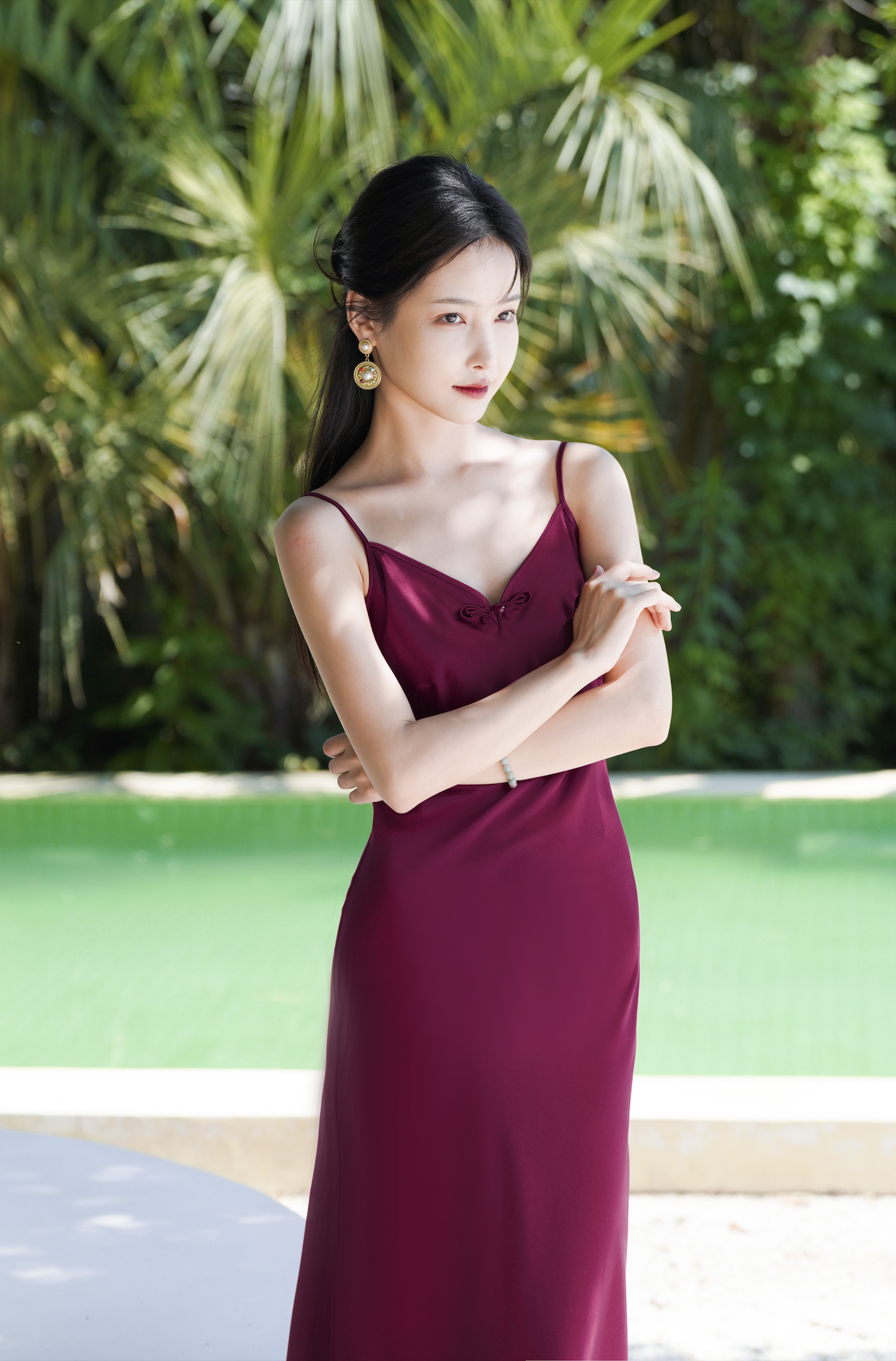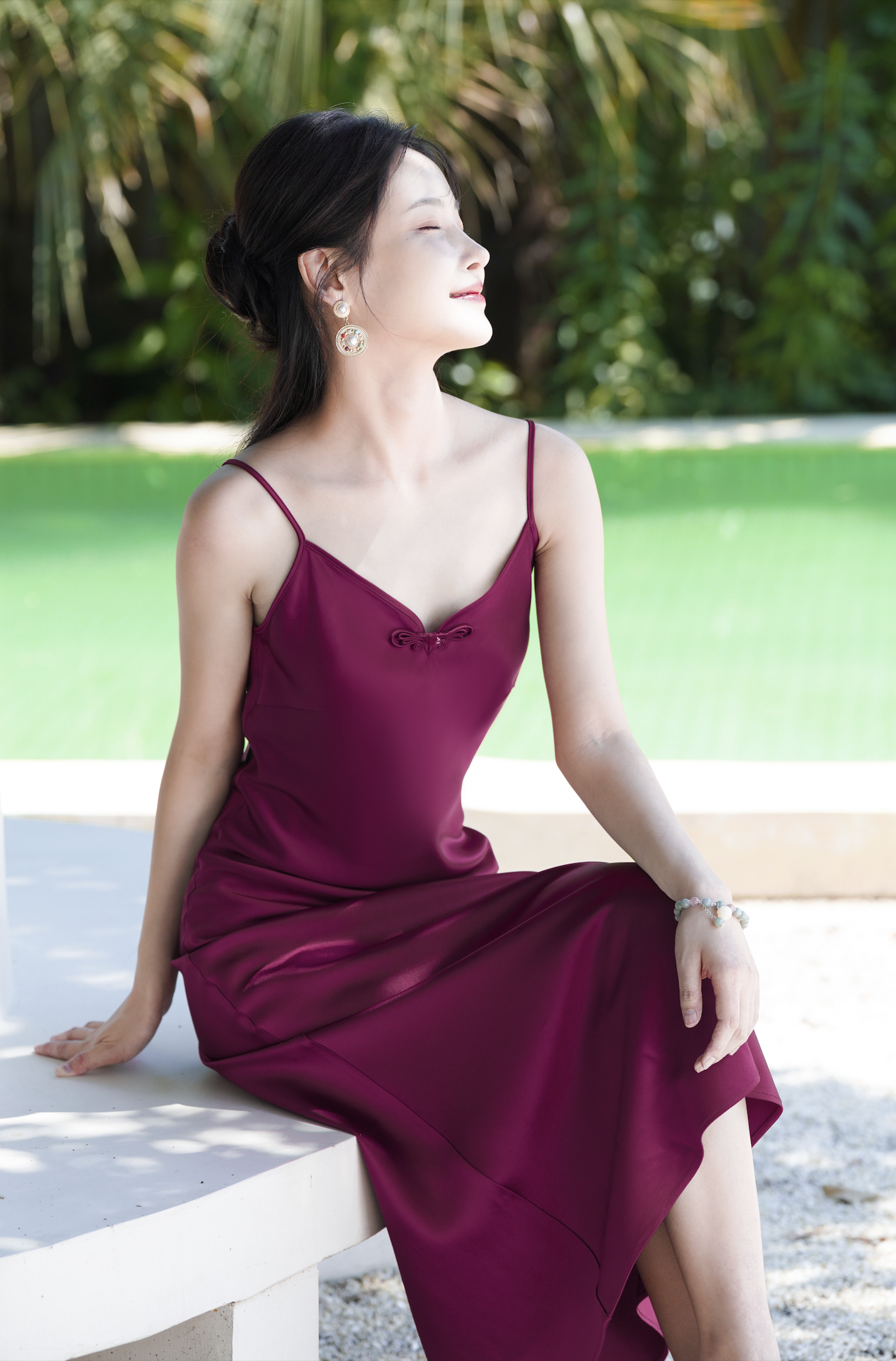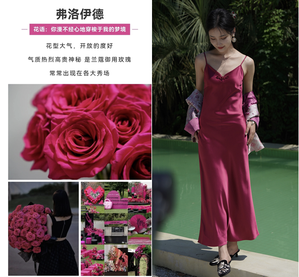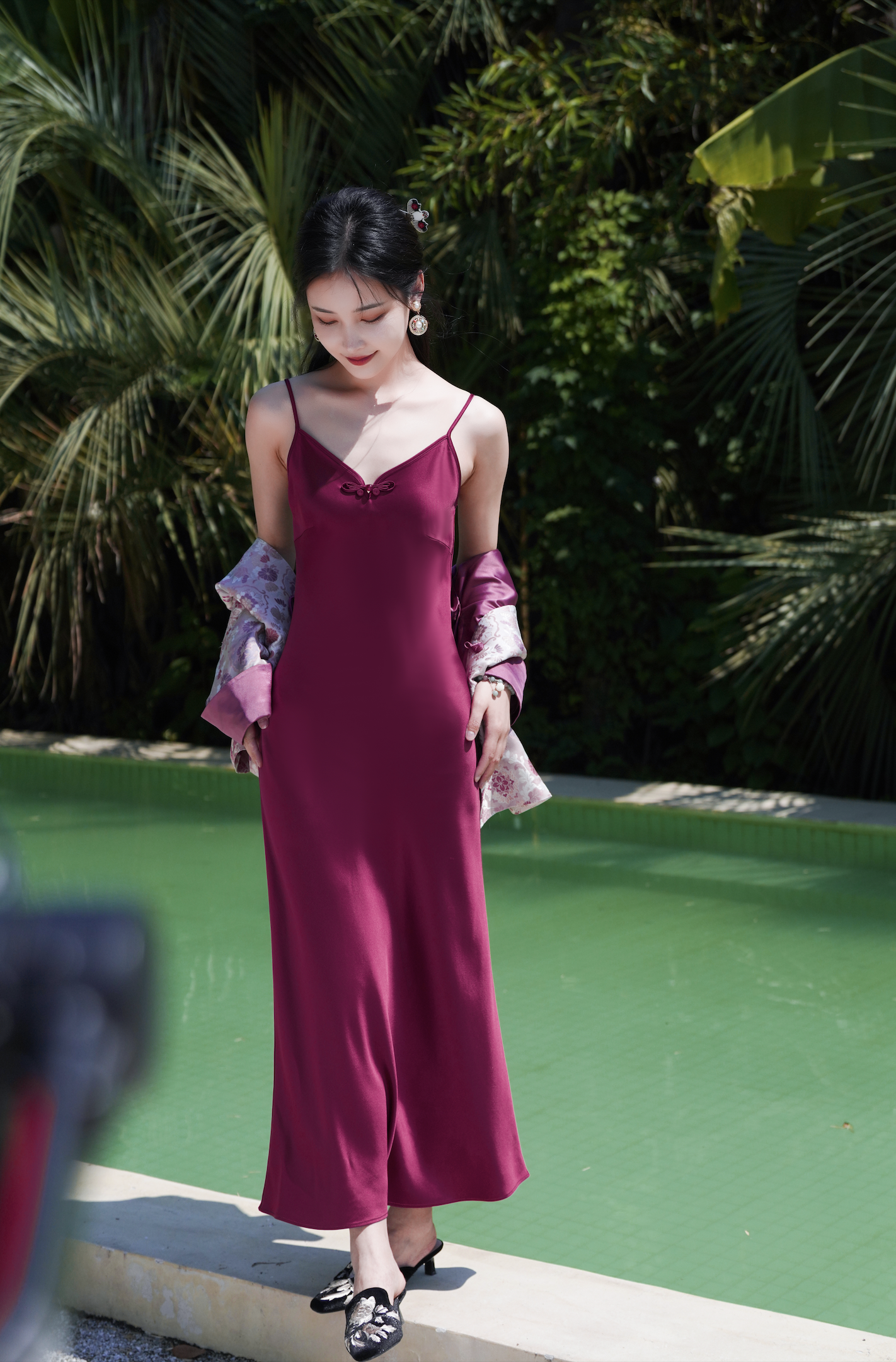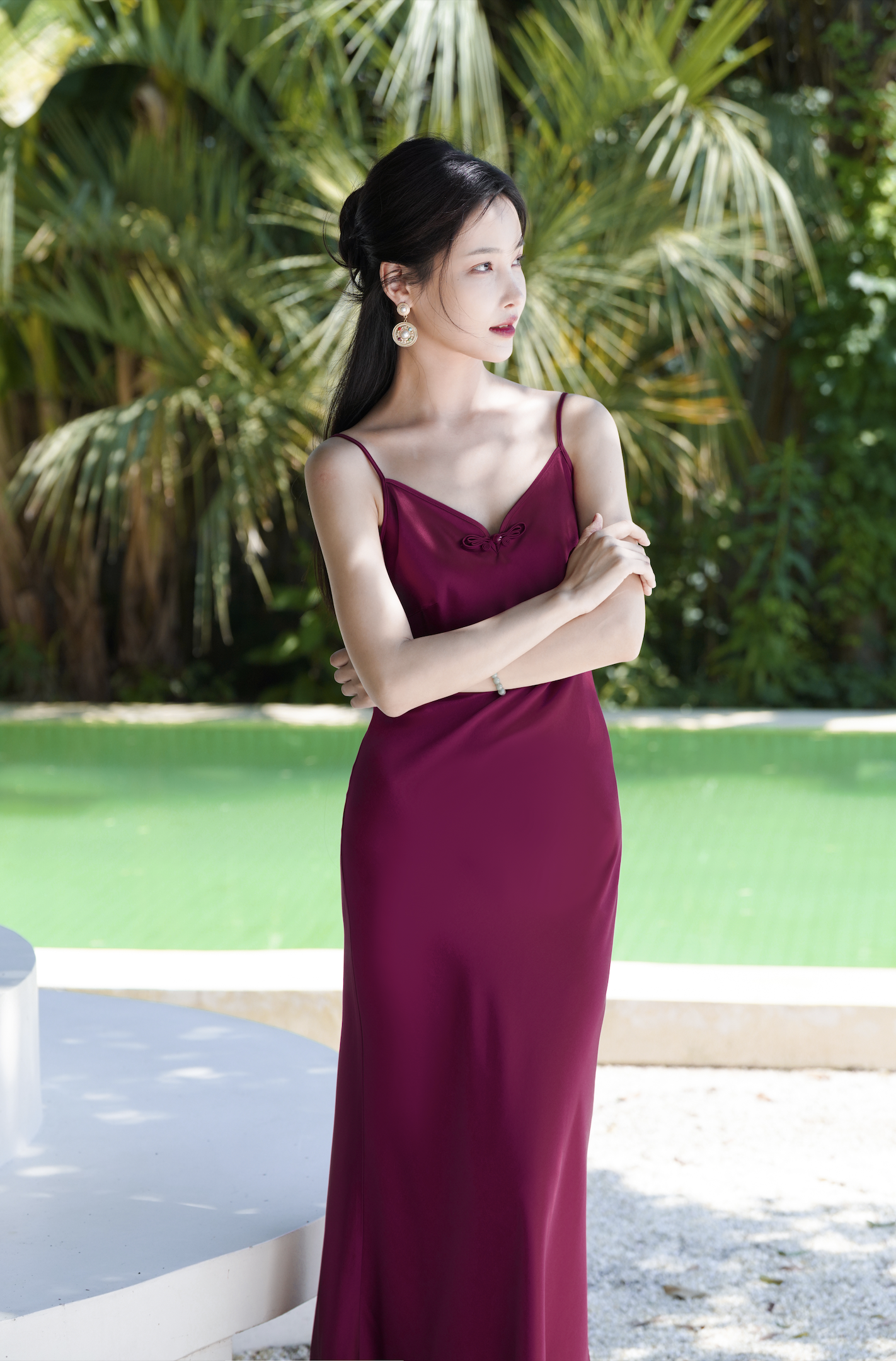 #“小蛮腰”玫红色醋酸吊带长裙「兰蔻」