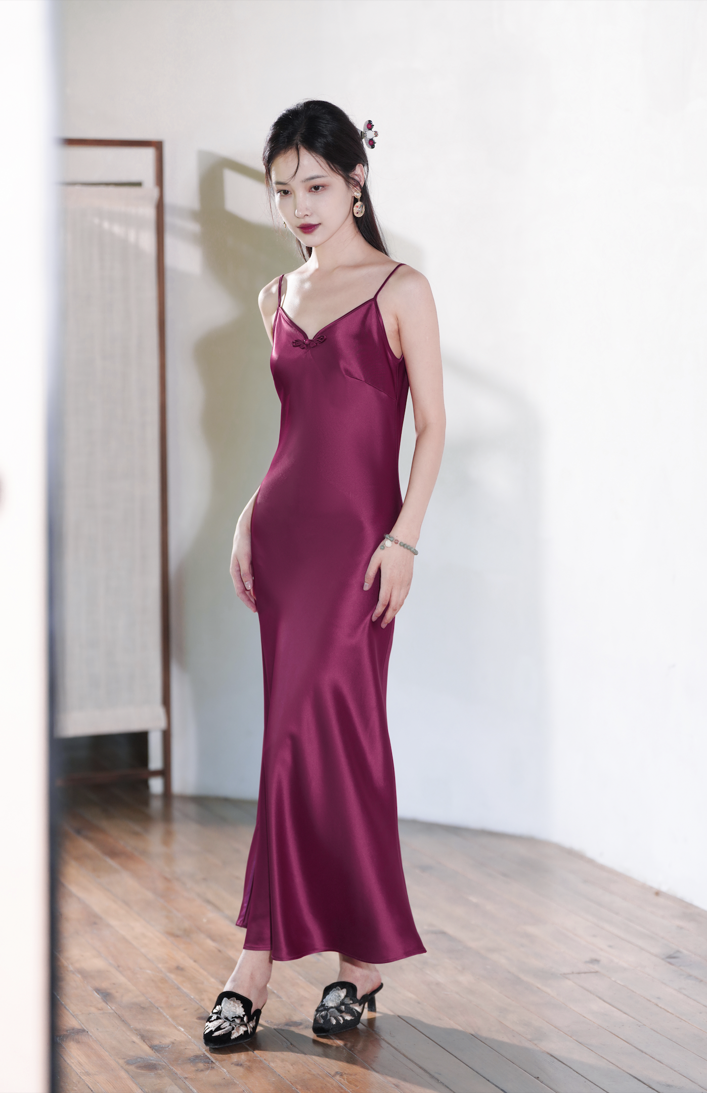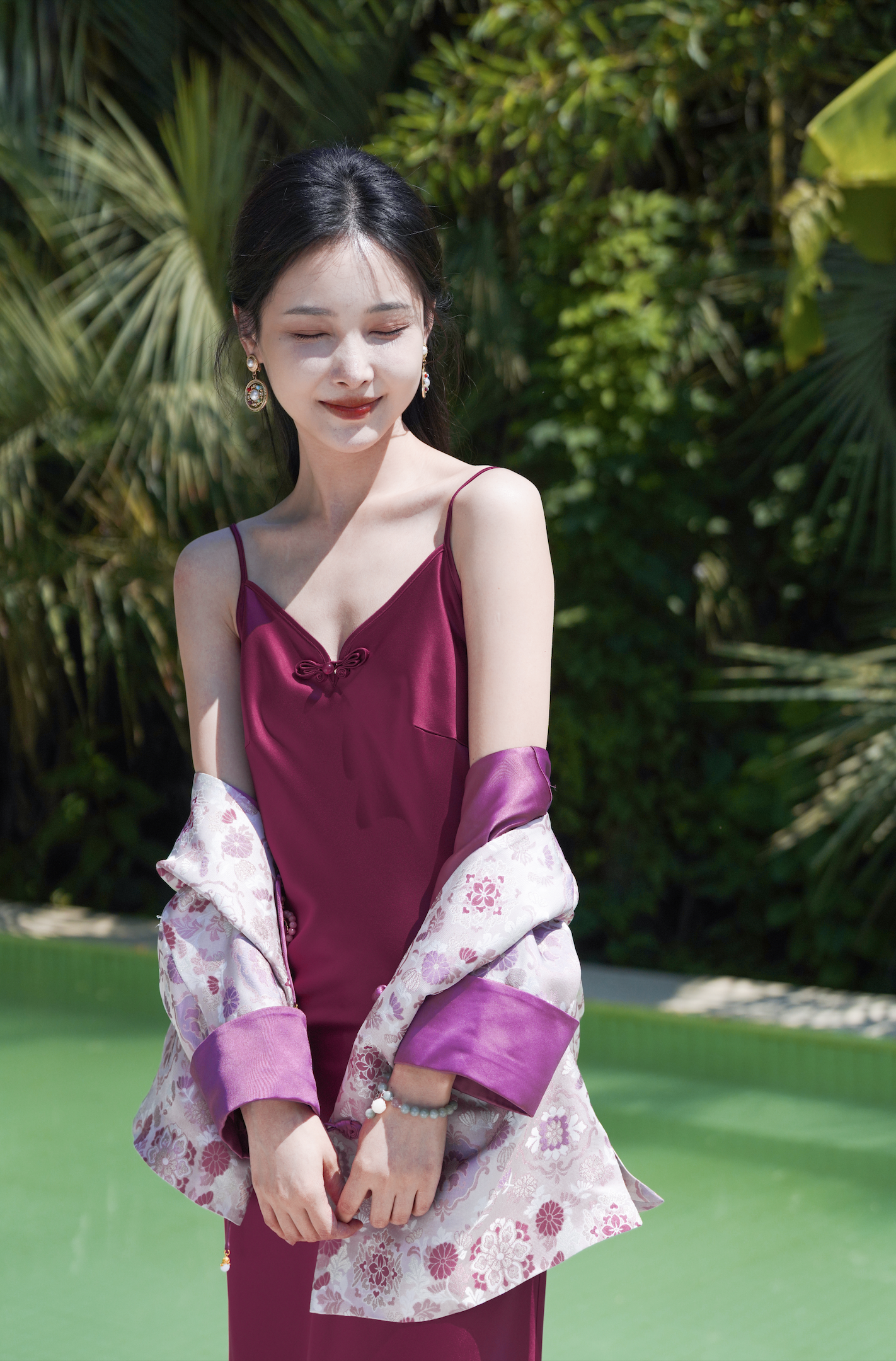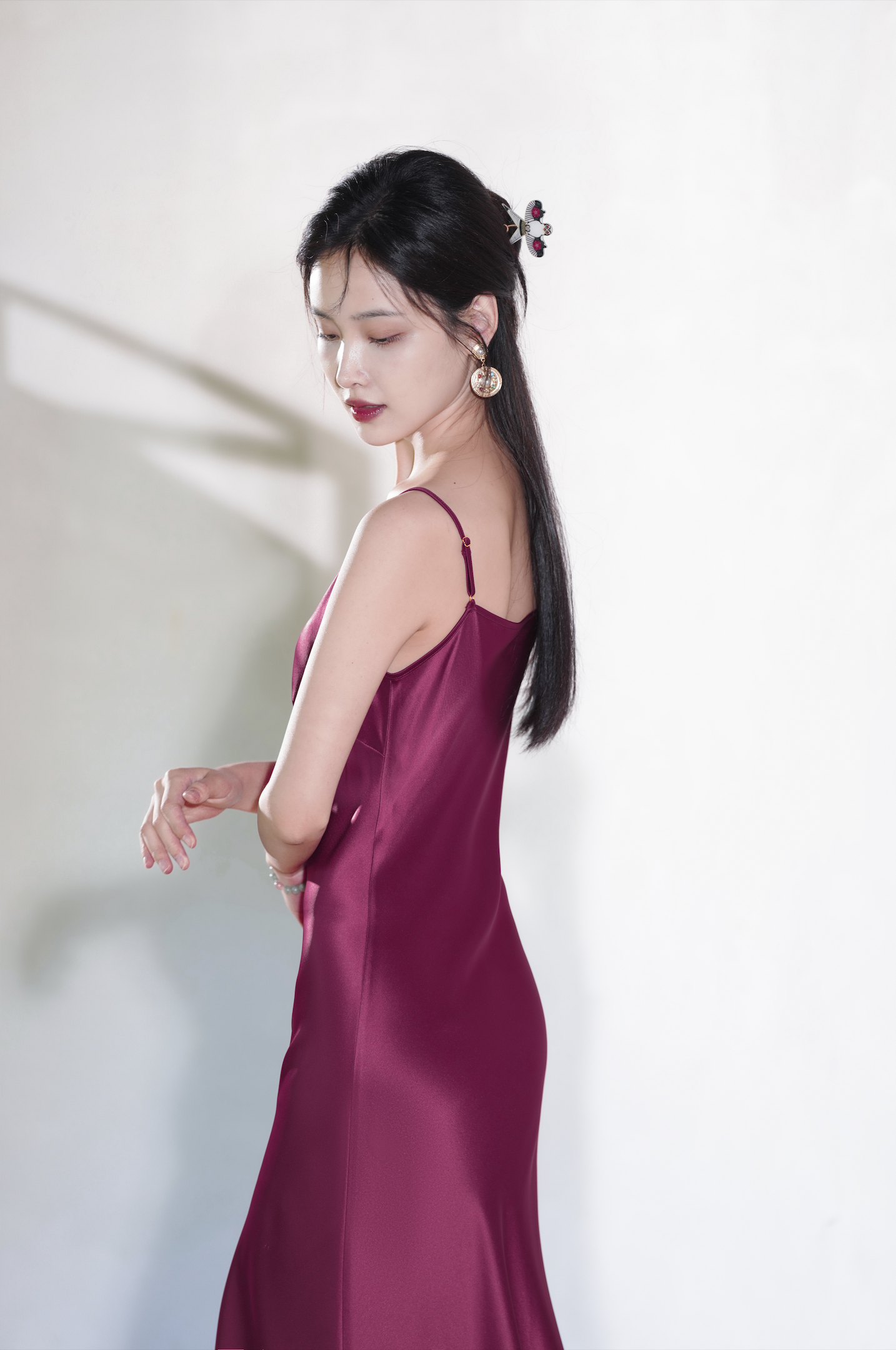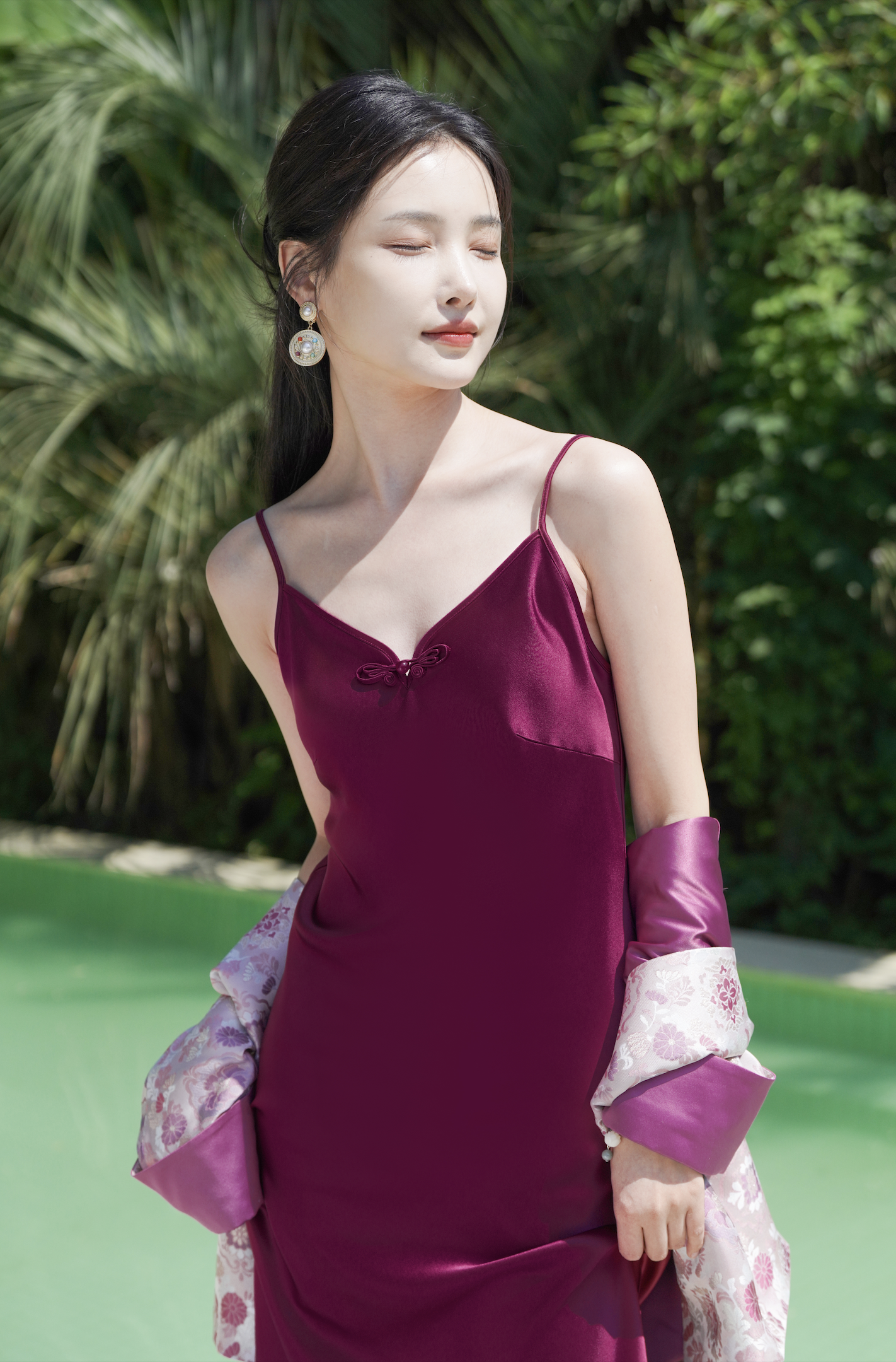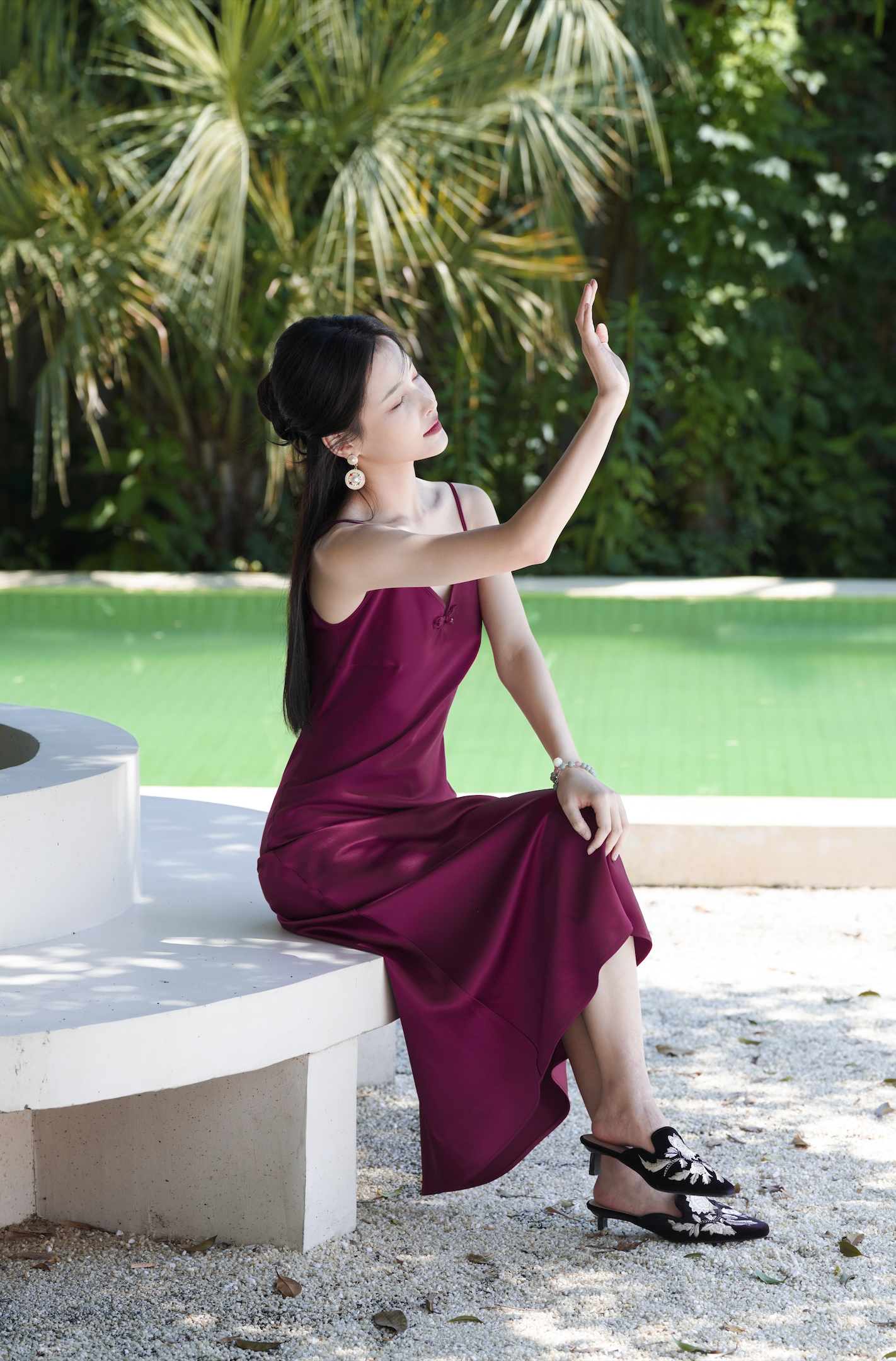 #“小蛮腰”玫红色醋酸吊带长裙「兰蔻」