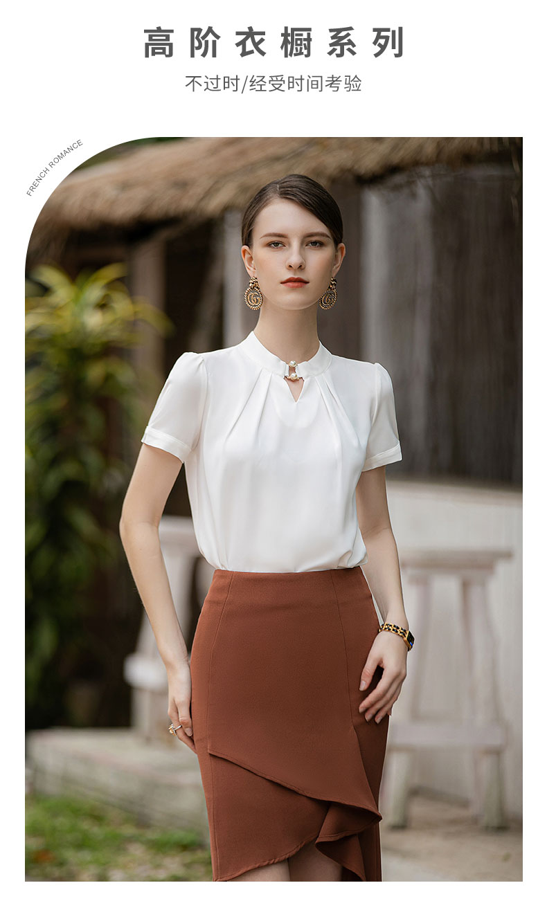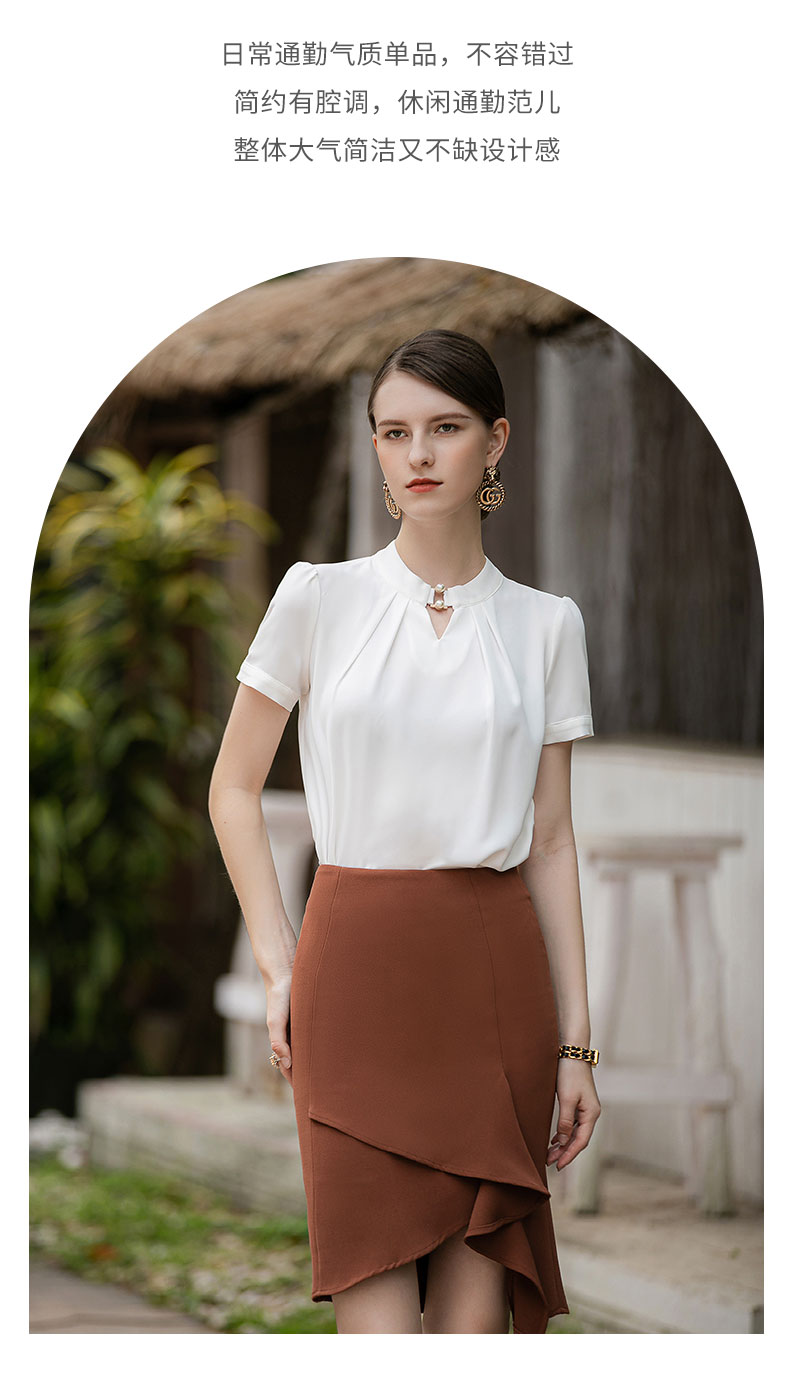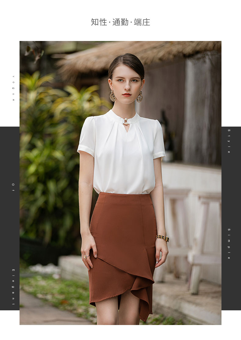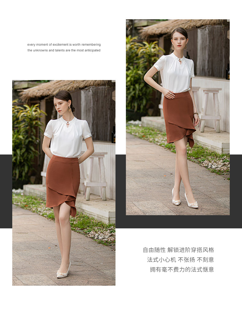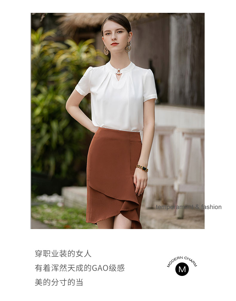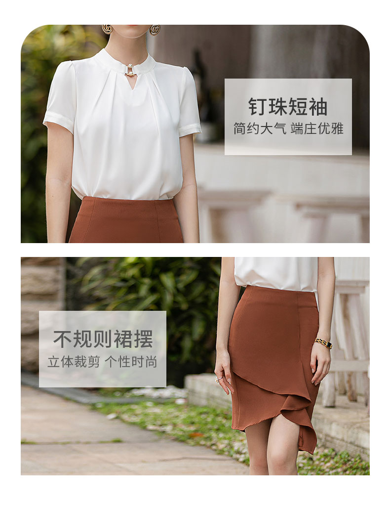 时尚气质两件套女高级感钉珠衬衫短袖上衣卡其色不规则显瘦包裙