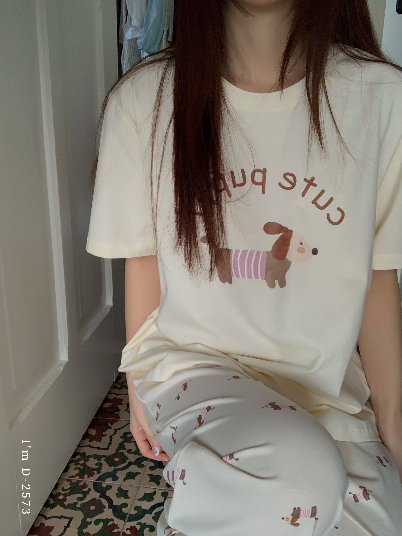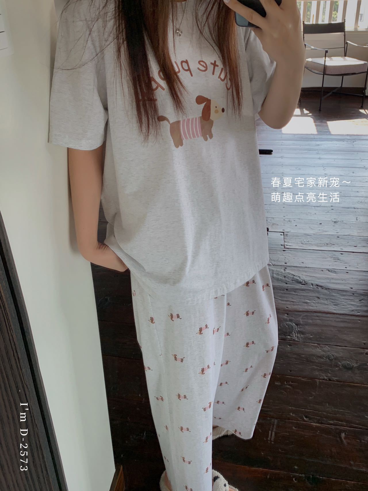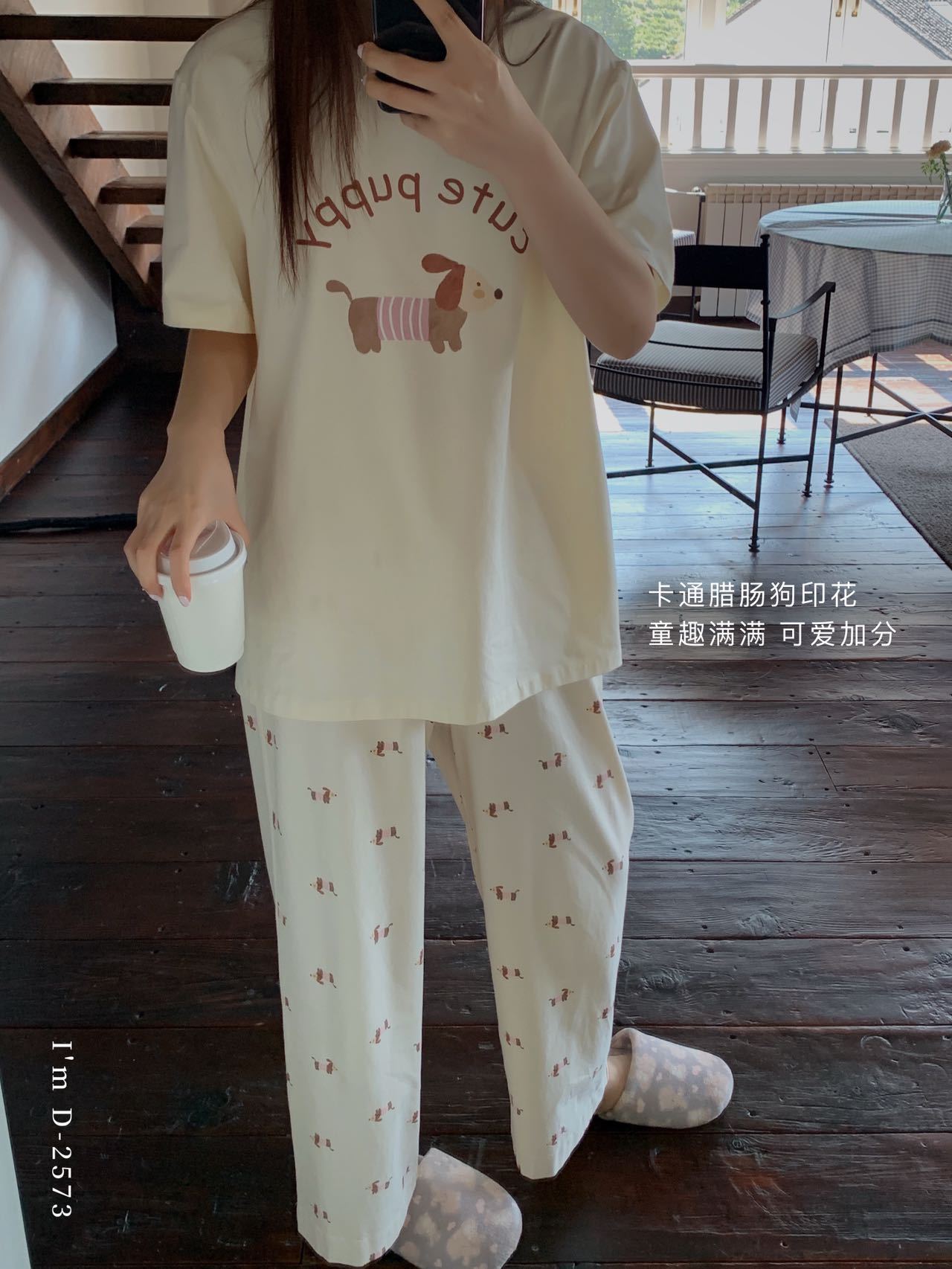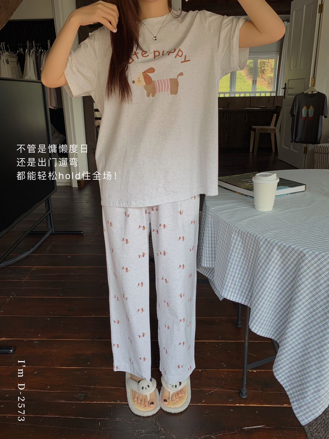 冰丝般细腻滑爽!春夏新款ins腊肠狗印花冰瓷懒宅衣 宽松休闲圆领家居服短袖长裤套装